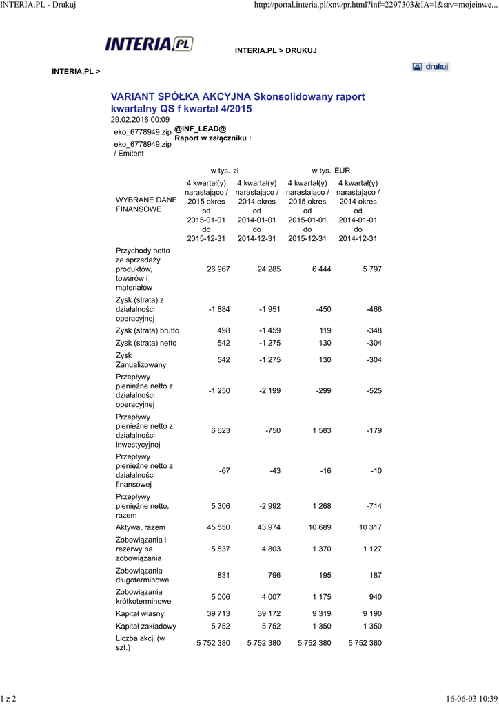 INTERIA.PL - Drukuj http://portal.interia.pl/xnv/pr.html?inf=2297303&IA=I&srv=mojeinwe... INTERIA.PL > DRUKUJ INTERIA.PL > VARIANT SPÓŁKA AKCYJNA Skonsolidowany raport kwartalny QS f kwartał 4/2015 29.02.2016 00:09 eko_6778949.zip @INF_LEAD@ Raport w załączniku : eko_6778949.zip / Emitent w tys. zł WYBRANE DANE FINANSOWE 4 kwartał(y) 4 kwartał(y) 4 kwartał(y) 4 kwartał(y) narastająco / narastająco / narastająco / narastająco / 2015 okres 2014 okres 2015 okres 2014 okres od od od od 2015-01-01 2014-01-01 2015-01-01 2014-01-01 do do do do 2015-12-31 2014-12-31 2015-12-31 2014-12-31 Przychody netto ze sprzedaży produktów, towarów i materiałów 26 967 24 285 6 444 5 797 Zysk (strata) z działalności operacyjnej -1 884 -1 951 -450 -466 Zysk (strata) brutto 498 -1 459 119 -348 Zysk (strata) netto 542 -1 275 130 -304 Zysk Zanualizowany 542 -1 275 130 -304 Przepływy pieniężne netto z działalności operacyjnej -1 250 -2 199 -299 -525 Przepływy pieniężne netto z działalności inwestycyjnej 6 623 -750 1 583 -179 Przepływy pieniężne netto z działalności finansowej -67 -43 -16 -10 Przepływy pieniężne netto, razem 5 306 -2 992 1 268 -714 Aktywa, razem 45 550 43 974 10 689 10 317 Zobowiązania i rezerwy na zobowiązania 5 837 4 803 1 370 1 127 Zobowiązania długoterminowe 831 796 195 187 Zobowiązania krótkoterminowe 5 006 4 007 1 175 940 39 713 39 172 9 319 9 190 5 752 5 752 1 350 1 350 5 752 380 5 752 380 5 752 380 5 752 380 Kapitał własny Kapitał zakładowy Liczba akcji (w szt.) 1z2 w tys. EUR 16-06-03 10:39 INTERIA.PL - Drukuj 2z2 http://portal.interia.pl/xnv/pr.html?inf=2297303&IA=I&srv=mojeinwe... Zysk (strata) na jedną akcję zwykłą (w PLN/ EUR) 0,09 -0,22 0,02 -0,05 Rozwodniony zysk (strata) na jedną akcję zwykłą (w PLN/EUR) 0,09 -0,22 0,02 -0,05 Wartość księgowa na jedną akcję (w PLN/EUR) 6,90 6,81 1,62 1,60 Rozwodniona wartość księgowa na jedną akcję (w PLN/EUR) 6,90 6,81 1,62 1,60 Zadeklarowana lub wypłacona dywidenda na jedną akcję (w PLN/EUR) 0,00 0,00 0,00 0,00 Wybrane dane finansowe ze skonsolidowanego bilansu (skonsolidowanego sprawozdania z sytuacji finansowej) prezentuje się na koniec bieżącego kwartału i koniec poprzedniego roku obrotowego, co należy odpowiednio opisać. Raport powinien zostać przekazany Komisji Nadzoru Finansowego, spółce prowadzącej rynek regulowany oraz do publicznej wiadomości za pośrednictwem agencji informacyjnej zgodnie z przepisami prawa. Emitent 16-06-03 10:39