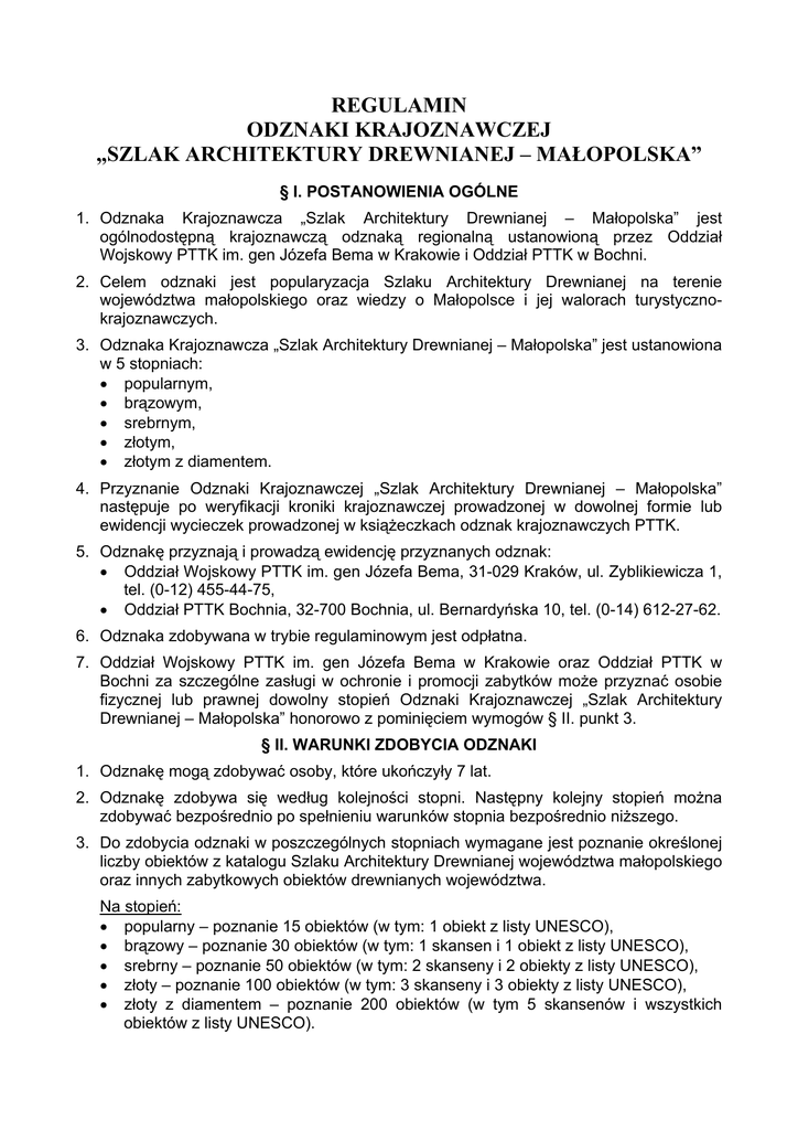 REGULAMIN ODZNAKI KRAJOZNAWCZEJ „SZLAK ARCHITEKTURY DREWNIANEJ – MAŁOPOLSKA” § I. POSTANOWIENIA OGÓLNE 1. Odznaka Krajoznawcza „Szlak Architektury Drewnianej – Małopolska” jest ogólnodostępną krajoznawczą odznaką regionalną ustanowioną przez Oddział Wojskowy PTTK im. gen Józefa Bema w Krakowie i Oddział PTTK w Bochni. 2. Celem odznaki jest popularyzacja Szlaku Architektury Drewnianej na terenie województwa małopolskiego oraz wiedzy o Małopolsce i jej walorach turystycznokrajoznawczych. 3. Odznaka Krajoznawcza „Szlak Architektury Drewnianej – Małopolska” jest ustanowiona w 5 stopniach: • popularnym, • brązowym, • srebrnym, • złotym, • złotym z diamentem. 4. Przyznanie Odznaki Krajoznawczej „Szlak Architektury Drewnianej – Małopolska” następuje po weryfikacji kroniki krajoznawczej prowadzonej w dowolnej formie lub ewidencji wycieczek prowadzonej w książeczkach odznak krajoznawczych PTTK. 5. Odznakę przyznają i prowadzą ewidencję przyznanych odznak: • Oddział Wojskowy PTTK im. gen Józefa Bema, 31-029 Kraków, ul. Zyblikiewicza 1, tel. (0-12) 455-44-75, • Oddział PTTK Bochnia, 32-700 Bochnia, ul. Bernardyńska 10, tel. (0-14) 612-27-62. 6. Odznaka zdobywana w trybie regulaminowym jest odpłatna. 7. Oddział Wojskowy PTTK im. gen Józefa Bema w Krakowie oraz Oddział PTTK w Bochni za szczególne zasługi w ochronie i promocji zabytków może przyznać osobie fizycznej lub prawnej dowolny stopień Odznaki Krajoznawczej „Szlak Architektury Drewnianej – Małopolska” honorowo z pominięciem wymogów § II. punkt 3. § II. WARUNKI ZDOBYCIA ODZNAKI 1. Odznakę mogą zdobywać osoby, które ukończyły 7 lat. 2. Odznakę zdobywa się według kolejności stopni. Następny kolejny stopień można zdobywać bezpośrednio po spełnieniu warunków stopnia bezpośrednio niższego. 3. Do zdobycia odznaki w poszczególnych stopniach wymagane jest poznanie określonej liczby obiektów z katalogu Szlaku Architektury Drewnianej województwa małopolskiego oraz innych zabytkowych obiektów drewnianych województwa. Na stopień: • popularny – poznanie 15 obiektów (w tym: 1 obiekt z listy UNESCO), • brązowy – poznanie 30 obiektów (w tym: 1 skansen i 1 obiekt z listy UNESCO), • srebrny – poznanie 50 obiektów (w tym: 2 skanseny i 2 obiekty z listy UNESCO), • złoty – poznanie 100 obiektów (w tym: 3 skanseny i 3 obiekty z listy UNESCO), • złoty z diamentem – poznanie 200 obiektów (w tym 5 skansenów i wszystkich obiektów z listy UNESCO). 4. Nadwyżka zaliczanych obiektów krajoznawczych zdobytych na jeden stopień odznaki przechodzi po weryfikacji na stopień wyższy. 5. Okres zdobywania poszczególnych stopni odznaki jest dowolny. 6. Odznaka może być zdobywana podczas indywidualnych wędrówek po województwie lub w czasie wycieczek, rajdów, zlotów i innych imprez organizowanych przez PTTK, zakłady pracy, szkoły, parafie, organizacje itp. 7. Odznaka może być zdobywana równocześnie z innymi odznakami krajoznawczymi i odznakami turystyki kwalifikowanej. 8. Potwierdzeniem pobytu lub zwiedzenia obiektu może być np: odcisk pieczątki z nazwą miejscowości lub obiektu, wklejony bilet wstępu, zdjęcie zdobywającego odznakę na tle obiektu itp. Na wycieczkach zbiorowych zwiedzenie obiektu mogą potwierdzić przewodnicy turystyczni i kadra programowa PTTK (przodownicy, instruktorzy) pod warunkiem, że biorą udział w wycieczce i zwiedzaniu obiektu. Potwierdzenia mogą też dokonywać instruktorzy krajoznawstwa na podstawie ustnego sprawozdania ubiegającego się o przyznanie odznaki (dotyczy tylko odznak w stopniu popularnym i brązowym). 9. Weryfikacji kronik dokonują wyznaczone przez poszczególne Oddziały zespoły weryfikacyjne. § III. POSTANOWIENIA KOŃCOWE 1. Obiekty architektury drewnianej zaliczane na stopnie: popularny, brązowy, srebrny, złoty można zaliczyć tylko jeden raz. 2. Ostateczna interpretacja niniejszego regulaminu należy do Zarządu Oddziału Wojskowego PTTK im. gen Józefa Bema w Krakowie oraz Zarządu Oddziału PTTK w Bochni. 3. Odznaka i regulamin jej przyznawania został wprowadzony uchwałą Zarządu Oddziału Wojskowego PTTK im. gen. Józefa Bema w Krakowie nr 82/42/08/2009 z dnia 14 sierpnia 2009 r. oraz uchwałą Zarządu Oddziału PTTK w Bochni nr 5/2009 z dnia 2 września 2009 r. 2