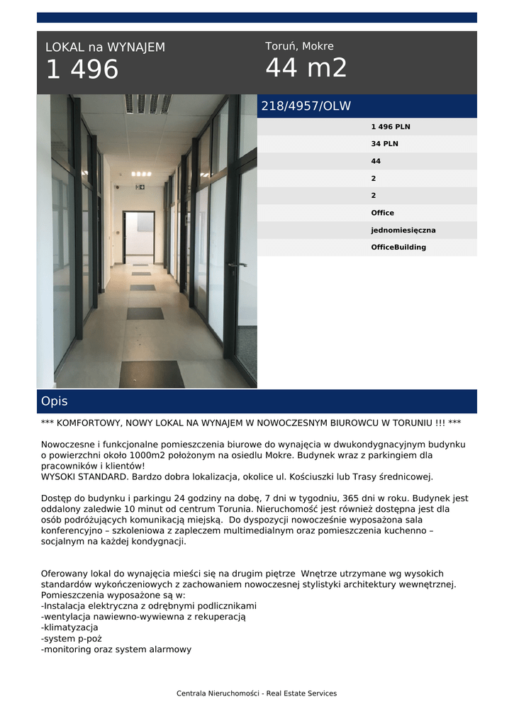 LOKAL na WYNAJEM 1 496 Toruń, Mokre 44 m2 218/4957/OLW 1 496 PLN 34 PLN 44 2 2 Office jednomiesięczna OfficeBuilding Opis *** KOMFORTOWY, NOWY LOKAL NA WYNAJEM W NOWOCZESNYM BIUROWCU W TORUNIU !!! *** Nowoczesne i funkcjonalne pomieszczenia biurowe do wynajęcia w dwukondygnacyjnym budynku o powierzchni około 1000m2 położonym na osiedlu Mokre. Budynek wraz z parkingiem dla pracowników i klientów! WYSOKI STANDARD. Bardzo dobra lokalizacja, okolice ul. Kościuszki lub Trasy średnicowej. Dostęp do budynku i parkingu 24 godziny na dobę, 7 dni w tygodniu, 365 dni w roku. Budynek jest oddalony zaledwie 10 minut od centrum Torunia. Nieruchomość jest również dostępna jest dla osób podróżujących komunikacją miejską. Do dyspozycji nowocześnie wyposażona sala konferencyjno – szkoleniowa z zapleczem multimedialnym oraz pomieszczenia kuchenno – socjalnym na każdej kondygnacji. Oferowany lokal do wynajęcia mieści się na drugim piętrze Wnętrze utrzymane wg wysokich standardów wykończeniowych z zachowaniem nowoczesnej stylistyki architektury wewnętrznej. Pomieszczenia wyposażone są w: -Instalacja elektryczna z odrębnymi podlicznikami -wentylacja nawiewno-wywiewna z rekuperacją -klimatyzacja -system p-poż -monitoring oraz system alarmowy Centrala Nieruchomości - Real Estate Services -internet -sufit podwieszany -winda Zostały ostatnie 3 lokale na wynajem o pow. 45,50m2, 68m2, 30m2, na drugim piętrze. istnieje możliwość wynajęcia pomieszczeń gospodarczych/socjalnych/składzików w niższej cenie razem z biurem. Minimalny okres wynajmu wynosi 12 miesięcy. Istnieje możliwość zapewnienia dodatkowo odpłatnej usługi serwisu sprzątania pomieszczeń. Koszt najmu: -wynajem powierzchni: 34,00 netto/m2 (na cenę najmu składa się dostęp do wspólnej toalety, kuchni) -koszty eksploatacyjne: 6,00 zł netto/m2 (wywóz śmieci, woda, wentylacja, ubezpieczenie nieruchomości, sprzątanie części wspólnej, monitoring) -energia elektryczna oraz ogrzewanie (według wskazań licznika) Kaucja jednomiesięczna. Więcej informacji pod nr tel. 663 899 715 Centrala Nieruchomości: ZAPEWNIAMY BEZPŁATNE I PROFESJONALNE DORADZTWO ZARÓWNO W ZAKRESIE NIERUCHOMOŚCI JAK I POZYSKIWANIU POD NIE KREDYTÓW HIPOTECZNYCH Powyższe informacje zostały sporządzone na podstawie oświadczeń właścicieli i nie są ofertą w rozumieniu przepisów Kodeksu Cywilnego. Mają one jedynie charakter informacyjny. Większość naszych klientów pochodzi z polecenia - ZAUFAJ NAM I TY I NIE CZEKAJ, AŻ KTOŚ CIĘ WYPRZEDZI! Zadzwoń i umów się na prezentację ! Nr licencji pośrednika odpowiedzialnego za wykonanie umowy pośrednictwa 14260. zobacz inne nasze oferty na www.centralanieruchomosci.pl facebook.com/Centrala.N Karolina Rutkowska tel. (+48) 663 899 715 email: [email protected] Centrala Nieruchomości - Real Estate Services Powered by TCPDF (www.tcpdf.org)