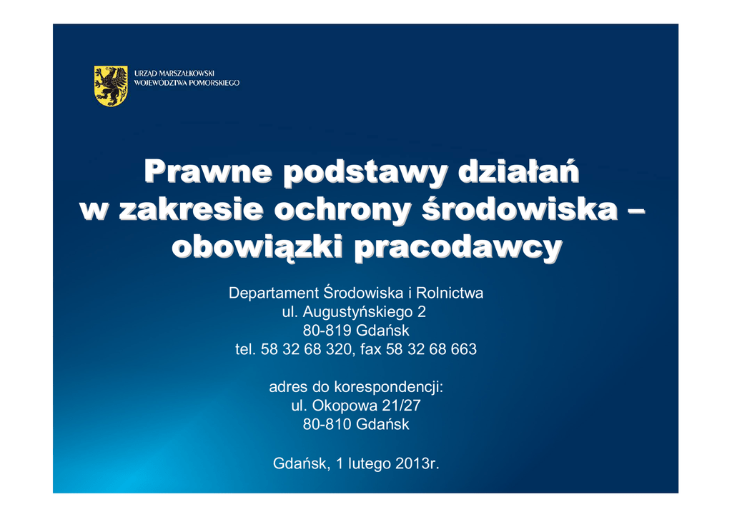 Prawne podstawy działań w zakresie ochrony środowiska – obowiązki pracodawcy Departament Środowiska i Rolnictwa ul. Augustyńskiego 2 80-819 Gdańsk tel. 58 32 68 320, fax 58 32 68 663 adres do korespondencji: ul. Okopowa 21/27 80-810 Gdańsk Gdańsk, 1 lutego 2013r. SPRAWOZDAWCZOŚĆ Marek Zawadzki Departament Środowiska i Rolnictwa 30 listopada 2012r. Gdańsk 2/21 Opłaty produktowe Podstawa prawna: Ustawa z dnia 11 maja 2001 r. o obowiązkach przedsiębiorców w zakresie gospodarowania niektórymi odpadami oraz o opłacie produktowej (tj. Dz.U. z 2007r. Nr 90, poz. 607 ze zm.) Obowiązkom wynikającym z ustawy podlega każdy przedsiębiorca wprowadzający - po raz pierwszy - na rynek krajowy produkty w opakowaniach oraz produkty takie jak: opony i oleje smarowe. Ma on obowiązek osiągnięcia pewnego poziomu odzysku i recyklingu odpadów opakowaniowych i poużytkowych. Jeśli tego nie zrobi, powinien złożyć sprawozdanie OŚ-OP1 do Urzędu Marszałkowskiego i uiścić opłatę produktową – do 31 marca roku kalendarzowego następującego po roku, którego opłata dotyczy. Wprowadzać na rynek krajowy produkty w opakowaniach można w dwojaki sposób: pakując produkty w opakowania i sprzedając je odbiorcom krajowym, sprowadzając do kraju z unii lub spoza niej produkty w opakowaniach, zamawiając wykonanie produktu i oznaczenie opakowania własnym logo, pakując produkty w placówce handlowej o powierzchni większej niż 500 m2 lub w sieci handlowej o powierzchni ponad 5000 m2, sprzedając wytworzone w kraju lub przywiezione z zagranicy opony lub oleje smarowe. Marek Zawadzki Departament Środowiska i Rolnictwa 1 lutego 2013r. Gdańsk 3/21 Opłaty produktowe cd. Przedsiębiorca rozpoczynający działalność polegającą na wytwarzaniu, przywozie z zagranicy (imporcie lub wewnątrzwspólnotowym nabyciu) produktów w opakowaniach lub produktów (opony i oleje smarowe) jest obowiązany bez wezwania złożyć zawiadomienie o tym fakcie marszałkowi województwa, w terminie 30 dni od dnia rozpoczęcia działalności. Obowiązek osiągania wymaganego poziomu odzysku i recyklingu może być realizowany przez przedsiębiorcę: samodzielnie, za pośrednictwem organizacji odzysku, Jeśli przedsiębiorca nie osiągnie wymaganych poziomów odzysku i recyklingu, to musi obliczyć i wnieść należną opłatę produktową. W razie nie wniesienia należnej opłaty produktowej: marszałek województwa wydaje decyzję, w której określa wysokość zaległości z tytułu opłaty produktowej, w przypadku niewykonania tej decyzji, marszałek województwa ustala, w drodze decyzji, dodatkową opłatę produktową w wysokości odpowiadającej 50 % kwoty niewpłaconej opłaty produktowej. Marek Zawadzki Departament Środowiska i Rolnictwa 1 lutego 2013r. Gdańsk 4/21 Opłaty produktowe cd. Opłaty produktowej nie wnosi się, gdy kwota nie przekracza 50 zł, Zwolnienie z obowiązku wniesienia opłaty nie zwalnia z obowiązku złożenia sprawozdania!!!, Termin złożenia sprawozdania i wniesienia należnej opłaty produktowej – 31 marca roku następnego, po roku którego dotyczy sprawozdanie, Opłata produktowa to suma opłat za niedokonany recykling odpadów opakowaniowych: z papieru i tektury, z tworzyw sztucznych, ze szkła gospodarczego, ze stali, z aluminium, z drewna, oraz opłaty za niedokonany odzysk opakowań razem i opłat za niedokonany odzysk i niedokonany recykling odpadów poużytkowych, czyli opon i olejów smarowych. Marek Zawadzki Departament Środowiska i Rolnictwa 1 lutego 2013r. Gdańsk 5/21 Opłaty produktowe cd. Akty wykonawcze pomocne w sporządzeniu sprawozdania Wzór dokumentu rocznego sprawozdania (OŚ-OP1) o wysokości należnej opłaty produktowej za rok 2011 – Rozporządzenie Ministra Środowiska z dnia 29 grudnia 2010r. (Dz.U. z 2010r. Nr 259, poz. 1775), Poziomy odzysku i recyklingu - Rozporządzenie Ministra Środowiska z dnia 14 czerwca 2007r. w sprawie rocznych poziomów odzysku i recyklingu odpadów opakowaniowych i poużytkowych (Dz.U. z 2007r. Nr 109, poz. 752). Stawki - Rozporządzenie Ministra Środowiska z dnia 29 grudnia 2010r. w sprawie szczegółowych stawek opłat produktowych (Dz.U. z 2010r. Nr 259, poz. 1774). Pamiętać należy, że tylko posiadanie Dokumentu potwierdzającego recykling i Dokumentu potwierdzającego odzysk, uprawnia do podania – w sprawozdaniu OŚ-OP1, że podmiot poddał odzyskowi i / lub recyklingowi jakieś odpady opakowaniowe i poużytkowe (opony, oleje smarowe). Wzór dokumentów DPO i DPR - Rozporządzenie Ministra Środowiska z dnia 19 grudnia 2006r. w sprawie dokumentów potwierdzających odrębnie odzysk i odrębnie recykling (Dz.U. z 2006r. Nr 247 poz. 1816). Marek Zawadzki Departament Środowiska i Rolnictwa 1 lutego 2013r. Gdańsk 6/21 Wytwarzanie, import i eksport opakowań oraz produktów w opakowaniach Podstawa prawna: Ustawa z dnia 11 maja 2001 r. o opakowaniach i odpadach opakowaniowych (Dz.U. z 2001 r. Nr 63, poz. 638 z późn. zm.). Producent i importer opakowań powinni ograniczać ilość i negatywne oddziaływanie na środowisko substancji stosowanych do produkcji opakowań oraz wytwarzanych odpadów opakowaniowych. Producent i importer środków niebezpiecznych są obowiązani ustalić wysokość kaucji na opakowania jednostkowe tych środków nie niższą niż 10% i nie wyższą niż 30% ceny środka niebezpiecznego zawartego w tym opakowaniu. Producent, importer, eksporter opakowań i eksporter produktów w opakowaniach, są obowiązani do składania właściwemu marszałkowi województwa rocznego sprawozdania o masie wytworzonych, przywiezionych z zagranicy oraz wywiezionych za granicę opakowań i produktów w opakowaniach. Marek Zawadzki Departament Środowiska i Rolnictwa 1 lutego 2013r. Gdańsk 7/21 Wytwarzanie, import i eksport opakowań oraz produktów w opakowaniach Rodzaje sprawozdań: Wytwórca opakowań – sprawozdanie OPAK-1, Importer pustych opakowań - sprawozdanie OPAK-2, Eksporter opako