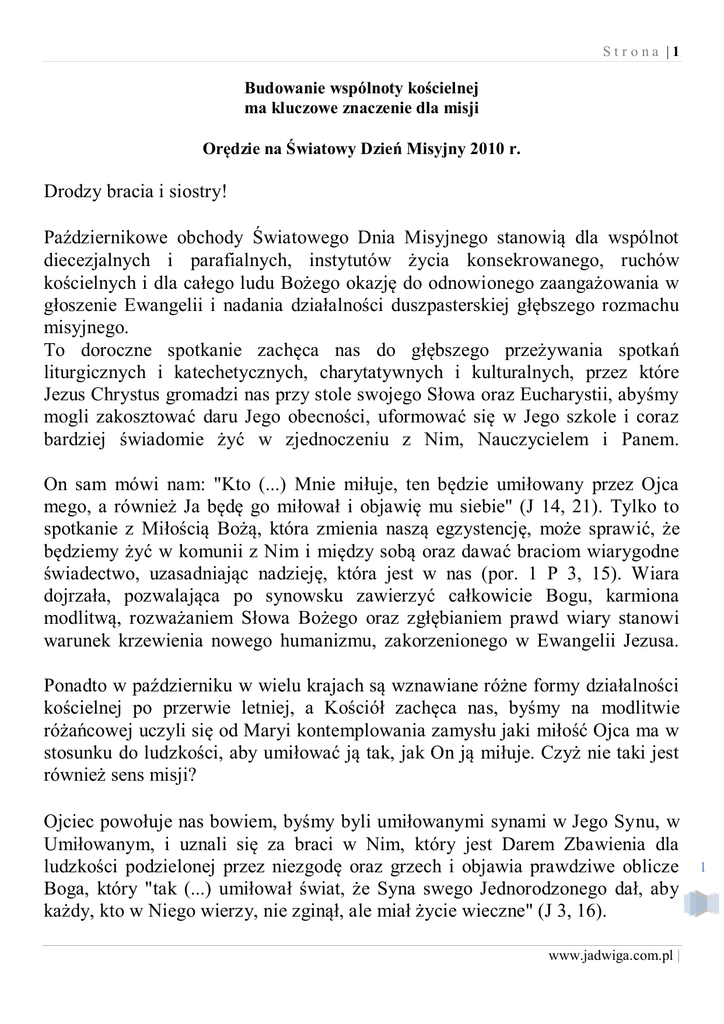 Strona |1 Budowanie wspólnoty kościelnej ma kluczowe znaczenie dla misji Orędzie na Światowy Dzień Misyjny 2010 r. Drodzy bracia i siostry! Październikowe obchody Światowego Dnia Misyjnego stanowią dla wspólnot diecezjalnych i parafialnych, instytutów życia konsekrowanego, ruchów kościelnych i dla całego ludu Bożego okazję do odnowionego zaangażowania w głoszenie Ewangelii i nadania działalności duszpasterskiej głębszego rozmachu misyjnego. To doroczne spotkanie zachęca nas do głębszego przeżywania spotkań liturgicznych i katechetycznych, charytatywnych i kulturalnych, przez które Jezus Chrystus gromadzi nas przy stole swojego Słowa oraz Eucharystii, abyśmy mogli zakosztować daru Jego obecności, uformować się w Jego szkole i coraz bardziej świadomie żyć w zjednoczeniu z Nim, Nauczycielem i Panem. On sam mówi nam: "Kto (...) Mnie miłuje, ten będzie umiłowany przez Ojca mego, a również Ja będę go miłował i objawię mu siebie" (J 14, 21). Tylko to spotkanie z Miłością Bożą, która zmienia naszą egzystencję, może sprawić, że będziemy żyć w komunii z Nim i między sobą oraz dawać braciom wiarygodne świadectwo, uzasadniając nadzieję, która jest w nas (por. 1 P 3, 15). Wiara dojrzała, pozwalająca po synowsku zawierzyć całkowicie Bogu, karmiona modlitwą, rozważaniem Słowa Bożego oraz zgłębianiem prawd wiary stanowi warunek krzewienia nowego humanizmu, zakorzenionego w Ewangelii Jezusa. Ponadto w październiku w wielu krajach są wznawiane różne formy działalności kościelnej po przerwie letniej, a Kościół zachęca nas, byśmy na modlitwie różańcowej uczyli się od Maryi kontemplowania zamysłu jaki miłość Ojca ma w stosunku do ludzkości, aby umiłować ją tak, jak On ją miłuje. Czyż nie taki jest również sens misji? Ojciec powołuje nas bowiem, byśmy byli umiłowanymi synami w Jego Synu, w Umiłowanym, i uznali się za braci w Nim, który jest Darem Zbawienia dla ludzkości podzielonej przez niezgodę oraz grzech i objawia prawdziwe oblicze Boga, który "tak (...) umiłował świat, że Syna swego Jednorodzonego dał, aby każdy, kto w Niego wierzy, nie zginął, ale miał życie wieczne" (J 3, 16). www.jadwiga.com.pl | 1 Strona |2 "Chcemy ujrzeć Jezusa" (J 12, 21) - z taką prośbą w Ewangelii św. Jana zwraca się do apostoła Filipa kilku Greków, którzy przybyli do Jerozolimy. Rozbrzmiewa ona również w naszych sercach w październiku, miesiącu, który przypomina nam, że obowiązek i zadanie głoszenia Ewangelii należy do całego Kościoła, "z natury swojej misyjnego" (Ad gentes, 2) i zachęca nas, byśmy propagowali nowość życia, na które składają się z autentyczne relacje, we wspólnotach budowanych na Ewangelii. W społeczeństwie wieloetnicznym, w którym szerzą się coraz bardziej niepokojące formy samotności i obojętności, chrześcijanie muszą zdobyć umiejętność dawania znaków nadziei i stawania się braćmi wszystkich, kultywując wielkie ideały zmieniające historię, a także - bez fałszywych iluzji bądź nieuzasadnionych lęków - winni starać się uczynić z naszej planety dom wszystkich narodów. Tak jak greccy pielgrzymi sprzed dwóch tysięcy lat, również ludzie w naszych czasach, choć nie zawsze świadomie, proszą wierzących nie tylko o to, by "mówili" o Jezusie, lecz by "ukazali" Jezusa, ukazali jaśniejące Oblicze Odkupiciela w każdym zakątku ziemi pokoleniom nowego tysiąclecia, zwłaszcza młodym na wszystkich kontynentach, którzy są uprzywilejowanymi adresatami i podmiotami ewangelicznego orędzia. Powinni oni odczuć, że chrześcijanie niosą słowo Chrystusa, ponieważ On jest Prawdą, ponieważ odnaleźli w Nim sens, prawdę swego życia. Podstawą powyższych rozważań jest misyjne zadanie, które otrzymali wszyscy ochrzczeni i cały Kościół, którego nie można jednak zrealizować w sposób wiarygodny bez głębokiego nawrócenia osobistego, wspólnotowego i pastoralnego. Świadomość powołania do głoszenia Ewangelii pobudza bowiem nie tylko każdego pojedynczego wiernego, ale wszystkie wspólnoty diecezjalne i parafialne do całkowitej odnowy i do coraz większego otwarcia się na współpracę misyjną między Kościołami, by orędzie Ewangelii dotarło do serca każdego człowieka, każdego ludu, kultury, rasy, narodowości, pod każdą szerokością geograficzną. Świadomość tę rozbudza działalność kapłanów fidei donum, osób konsekrowanych, katechistów, świeckich misjonarzy, którzy wciąż starają się umacniać komunię kościelną, tak aby "międzykulturowość" mogła znaleźć swoje miejsce w modelu jedności, w którym Ewangelia jest zaczynem wolności i postępu, źródłem braterstwa, pokory i pokoju (por. Ad gentes, 8). Kościół bowiem "jest w Chrystusie jakby sakramentem, czyli znakiem i narzędziem www.jadwiga.com.pl | 2 Strona |3 wewnętrznego zjednoczenia z Bogiem i jedności całego rodzaju ludzkiego" (Lumen gentium, 1). Komunia kościelna rodzi się ze spotkania z Synem Bożym, Jezusem Chrystusem, głoszonym przez Kościół, który w ten sposób dociera do ludzi i buduje jedność z sobą oraz z Ojcem i Duchem Świętym (por. 1 J 1, 3). Chrystus ustanawia nowe stosunki między człowiekiem i Bogiem. "On objawia nam, że Bóg jest miłością (1 J 4, 8), a równocześnie poucza nas, że podstawowym prawem doskonałości ludzkiej, a co za tym idzie przemiany świata, jest nowe przykazanie miłości. Tych więc, którzy wierzą w miłość Bożą, zapewnia, że przed wszystkimi ludźmi otwarta jest droga miłości i że próba stworzenia powszechnego braterstwa nie jest nadaremna" (Gaudium et spes, 38). Kościół staje się "komunią" w Eucharystii, w której Chrystus, obecny pod postaciami chleba i wina poprzez ofiarę miłości buduje Kościół jako swoje ciało, zaprowadzając jedność między nami i Trójjedynym Bogiem oraz między nami samymi (por. 1 K0, 16nn). W adhortacji Sacrament