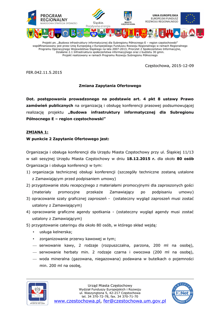 Projekt pn. „Budowa infrastruktury informatycznej dla Subregionu Północnego E – region częstochowski” współfinansowany jest przez Unię Europejską z Europejskiego Funduszu Rozwoju Regionalnego w ramach Regionalnego Programu Operacyjnego Województwa Śląskiego na lata 2007-2013, Priorytet 2 Społeczeństwo Informacyjne, Działanie 2.1 Infrastruktura społeczeństwa informacyjnego oraz z budżetu 30 gmin. Projekt realizowany w ramach Programu Rozwoju Subregionu Północnego Częstochowa, 2015-12-09 FER.042.11.5.2015 Zmiana Zapytania Ofertowego Dot. postępowania prowadzonego na podstawie art. 4 pkt 8 ustawy Prawo zamówień publicznych na organizacją i obsługę konferencji prasowej podsumowującej realizację projektu „Budowa infrastruktury informatycznej dla Subregionu Północnego E – region częstochowski” ZMIANA 1: W punkcie 2 Zapytanie Ofertowego jest: Organizacja i obsługa konferencji dla Urzędu Miasta Częstochowy przy ul. Śląskiej 11/13 w sali sesyjnej Urzędu Miasta Częstochowy w dniu 18.12.2015 r. dla około 80 osób Organizacja i obsługa konferencji w tym: 1) organizacja technicznej obsługi konferencji (szczegóły techniczne zostaną ustalone z Zamawiającym przed podpisaniem umowy) 2) przygotowanie stołu recepcyjnego z materiałami promocyjnymi dla zaproszonych gości (materiały promocyjne przekaże Zamawiający po podpisaniu umowy) 3) opracowanie szaty graficznej zaproszeń - (ostateczny wygląd zaproszeń musi zostać ustalony z Zamawiającym) 4) opracowanie graficzne agendy spotkania - (ostateczny wygląd agendy musi zostać ustalony z Zamawiającym) 5) przygotowanie cateringu dla około 80 osób, w którego skład wejdą: • usługa kelnerska; • zorganizowanie przerwy kawowej w tym; serwowanie kawy, 2 rodzaje (rozpuszczalna, parzona, 200 ml na osobę), serwowanie herbaty min. 2 rodzaje czarna i owocowa (200 ml na osobę), woda mineralna (gazowana, niegazowana) podawana w butelkach o pojemności min. 200 ml na osobę, Urząd Miasta Częstochowy Wydział Funduszy Europejskich i Rozwoju ul. Waszyngtona 5, 42-217 Częstochowa tel. 34 370-72-78, fax. 34 370-71-70 www.czestochowa.pl, [email protected] soki owocowe podawane w dzbankach min. 2 smaki (200 ml na osobę), kruche ciastka, mini pączki, mini rogaliki (30 g na osobę), ciasto domowe (min. 2 szt. na osobę), owoce sezonowe (min. 200 g na osobę), • przygotowanie bufetu z przekąskami zimnymi w tj: koreczki, kanapki typu tartinki min. 2 rodzaje na osobę; • dodatki: cukier w saszetkach, mleczko do kawy, cytryna w plastrach – adekwatnie do ilości podanej kawy i herbaty; • dostarczenie odpowiedniej ilości porcelany, szkła, sztućców (niedopuszczalne jest stosowanie naczyń i sztućców jednorazowego użytku.), serwetek i wszystkich pozostałych elementów wymaganych do prawidłowej realizacji usługi cateringu, jak • również wszystkie Ostatecznie uprzątnięcia dostarczone sprawy produkty sali powinny po zakończeniu być organizacyjne świeże i spotkania; najwyższej zostaną jakość ustalona z Zamawiającym po podpisaniu Umowy. W punkcie 2 Zapytanie Ofertowego powinno być: Organizacja i obsługa konferencji dla Urzędu Miasta Częstochowy przy ul. Śląskiej 11/13 w sali sesyjnej Urzędu Miasta Częstochowy w dniu 18.12.2015 r. dla około 120 osób Organizacja i obsługa konferencji w tym: 1) organizacja technicznej obsługi konferencji (szczegóły techniczne zostaną ustalone z Zamawiającym przed podpisaniem umowy) 2) przygotowanie stołu recepcyjnego z materiałami promocyjnymi dla zaproszonych gości (materiały promocyjne przekaże Zamawiający po podpisaniu umowy) 3) opracowanie szaty graficznej zaproszeń - bez druku (ostateczny wygląd zaproszeń musi zostać ustalony z Zamawiającym) 4) opracowanie graficzne agendy spotkania - bez druku (ostateczny wygląd agendy musi zostać ustalony z Zamawiającym) 5) przygotowanie cateringu dla około 120 osób, w którego skład wejdą: • usługa kelnerska; • zorganizowanie przerwy kawowej w tym; serwowanie kawy, 2 rodzaje (rozpuszczalna, parzona, 200 ml na osobę), Urząd Miasta Częstochowy Wydział Funduszy Europejskich i Rozwoju ul. Waszyngtona 5, 42-217 Częstochowa tel. 34 370-72-78, fax. 34 370-71-70 www.czestochowa.pl, [email protected] serwowanie herbaty min. 2 rodzaje czarna i owocowa (200 ml na osobę), woda mineralna (gazowana, niegazowana) podawana w butelkach o pojemności min. 200 ml na osobę, soki owocowe podawane w dzbankach min. 2 smaki (200 ml na osobę), kruche ciastka, mini pączki, mini rogaliki (30 g na osobę), ciasto domowe (min. 2 szt. na osobę), owoce sezonowe (min. 200 g na osobę), przygotowanie bufetu z przekąskami zimnymi w tj: koreczki, kanapki typu tartinki • min. 2 rodzaje na osobę; dodatki: cukier w saszetkach, mleczko do kawy, cytryna w plastrach – adekwatnie • do ilości podanej kawy i herbaty; dostarczenie odpowiedniej ilości porcelany, szkła, sztućców (niedopuszczalne jest • stosowanie naczyń i sztućców jednorazowego użytku.), serwetek i wszystkich pozostałych elementów wymaganych do prawidłowej realizacji usługi cateringu, jak • również uprzątnięcia sali po zakończeniu spotkania; wszystkie dostarczone produkty powinny być świeże i najwyższej jakości. Ostatecznie sprawy organizacyjne zostaną ustalona z Zamawiającym po podpisaniu Umowy. ZMIANA 2: W punkcie 5 Zapytania Ofertowego jest: Ofertę cenową należy złożyć do dnia 10.12.2015 r. do godziny 9:00 w formie: 1. papierowej na adres: Wydział Funduszy Europejskich i Rozwoju Urzędu Miasta Częstochowy, ul .Śląska 11/13, 42-217 Częstochowa, pok. nr: 406 2. elektronicznej na adres email; [email protected] lub [email protected] 3. fax-em: 34 37 07 196 Oferty powinny być umieszczone w zamkniętej kopercie z podanym adresem zwrotnym i dopiskiem: „Oferta na na organizacją i obsługą konferencji podsumowującej realizację projektu Budowa infrastruktury informatycznej dla Subregionu E 