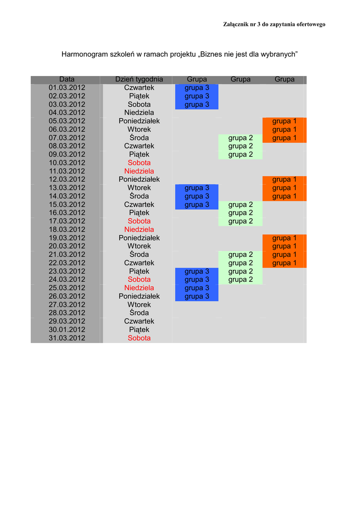 Załącznik nr 3 do zapytania ofertowego Harmonogram szkoleń w ramach projektu „Biznes nie jest dla wybranych” Data 01.03.2012 02.03.2012 03.03.2012 04.03.2012 05.03.2012 06.03.2012 07.03.2012 08.03.2012 09.03.2012 10.03.2012 11.03.2012 12.03.2012 13.03.2012 14.03.2012 15.03.2012 16.03.2012 17.03.2012 18.03.2012 19.03.2012 20.03.2012 21.03.2012 22.03.2012 23.03.2012 24.03.2012 25.03.2012 26.03.2012 27.03.2012 28.03.2012 29.03.2012 30.01.2012 31.03.2012 Dzień tygodnia Czwartek Piątek Sobota Niedziela Poniedziałek Wtorek Środa Czwartek Piątek Sobota Niedziela Poniedziałek Wtorek Środa Czwartek Piątek Sobota Niedziela Poniedziałek Wtorek Środa Czwartek Piątek Sobota Niedziela Poniedziałek Wtorek Środa Czwartek Piątek Sobota Grupa grupa 3 grupa 3 grupa 3 Grupa grupa 2 grupa 2 grupa 2 grupa 3 grupa 3 grupa 3 grupa 3 grupa 3 grupa 3 grupa 3 grupa 2 grupa 2 grupa 2 grupa 2 grupa 2 grupa 2 grupa 2 Grupa grupa 1 grupa 1 grupa 1 grupa 1 grupa 1 grupa 1 grupa 1 grupa 1 grupa 1 grupa 1