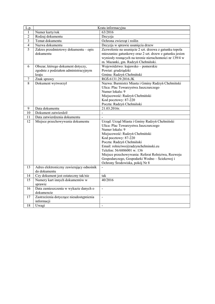 L.p. Krata informacyjna 1 Numer karty/rok 63/2016 2 Rodzaj