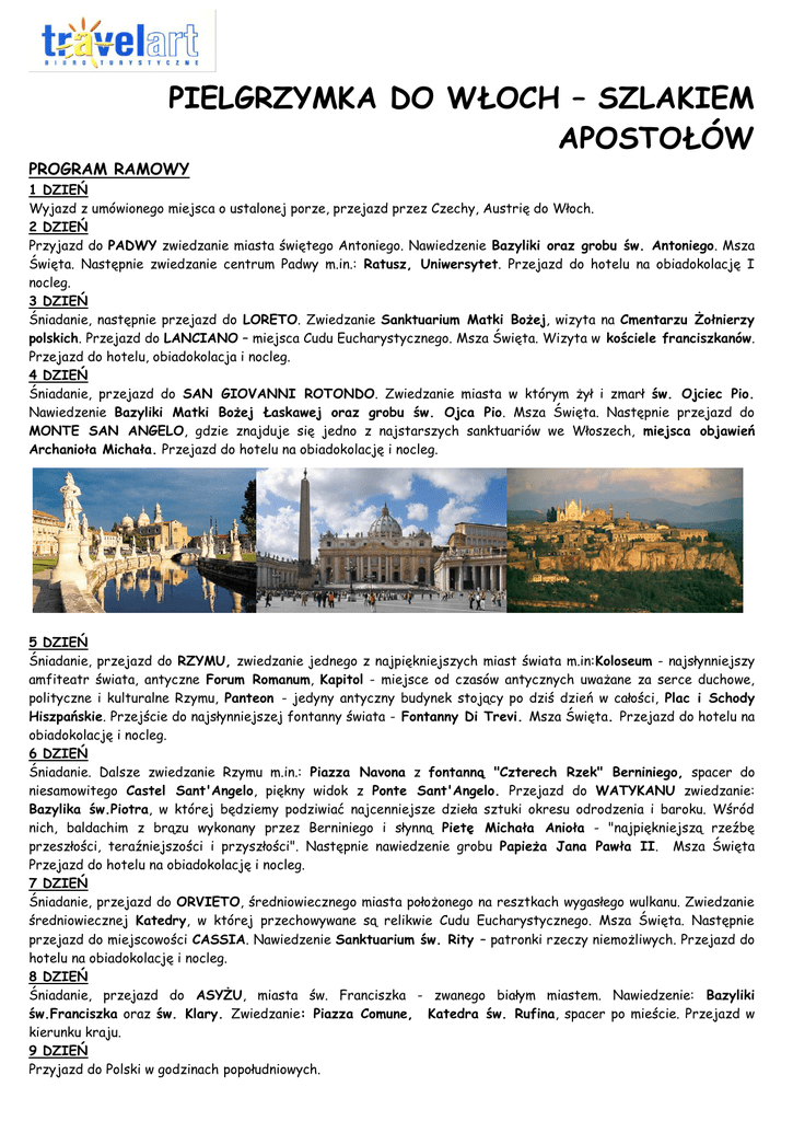 PIELGRZYMKA DO WŁOCH – SZLAKIEM APOSTOŁÓW PROGRAM RAMOWY 1 DZIEŃ Wyjazd z umówionego miejsca o ustalonej porze, przejazd przez Czechy, Austrię do Włoch. 2 DZIEŃ Przyjazd do PADWY zwiedzanie miasta świętego Antoniego. Nawiedzenie Bazyliki oraz grobu św. Antoniego. Msza Święta. Następnie zwiedzanie centrum Padwy m.in.: Ratusz, Uniwersytet. Przejazd do hotelu na obiadokolację I nocleg. 3 DZIEŃ Śniadanie, następnie przejazd do LORETO. Zwiedzanie Sanktuarium Matki Bożej, wizyta na Cmentarzu Żołnierzy polskich. Przejazd do LANCIANO – miejsca Cudu Eucharystycznego. Msza Święta. Wizyta w kościele franciszkanów. Przejazd do hotelu, obiadokolacja i nocleg. 4 DZIEŃ Śniadanie, przejazd do SAN GIOVANNI ROTONDO. Zwiedzanie miasta w którym żył i zmarł św. Ojciec Pio. Nawiedzenie Bazyliki Matki Bożej Łaskawej oraz grobu św. Ojca Pio. Msza Święta. Następnie przejazd do MONTE SAN ANGELO, gdzie znajduje się jedno z najstarszych sanktuariów we Włoszech, miejsca objawień Archanioła Michała. Przejazd do hotelu na obiadokolację i nocleg. 5 DZIEŃ Śniadanie, przejazd do RZYMU, zwiedzanie jednego z najpiękniejszych miast świata m.in:Koloseum - najsłynniejszy amfiteatr świata, antyczne Forum Romanum, Kapitol - miejsce od czasów antycznych uważane za serce duchowe, polityczne i kulturalne Rzymu, Panteon - jedyny antyczny budynek stojący po dziś dzień w całości, Plac i Schody Hiszpańskie. Przejście do najsłynniejszej fontanny świata - Fontanny Di Trevi. Msza Święta. Przejazd do hotelu na obiadokolację i nocleg. 6 DZIEŃ Śniadanie. Dalsze zwiedzanie Rzymu m.in.: Piazza Navona z fontanną "Czterech Rzek" Berniniego, spacer do niesamowitego Castel Sant'Angelo, piękny widok z Ponte Sant'Angelo. Przejazd do WATYKANU zwiedzanie: Bazylika św.Piotra, w której będziemy podziwiać najcenniejsze dzieła sztuki okresu odrodzenia i baroku. Wśród nich, baldachim z brązu wykonany przez Berniniego i słynną Pietę Michała Anioła - "najpiękniejszą rzeźbę przeszłości, teraźniejszości i przyszłości". Następnie nawiedzenie grobu Papieża Jana Pawła II. Msza Święta Przejazd do hotelu na obiadokolację i nocleg. 7 DZIEŃ Śniadanie, przejazd do ORVIETO, średniowiecznego miasta położonego na resztkach wygasłego wulkanu. Zwiedzanie średniowiecznej Katedry, w której przechowywane są relikwie Cudu Eucharystycznego. Msza Święta. Następnie przejazd do miejscowości CASSIA. Nawiedzenie Sanktuarium św. Rity – patronki rzeczy niemożliwych. Przejazd do hotelu na obiadokolację i nocleg. 8 DZIEŃ Śniadanie, przejazd do ASYŻU, miasta św. Franciszka - zwanego białym miastem. Nawiedzenie: Bazyliki św.Franciszka oraz św. Klary. Zwiedzanie: Piazza Comune, Katedra św. Rufina, spacer po mieście. Przejazd w kierunku kraju. 9 DZIEŃ Przyjazd do Polski w godzinach popołudniowych. Cena zawiera: - przejazd autokarem z klimatyzacją, barkiem, dvd, wc; - 6 noclegów w hotelach**/***; - 6 śniadań, 6 obiadokolacji; - ubezpieczenie NNW + KL + bagaż; - opiekę pilota. Cena nie zawiera: napoi do obiadokolacji; biletów wstępu do zwiedzanych obiektów; opłat za przewodników lokalnych; wjazdów do miast; biletów za przejazd komunikacja miejską; opłat za słuchawki. UWAGA: program jest ramowy i może ulec zmianie. Szczegóły programu ustala pilot. Pilot nie oprowadza po wnętrzach zabytków i po muzeach. Biuro Turystyczne „TRAVEL ART” , ul. 1.Maja 3-5, 45-068 Opole tel/fax.077 4546065; tel. 4532277; e-mail: [email protected] www.travelart.pl NIP: 754-201-18-25 Konto: PKO BP I o/Opole 67 1020 3668 0000 5402 0013 9121