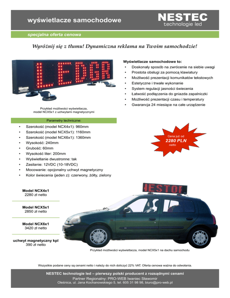 wyświetlacze samochodowe specjalna oferta cenowa Wyróżnij się z tłumu! Dynamiczna reklama na Twoim samochodzie! Wyświetlacze samochodowe to: • Doskonały sposób na zwrócenie na siebie uwagi • Prostota obsługi za pomocą klawiatury • Możliwość prezentacji komunikatów tekstowych • Estetyczne i trwałe wykonanie • System regulacji jasności świecenia • Łatwość podłączenia do gniazda zapalniczki • Możliwość prezentacji czasu i temperatury • Gwarancja 24 miesiące na całe urządzenie Przykład możliwości wyświetlacza, model NCX5x1 z uchwytami magnetycznymi Parametry techniczne: • Szerokość (model NCX4x1): 960mm • Szerokość (model NCX5x1): 1160mm • Szerokość (model NCX6x1): 1360mm • Wysokość: 240mm • Grubość: 60mm • Wysokość liter: 200mm • Wyświetlanie dwustronne: tak • Zasilanie: 12VDC (10-18VDC) • Mocowanie: opcjonalny uchwyt magnetyczny • Kolor świecenia (jeden z): czerwony, żółty, zielony Cena już od 2280 PLN netto Model NCX4x1 2280 zł netto Model NCX5x1 2850 zł netto Model NCX6x1 3420 zł netto uchwyt magnetyczny kpl 390 zł netto Przykład możliwości wyświetlacza, model NCX5x1 na dachu samochodu Wszystkie podane ceny są cenami netto i należy do nich doliczyć 22% VAT. Oferta cenowa ważna do odwołania. NESTEC technologie led – pierwszy polski producent z rozsądnymi cenami Partner Regionalny: PRO-WEB Iwaniec Sławomir Oleśnica, ul. Jana Kochanowskiego 5, tel. 605 31 98 98, [email protected]