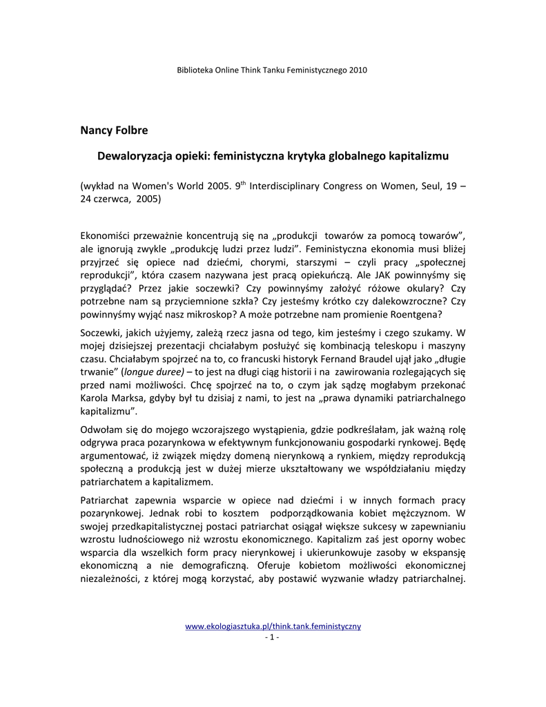 Biblioteka Online Think Tanku Feministycznego 2010 Nancy Folbre Dewaloryzacja opieki: feministyczna krytyka globalnego kapitalizmu (wykład na Women's World 2005. 9th Interdisciplinary Congress on Women, Seul, 19 – 24 czerwca, 2005) Ekonomiści przeważnie koncentrują się na „produkcji towarów za pomocą towarów”, ale ignorują zwykle „produkcję ludzi przez ludzi”. Feministyczna ekonomia musi bliżej przyjrzeć się opiece nad dziećmi, chorymi, starszymi – czyli pracy „społecznej reprodukcji”, która czasem nazywana jest pracą opiekuńczą. Ale JAK powinnyśmy się przyglądać? Przez jakie soczewki? Czy powinnyśmy założyć różowe okulary? Czy potrzebne nam są przyciemnione szkła? Czy jesteśmy krótko czy dalekowzroczne? Czy powinnyśmy wyjąć nasz mikroskop? A może potrzebne nam promienie Roentgena? Soczewki, jakich użyjemy, zależą rzecz jasna od tego, kim jesteśmy i czego szukamy. W mojej dzisiejszej prezentacji chciałabym posłużyć się kombinacją teleskopu i maszyny czasu. Chciałabym spojrzeć na to, co francuski historyk Fernand Braudel ujął jako „długie trwanie” (longue duree) – to jest na długi ciąg historii i na zawirowania rozlegających się przed nami możliwości. Chcę spojrzeć na to, o czym jak sądzę mogłabym przekonać Karola Marksa, gdyby był tu dzisiaj z nami, to jest na „prawa dynamiki patriarchalnego kapitalizmu”. Odwołam się do mojego wczorajszego wystąpienia, gdzie podkreślałam, jak ważną rolę odgrywa praca pozarynkowa w efektywnym funkcjonowaniu gospodarki rynkowej. Będę argumentować, iż związek między domeną nierynkową a rynkiem, między reprodukcją społeczną a produkcją jest w dużej mierze ukształtowany we współdziałaniu między patriarchatem a kapitalizmem. Patriarchat zapewnia wsparcie w opiece nad dziećmi i w innych formach pracy pozarynkowej. Jednak robi to kosztem podporządkowania kobiet mężczyznom. W swojej przedkapitalistycznej postaci patriarchat osiągał większe sukcesy w zapewnianiu wzrostu ludnościowego niż wzrostu ekonomicznego. Kapitalizm zaś jest oporny wobec wsparcia dla wszelkich form pracy nierynkowej i ukierunkowuje zasoby w ekspansję ekonomiczną a nie demograficzną. Oferuje kobietom możliwości ekonomicznej niezależności, z której mogą korzystać, aby postawić wyzwanie władzy patriarchalnej. www.ekologiasztuka.pl/think.tank.feministyczny -1- Biblioteka Online Think Tanku Feministycznego 2010 Ale jednocześnie wywiera konkurencyjne naciski, penalizujące jednostki i państwa, które przeznaczają zasoby na społeczną reprodukcję. Innymi słowy, patriarchat ceni opiekę, ale podporządkowuje pracowniczki opieki. Kapitalizm wyzwala pracowniczki opieki, ale dewaloryzuje opiekę. Można to ująć przy pomocy amerykańskiego kolokwialnego powiedzenia, że jesteśmy schwytane między diabłem, a głębokim błękitnym morzem. Diabeł jest ciepły, ale okrutny. Morze oferuje wolność, ale jest zbyt lodowate, aby się nim cieszyć. Moja dzisiejsza prezentacja składa się z trzech części: (1) pochodzenie patriarchatu (2) nieszczęśliwe małżeństwo patriarchatu i kapitalizmu (3) globalny kapitalizm i dewaloryzacja opieki. Początki patriarchatu Dobrowolna wymiana odgrywa ważną rolę we współczesnych gospodarkach. Niemniej to polityczne, ekonomiczne i kulturowe czynniki determinują czyją własnością są zasoby będące przedmiotem wymiany, a także na jakich warunkach dokonuje się ta wymiana. Karol Marks uczył, iż historia wszystkich społeczeństw jest historią walki klas. Bardzo dużo zależy od tego, co rozumiemy przez pojęcie „klasa”. W książce „Free to Loose” John Roemer oferuje nam jasną i przekonywującą matematyczna formułę, która podważa klasyczny marksizm, w tym teorie wartości pracy. Niemniej podziela ona marksowskie przeświadczenie (które należałoby nazwać nadzieją), iż klasa może być zredukowana do (męskiej) własności środków produkcji. Współcześni instytucjonalni ekonomiści podkreślają, iż wiele różnych grup ludzkich angażuje się w zachowania nastawione na wzmocnienie własnej pozycji, włączając w to wojnę. Nawet konserwatywni ekonomiści tacy jak Jack Hirshleifer wskazują iż ekonomia neoklasyczna, z jej naciskiem na wymianę rynkową, która odbywa się na podstawie wzajemnych umów – ignoruje „ciemną stronę mocy”, to jest korzystanie zorganizowanej przemocy w celu zagarnięcia zasobów i osiągnięcia korzystnych praw własności. Argument ten świetnie ilustruje ważna książka z historii porównawczej, Jareda Diamonda, „Strzelby, zarazki, maszyny”1. Diamond argumentuje, iż wiele geograficznych przypadków skierowało Europę na ścieżkę technologicznych przemian, co pozwoliło jej jak i jej kolonialnym odrostom, takim jak Stany Zjednoczone - osiągnąć ekonomiczną dominację w XX wieku. Zasadniczym wątkiem, który przewija się przez tę historię jest to, że bogactwo gwarantuje władzę, a władza pozwala okradać z majątku innych ludzi. 1 Jared Diamond, Strzelby, zarazki, maszyny, Losy ludzkich społeczeństw. Pruszyński i sp. 2009. www.ekologiasztuka.pl/think.tank.feministyczny -2- Biblioteka Online Think Tanku Feministycznego 2010 Te nowe ujęcia zbiorowego działania [collective action] mają ważne konsekwencje dla feministycznych wysiłków na rzecz konceptualizacji patriarchatu, które, jak się zdaje, zostały zaniechane od czasu opublikowania klasycznej książki Gerdy Lerner, „Początki patriarchatu” [The Origins of Patriarchy]. Dla wieku feministek pytanie o „początki” wydawało się nazbyt spekulatywne, a nawet niestosowne w świecie gdzie bardziej praktyczne podejścia mogły przynieść bieżące korzyści dla kobiet. Ale za pytaniem o początki stoją także odpowiedzi dotyczące naszej przyszłości jak i teraźniejszości. Wywód oparty na błyskotliwej syntezie antropologicznych badań, które Lerner przeprowadziła 