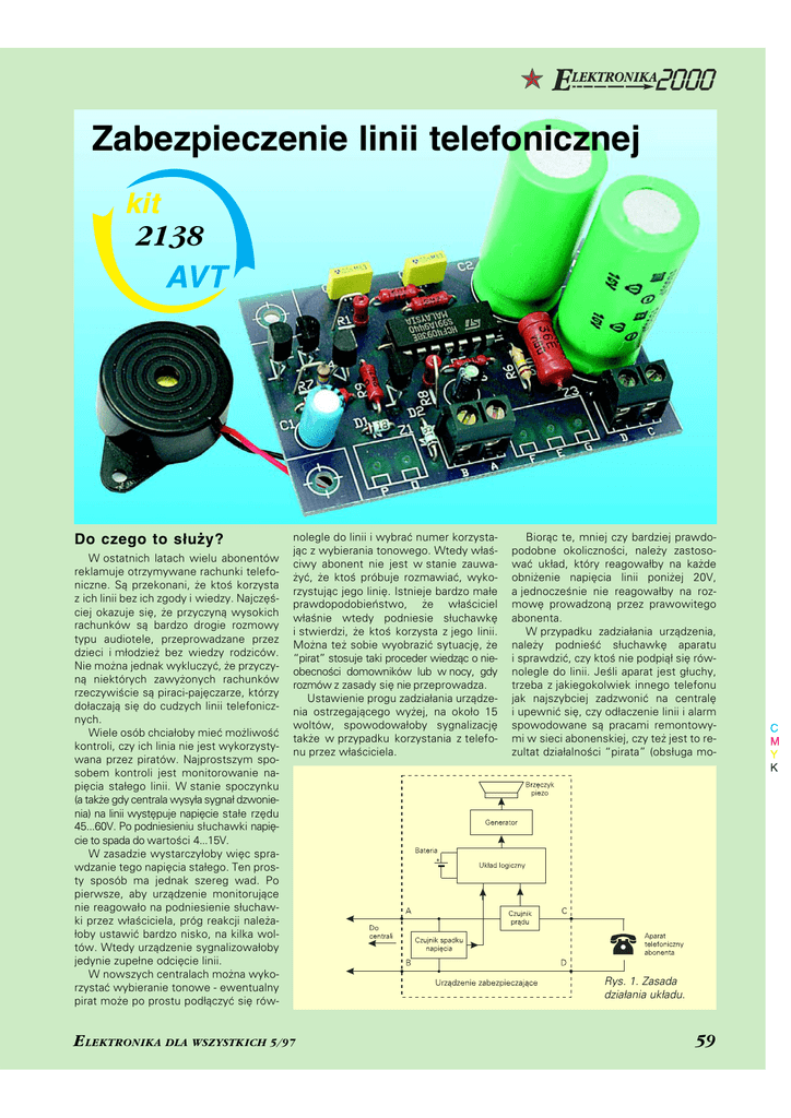 Zabezpieczenie linii telefonicznej 2138 Do czego to służy? W ostatnich latach wielu abonentów reklamuje otrzymywane rachunki telefo− niczne. Są przekonani, że ktoś korzysta z ich linii bez ich zgody i wiedzy. Najczęś− ciej okazuje się, że przyczyną wysokich rachunków są bardzo drogie rozmowy typu audiotele, przeprowadzane przez dzieci i młodzież bez wiedzy rodziców. Nie można jednak wykluczyć, że przyczy− ną niektórych zawyżonych rachunków rzeczywiście są piraci−pajęczarze, którzy dołaczają się do cudzych linii telefonicz− nych. Wiele osób chciałoby mieć możliwość kontroli, czy ich linia nie jest wykorzysty− wana przez piratów. Najprostszym spo− sobem kontroli jest monitorowanie na− pięcia stałego linii. W stanie spoczynku (a także gdy centrala wysyła sygnał dzwonie− nia) na linii występuje napięcie stałe rzędu 45...60V. Po podniesieniu słuchawki napię− cie to spada do wartości 4...15V. W zasadzie wystarczyłoby więc spra− wdzanie tego napięcia stałego. Ten pros− ty sposób ma jednak szereg wad. Po pierwsze, aby urządzenie monitorujące nie reagowało na podniesienie słuchaw− ki przez właściciela, próg reakcji należa− łoby ustawić bardzo nisko, na kilka wol− tów. Wtedy urządzenie sygnalizowałoby jedynie zupełne odcięcie linii. W nowszych centralach można wyko− rzystać wybieranie tonowe − ewentualny pirat może po prostu podłączyć się rów− nolegle do linii i wybrać numer korzysta− jąc z wybierania tonowego. Wtedy właś− ciwy abonent nie jest w stanie zauwa− żyć, że ktoś próbuje rozmawiać, wyko− rzystując jego linię. Istnieje bardzo małe prawdopodobieństwo, że właściciel właśnie wtedy podniesie słuchawkę i stwierdzi, że ktoś korzysta z jego linii. Można też sobie wyobrazić sytuację, że “pirat” stosuje taki proceder wiedząc o nie− obecności domowników lub w nocy, gdy rozmów z zasady się nie przeprowadza. Ustawienie progu zadziałania urządze− nia ostrzegającego wyżej, na około 15 woltów, spowodowałoby sygnalizację także w przypadku korzystania z telefo− nu przez właściciela. ELEKTRONIKA DLA WSZYSTKICH 5/97 Biorąc te, mniej czy bardziej prawdo− podobne okoliczności, należy zastoso− wać układ, który reagowałby na każde obniżenie napięcia linii poniżej 20V, a jednocześnie nie reagowałby na roz− mowę prowadzoną przez prawowitego abonenta. W przypadku zadziałania urządzenia, należy podnieść słuchawkę aparatu i sprawdzić, czy ktoś nie podpiął się rów− nolegle do linii. Jeśli aparat jest głuchy, trzeba z jakiegokolwiek innego telefonu jak najszybciej zadzwonić na centralę i upewnić się, czy odłaczenie linii i alarm spowodowane są pracami remontowy− mi w sieci abonenskiej, czy też jest to re− zultat działalności “pirata” (obsługa mo− Rys. 1. Zasada działania układu. 59 Rys. 1. Schemat ideowy układu. że wtedy stwierdzić, czy ktoś prowadzi aktualnie rozmowę). Jak to działa? Zasada działania urządzenia jest zilust− rowana na rysunku 1. Układ posiada dwa czujniki: czujnik spadku napięcia oraz czujnik przepływu prądu. Sygnalizacyjny brzęczyk piezo jest włączany gdy zadziała czujnik spadku na− pięcia. Jednak wtedy gdy jednocześnie wystąpi spadek napięcia i przepływ prą− du, brzęczyk nie zostanie uruchomiony. W ten sposób wykryty zostanie każdy aparat, dołączony do linii między centra− lą, a urządzeniem zabezpieczającym. Na− tomiast korzystanie z aparatu dołączone− go za urządzeniem zabezpieczającym, nie będzie sygnalizowane. Jak z tego wi− dać układ zabezpieczający powinien być umieszczony wewnątrz mieszkania, blis− ko punktu dołączenia linii biegnącej z centrali. Szczegółowy schemat ideowy układu pokazano na rysunku 2 2. Jest on zasilany z baterii. Nie można tu wykorzystać zasi− lania z linii telefonicznej, ponieważ w przypadku odcięcia linii, zabrakłoby źródła zasilania. Zaciski oznaczone A,B oraz C,D służą do dołączenia linii telefonicznej. Biegu− nowość linii nie ma znaczenia. Elementy T1, T2, R7, D1, D2 tworzą czujnik spadku napięcia. W stanie spo− czynku przez te elementy płynie maleńki prąd i jeden z tych tranzystorów na pew− no jest otwarty. Zastosowano dwa tran− zystory i dwie diody, by układ mógł pra− cować przy dowolnej biegunowości linii. Gdy napięcie w punkcie A jest wyższe niż w punkcie B, przewodzi tranzystor T2. Gdy napięcie ma przeciwną bieguno− wość, przewodzi tranzystor T1. W każ− dym wypadku, napięcie na kolektorach 60 tranzystorów T1, T2 jest bliskie poten− kach rozmowy płynie w linii, według cjału masy (ujemnego bieguna baterii za− obowiązujących norm musi być większy silającej, czyli punktu O). Tym samym na niż 15mA. Rezystor R10 ma tak dobraną nóżce 2 bramki NAND U1A wystepuje wartość, by czujnik prądu włączał się dla stan niski. Wymusza on stan wysoki na prądów większych niż 15mA. Spadek na− wyjściu tejże bramki. Tym samym na pięcia na rezystorze R10 przekroczy wte− nóżce 8 bramki U1C utrzymuje się stan dy 600mV, co otworzy jeden z tranzysto− niski, który blokuje pracę generatora rów T3, T4 (zależnie od kierunku prądu). zbudowanego na tej bramce (jest to Spowoduje to podanie na nóżkę 1 bram− bramka z układem Schmitta na wejściu). ki U1A stanu niskiego, czyli zablokowa− Na wyjściu bramki U1C (nóżka 10) nie generatora U1C i brzęczyka. W układzie czujnika prądowego prze− utrzymuje się stan wysoki, a na wyjściu bramki U1D − stan niski, czyli brzęczyk widziano miejsce na kondensatory elek− trolityczne C2, C3. Związane to jest nie działa. W takim stanie, zwarcie punktu G do z wymaganiami dotyczącymi obciążenia masy uruchomi brzęczyk − funkcja ta dołączonego do linii. Wymagania te żą− umożliwia okresowe sprawdzenie stanu dają, by rezystancja aparatu dołączanego do l
