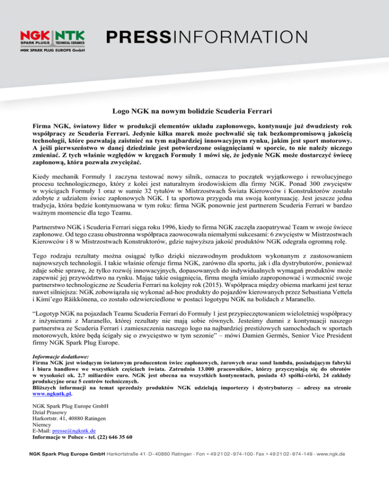Logo NGK na nowym bolidzie Scuderia Ferrari Firma NGK, światowy lider w produkcji elementów układu zapłonowego, kontynuuje już dwudziesty rok współpracy ze Scuderia Ferrari. Jedynie kilka marek może pochwalić się tak bezkompromisową jakością technologii, które pozwalają zaistnieć na tym najbardziej innowacyjnym rynku, jakim jest sport motorowy. A jeśli pierwszeństwo w danej dziedzinie jest potwierdzone osiągnięciami w sporcie, to nie należy niczego zmieniać. Z tych właśnie względów w kręgach Formuły 1 mówi się, że jedynie NGK może dostarczyć świecę zapłonową, która pozwala zwyciężać. Kiedy mechanik Formuły 1 zaczyna testować nowy silnik, oznacza to początek wyjątkowego i rewolucyjnego procesu technologicznego, który z kolei jest naturalnym środowiskiem dla firmy NGK. Ponad 300 zwycięstw w wyścigach Formuły 1 oraz w sumie 32 tytułów w Mistrzostwach Świata Kierowców i Konstruktorów zostało zdobyte z udziałem świec zapłonowych NGK. I ta sportowa przygoda ma swoją kontynuację. Jest jeszcze jedna tradycja, która będzie kontynuowana w tym roku: firma NGK ponownie jest partnerem Scuderia Ferrari w bardzo ważnym momencie dla tego Teamu. Partnerstwo NGK i Scuderia Ferrari sięga roku 1996, kiedy to firma NGK zaczęła zaopatrywać Team w swoje świece zapłonowe. Od tego czasu obustronna współpraca zaowocowała niemałymi sukcesami: 6 zwycięstw w Mistrzostwach Kierowców i 8 w Mistrzostwach Konstruktorów, gdzie najwyższa jakość produktów NGK odegrała ogromną rolę. Tego rodzaju rezultaty można osiągać tylko dzięki niezawodnym produktom wykonanym z zastosowaniem najnowszych technologii. I takie właśnie oferuje firma NGK, zarówno dla sportu, jak i dla dystrybutorów, ponieważ zdaje sobie sprawę, że tylko rozwój innowacyjnych, dopasowanych do indywidualnych wymagań produktów może zapewnić jej przywództwo na rynku. Mając takie osiągnięcia, firma mogła śmiało zaproponować i wzmocnić swoje partnerstwo technologiczne ze Scuderia Ferrari na kolejny rok (2015). Współpraca między obiema markami jest teraz nawet silniejsza: NGK zobowiązała się wykonać ad-hoc produkty do pojazdów kierowanych przez Sebastiana Vettela i Kimi’ego Räikkönena, co zostało odzwierciedlone w postaci logotypu NGK na bolidach z Maranello. “Logotyp NGK na pojazdach Teamu Scuderia Ferrari do Formuły 1 jest przypieczętowaniem wieloletniej współpracy z inżynierami z Maranello, której rezultaty nie mają sobie równych. Jesteśmy dumni z kontynuacji naszego partnerstwa ze Scuderia Ferrari i zamieszczenia naszego logo na najbardziej prestiżowych samochodach w sportach motorowych, które będą ścigały się o zwycięstwo w tym sezonie” – mówi Damien Germès, Senior Vice President firmy NGK Spark Plug Europe. Informacje dodatkowe: Firma NGK jest wiodącym światowym producentem świec zapłonowych, żarowych oraz sond lambda, posiadającym fabryki i biura handlowe we wszystkich częściach świata. Zatrudnia 13.000 pracowników, którzy przyczyniają się do obrotów w wysokości ok. 2,7 miliardów euro. NGK jest obecna na wszystkich kontynentach, posiada 43 spółki-córki, 24 zakłady produkcyjne oraz 5 centrów technicznych. Bliższych informacji na temat sprzedaży produktów NGK udzielają importerzy i dystrybutorzy – adresy na stronie www.ngkntk.pl. NGK Spark Plug Europe GmbH Dział Prasowy Harkortstr. 41, 40880 Ratingen Niemcy E-Mail: [email protected] Informacje w Polsce - tel. (22) 646 35 60