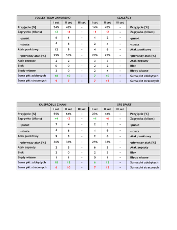 VOLLEY TEAM JAWORZNO SZALEŃCY I set II set III set I set II set III set 54% 46% - 14% 45% - Przyjęcie [%] +2 -4 - -1 -2 - Zagrywka (bilans) •punkt 6 1 - 1 2 - •punkt •strata 4 5 - 2 4 - •strata 12 9 - 4 6 - Atak punktowy 29% 55% - 29% 23% - •pierwszy atak [%] Atak zepsuty 2 2 - 3 7 - Atak zepsuty Blok 0 0 - 2 2 - Blok Błędy własne 3 0 - 2 4 - Błędy własne Suma pkt zdobytych 18 10 - 7 10 - Suma pkt zdobytych Suma pkt straconych 9 7 - 7 15 - Suma pkt straconych Przyjęcie [%] Zagrywka (bilans) Atak punktowy •pierwszy atak [%] KA SPRÓBUJ Z NAMI SPS SPART I set II set III set I set II set III set 55% 64% - 23% 44% - Przyjęcie [%] +4 -2 - +1 -6 - Zagrywka (bilans) •punkt 7 4 - 2 3 - •punkt •strata 3 6 - 1 9 - •strata 9 8 - 2 6 - Atak punktowy 36% 36% - 25% 33% - •pierwszy atak [%] Atak zepsuty 2 3 - 6 3 - Atak zepsuty Blok 2 0 - 2 3 - Blok Błędy własne 1 1 - 0 1 - Błędy własne Suma pkt zdobytych 18 12 - 6 12 - Suma pkt zdobytych Suma pkt straconych 6 10 - 7 13 - Suma pkt straconych Przyjęcie [%] Zagrywka (bilans) Atak punktowy •pierwszy atak [%] VOTUM HELENKA KOMISARIAT I set II set III set I set II set III set 30% 56% - 85% 86% - Przyjęcie [%] -3 -4 - +1 -6 - Zagrywka (bilans) •punkt 0 1 - 5 2 - •punkt •strata 3 5 - 4 8 - •strata 5 6 - 12 15 - Atak punktowy 14% 38% - 50% 56% - •pierwszy atak [%] Atak zepsuty 2 2 - 2 1 - Atak zepsuty Blok 1 1 - 1 0 - Blok Błędy własne 2 1 - 3 3 - Błędy własne Suma pkt zdobytych 6 8 - 18 17 - Suma pkt zdobytych Suma pkt straconych 7 8 - 9 12 - Suma pkt straconych Przyjęcie [%] Zagrywka (bilans) Atak punktowy •pierwszy atak [%]