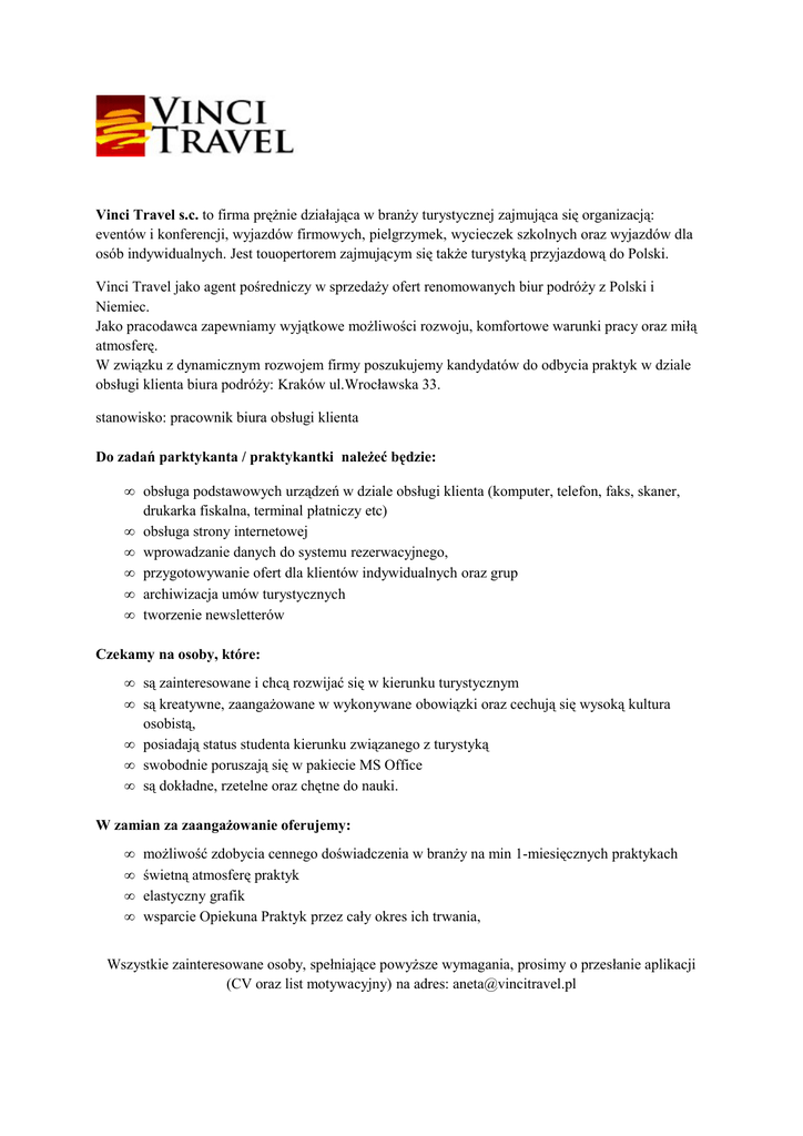 Vinci Travel s.c. to firma prężnie działająca w branży turystycznej zajmująca się organizacją: eventów i konferencji, wyjazdów firmowych, pielgrzymek, wycieczek szkolnych oraz wyjazdów dla osób indywidualnych. Jest touopertorem zajmującym się także turystyką przyjazdową do Polski. Vinci Travel jako agent pośredniczy w sprzedaży ofert renomowanych biur podróży z Polski i Niemiec. Jako pracodawca zapewniamy wyjątkowe możliwości rozwoju, komfortowe warunki pracy oraz miłą atmosferę. W związku z dynamicznym rozwojem firmy poszukujemy kandydatów do odbycia praktyk w dziale obsługi klienta biura podróży: Kraków ul.Wrocławska 33. stanowisko: pracownik biura obsługi klienta Do zadań parktykanta / praktykantki należeć będzie: • obsługa podstawowych urządzeń w dziale obsługi klienta (komputer, telefon, faks, skaner, drukarka fiskalna, terminal płatniczy etc) • obsługa strony internetowej • wprowadzanie danych do systemu rezerwacyjnego, • przygotowywanie ofert dla klientów indywidualnych oraz grup • archiwizacja umów turystycznych • tworzenie newsletterów Czekamy na osoby, które: • są zainteresowane i chcą rozwijać się w kierunku turystycznym • są kreatywne, zaangażowane w wykonywane obowiązki oraz cechują się wysoką kultura osobistą, • posiadają status studenta kierunku związanego z turystyką • swobodnie poruszają się w pakiecie MS Office • są dokładne, rzetelne oraz chętne do nauki. W zamian za zaangażowanie oferujemy: • • • • możliwość zdobycia cennego doświadczenia w branży na min 1-miesięcznych praktykach świetną atmosferę praktyk elastyczny grafik wsparcie Opiekuna Praktyk przez cały okres ich trwania, Wszystkie zainteresowane osoby, spełniające powyższe wymagania, prosimy o przesłanie aplikacji (CV oraz list motywacyjny) na adres: [email protected] ______________________________________________________ Vinci Travel s.c A.Pytel, A.Jabłonowska K.Jabłonowska - Żmigrodzka 30-086 Kraków, ul. Halczyna 12, BIURO OBSŁUGI KLIENTA: 30-011 Kraków, ul. Wrocławska 33/35 Tel/Fax: 12 353 14 50 Tel. 601371173 [email protected] www.vincitravel.pl