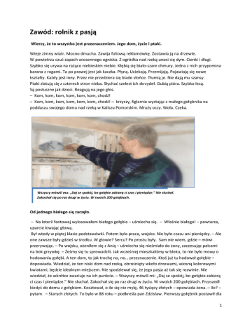 Zawód: rolnik z pasją Wierzy, że to wszystko jest przeznaczeniem. Jego dom, życie i ptaki. Wieje zimny wiatr. Mocno dmucha. Zawija foliową reklamówkę. Zostawia ją na drzewie. W powietrzu czuć zapach wiosennego ogniska. Z ogródka nad rzeką unosi się dym. Cienki i długi. Szybko się urywa na rażąco niebieskim niebie. Kłębią się biało-szare chmury. Jedna z nich przypomina barana z rogami. Ta po prawej jest jak kaczka. Płyną. Uciekają. Przemijają. Pojawiają się nowe kształty. Każdy jest inny. Przez nie przedziera się blade słońce. Tłumią je. Nie dają mu szansy. Ptaki zlatują się z czterech stron nieba. Słychać szelest ich skrzydeł. Gubią pióra. Szybko lecą. Są posłuszne jak dzieci. Reagują na jego głos. – Kom, kom, kom, kom, kom, kom, chodź! – Kom, kom, kom, kom, kom, kom, chodź! – krzyczy, figlarnie wystając z małego gołębnika na poddaszu swojego domu nad rzeką w Kaliszu Pomorskim. Mruży oczy. Woła. Czeka. Wszyscy mówili mu: „Daj se spokój, bo gołębie zabiorą ci czas i pieniądze.” Nie słuchał. Zakochał się po raz drugi w życiu. W swoich 200 gołębiach. Od jednego białego się zaczęło. – Na loterii fantowej wylosowałem białego gołębia – uśmiecha się. – Właśnie białego! – powtarza, uparcie kiwając głową. Był wtedy w piątej klasie podstawówki. Potem była praca, wojsko. Nie było czasu ani pieniędzy. – Ale one zawsze były gdzieś w środku. W głowie? Sercu? Po prostu były. Sam nie wiem, gdzie – mówi przerywając. – Po wojsku, ożeniłem się z Anią – uśmiecha się nieśmiało do żony, zaczesując palcami na bok grzywkę. – Żeśmy się tu sprowadzili. Jak wcześniej mieszkaliśmy w bloku, to nie było mowy o hodowaniu gołębi. A ten dom, to jak trochę no, no… przeznaczenie. Ktoś już tu hodował gołębie – dopowiada. Wiedział, że ten niski dom nad rzeką, obrośnięty wkoło drzewami, wiosną kolorowymi kwiatami, będzie idealnym miejscem. Nie spodziewał się, że jego pasja aż tak się rozwinie. Nie wiedział, że wkrótce zwariuje na ich punkcie. – Wszyscy mówili mi: „Daj se spokój, bo gołębie zabiorą ci czas i pieniądze.” Nie słuchał. Zakochał się po raz drugi w życiu. W swoich 200 gołębiach. Przyszedł kiedyś do domu z gołębiem. Kosztował, o ile się nie mylę, 46 tysięcy złotych – opowiada żona. – Ile? – pytam. – Starych złotych. To było w 88 roku – podkreśla pan Zdzisław. Pierwszy gołębnik postawił dla 1 czterech gołębi. Teraz ma trzy lotowe, dwa na młode i jeden rozpłodowy gołębnik. Wszystko zbudował własnoręcznie. Każdą półkę, deskę, specjalne regały po 4. Cały czas coś dorabia, zmienia. Zabiera mnie do gołębnika. Wchodzimy po drabinie. – Jeszcze mam tu drabinę, ale kolega obiecał, że postawi mi schody. Bierze jednego gołębia do ręki. – Widzisz, jaki on jest piękny jak się napuszy. Taki kolorowy, cudowny. Nie ma szablonu pięknego gołębia. On musi leżeć w ręce. Mam ulubione kolory – niebieski i nakrapiany jasny, a ostatnio czerwony. Nie lubię gołębi pstrych. Na oczy nie zwracam uwagi. Mnie interesuje tylko wyczyn i pod tym kątem go oceniam. Gdy wezmę gołębia do ręki to w 50% intuicyjnie wyczuję czy jest dobry – mówi z pasją w głosie. Z zawodu rolnik Z zawodu jest rolnikiem. Prawie cały dzień spędza na polu, przy świniach i innych zwierzętach. Siedem dni w tygodniu. Bo zwierzętom codziennie trzeba dać jeść. Nawet w niedzielę. Swoim gołębiom poświęca 4,5 – 5 godzin w ciągu dnia. Na wakacje nie - Jadąc ciągnikiem często sobie myślę, jak sparować gołębie, co im dać do jedzenia. wyjeżdża. Nie może Zawsze o nich myślę. Zawsze są w mojej głowie. zostawić gołębi bez opieki. Dwa lata temu był chory, przez dwa miesiące nie wychodził z łóżka. Ptakami zajmowała się żona. Przez cały czas o nie pytał. Wszystkie gołębie mają obrączki, numery. Ma specjalny notatnik, w którym zapisuje, po jakich rodzicach są, jakie osiągnięcia mają. Krzyżuje je wtedy odpowiednio. Prowadzi drzewa genealogiczne. Na zawodach stosuje technikę wdowieństwa. – To znaczy, że samiczki cały tydzień są w gołębnikach – wstaje z fotela i pokazuje. – Wyobraź sobie, że po tej stronie są samiczki – rozkłada prawą rękę. – A po tej samce. – wyciąga drugą rękę, podkasając rękaw swetra. No i jest motywacja w ten sposób. No wiesz… – tłumaczy dokładnie. – Na starcie zawodnicy widzą swoich partnerów i już wiedzą, że oni będą czekać na mecie. Mają wtedy większą motywację. Trener Sezon lotowy, czyli zawody zaczynają się pierwszego maja. Przez cały rok trenuje gołębie. Na wiosnę robi to intensywniej. Wypuszcza je z gołębnika. Jeździ z nimi za miasto. Szkoli, ćwiczy. Sam przez całą zimę analizuje notatniki. Ogląda programy telewizyjne. Czyta specjalne książki, poradniki. Ustala skład drużyny. Jest trochę jak trener. Zawsze nie może się doczekać, kiedy rozpocznie się sezon. – Przygotowanie do sezonu lotowego w ciągu tygodnia jest specjalne – opowiada. Gołębie stosują specjalną dietę. Sobota – dzień powrotu. Po locie herbata ziołowa (rumiankowa), elektrolit, miód, cytryna, dieta plus jęczmień. 2 Niedziela – co drugi tydzień „Gambakozid”, karma, dieta. Poniedziałek – karma dieta z olejem czosnkowym plus drożdże piwne Wtorek – pokarm – dieta 50% + 50% dla wdowców, woda rano „Blitzform” (preparat jodowy), wieczorem glukoza, woda. – 20 kilogramów karmy kosztuje od 50 do 80 złotych. Jeden gołąb je 4-5 deko dziennie. Tanie to nie jest – kwituje. Zawsze przed wylotem stresuje się. Robi sobie ziołową herbatkę, kupuje ciasteczko. Chodzi wkoło, w tę i z powrotem. Patrzy w niebo i czeka. – Jak uda się wygrać to zawsze bardzo się cieszę i jestem dumny. W Totolotka nie potrafię trafić, a tu mi się udaje. Wiem, że moja ciężka praca, pieniądz