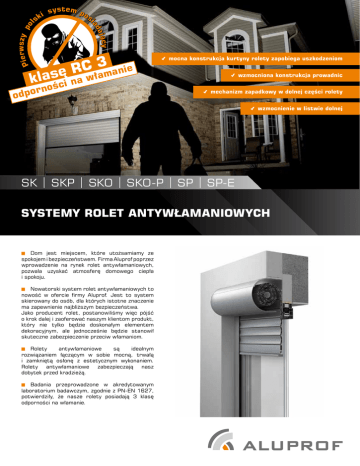 ają rwszy p ol system po s d ia i sk cy Pie 3 nie C R a klasścęi na włam rno odpo cmocna konstrukcja kurtyny rolety zapobiega uszkodzeniom cwzmocniona konstrukcja prowadnic cmechanizm zapadkowy w dolnej części rolety cwzmocnienie w listwie dolnej SK | SKP | SKO | SKO-P | SP | SP-E SYSTEMY ROLET ANTYWŁAMANIOWYCH Dom jest miejscem, które utożsamiamy ze spokojem i bezpieczeństwem. Firma Aluprof poprzez wprowadzenie na rynek rolet antywłamaniowych, pozwala uzyskać atmosferę domowego ciepła i spokoju. Nowatorski system rolet antywłamaniowych to nowość w ofercie firmy Aluprof. Jest to system skierowany do osób, dla których istotne znaczenie ma zapewnienie najbliższym bezpieczeństwa. Jako producent rolet, postanowiliśmy więc pójść o krok dalej i zaoferować naszym klientom produkt, który nie tylko będzie doskonałym elementem dekoracyjnym, ale jednocześnie będzie stanowił skuteczne zabezpieczenie przeciw włamaniom. Rolety antywłamaniowe są idealnym rozwiązaniem łączącym w sobie mocną, trwałą i zamkniętą osłonę z estetycznym wykonaniem. Rolety antywłamaniowe zabezpieczają nasz dobytek przed kradzieżą. Badania przeprowadzone w akredytowanym laboratorium badawczym, zgodnie z PN-EN 1627, potwierdziły, że nasze rolety posiadają 3 klasę odporności na włamanie. SK | SKP | SKO | SKO-P | SP | SP-E SYSTEMY ROLET ANTYWŁAMANIOWYCH wzmocniona konstrukcja prowadnic nie pozwalająca na ich odgięcie oraz wyciągnięcie profili roletowych wzmocnienie w listwie dolnej – duża sztywność i stabilność pancerza odpowiednio mocna konstrukcja kurtyny rolety zapobiegająca uszkodzeniom zabezpieczony patentem mechanizm przez uderzenia zapadkowy w dolnej części rolety zapobiegający przed próbą podniesienia kurtyny rolet SYSTEMY SK SKP możliwość adaptacji systemu w istniejących jak i w nowo wznoszonych budynkach SKO-P możliwość wykorzystania istniejących elementów składowych będących już w sprzedaży PROFILE SP SP-E SKO PE 55 wysokość profilu: 55 mm grubość: 14 mm KOLORYSTYKA PROFILI biały* szary* beżowy* Kolory nie odwzorowują wiernie kolorów rzeczywistych. Możliwość lakierowania w pełnej gamie kolorów. * Kolor specjalny – na zamówienie. ** Na zamówienie możliwość lakierowania na dowolny kolor RAL. brązowy* ciemnobrązowy* biały - perłowy mat* jasny szary - perłowy mat* nielakierowany** szary - perłowy mat* szary antracyt - perłowy mat* ciemny szary - perłowy mat* NAPĘDY I AKCESORIA Piloty SYST E M Y R O L E T I B RA M Przełączniki klawiszowe i kluczykowe Przełączniki zegarowe ALUPROF S.A. ul. Gosławicka 3, 45-446 Opole, Polska tel. +48 77 400 00 00, fax +48 77 400 00 06 e-mail: [email protected] www.aluprof.eu www.rolety.aluprof.eu Wieszaki blokady Centralka inteligentnego sterowania budynkiem PL-03.2015 Siłowniki elektryczne