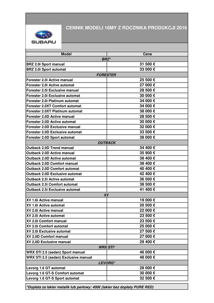 CENNIK MODELI 16MY Z ROCZNIKA PRODUKCJI 2016 Model Cena BRZ* 31 500 € 33 000 € BRZ 2.0i Sport manual BRZ 2.0i Sport automat FORESTER 25 500 € 27 000 € 28 500 € 30 000 € 34 000 € 34 000 € 38 000 € 28 500 € 30 000 € 32 000 € 33 500 € 38 000 € Forester 2.0i Active manual Forester 2.0i Active automat Forester 2.0i Exclusive manual Forester 2.0i Exclusive automat Forester 2.0i Platinum automat Forester 2.0XT Comfort automat Forester 2.0XT Platinum automat Forester 2.0D Active manual Forester 2.0D Active automat Forester 2.0D Exclusive manual Forester 2.0D Exclusive automat Forester 2.0D Sport automat OUTBACK 34 400 € 35 900 € 38 400 € 38 400 € 40 400 € 42 400 € 36 500 € 38 500 € 41 400 € Outback 2.0D Trend manual Outback 2.0D Active manual Outback 2.0D Active automat Outback 2.0D Comfort manual Outback 2.0D Comfort automat Outback 2.0D Exclusive automat Outback 2.5i Active automat Outback 2.5i Comfort automat Outback 2.5i Exclusive automat XV 19 000 € 20 500 € 22 000 € 23 500 € 23 500 € 25 000 € 27 500 € 27 000 € 29 400 € XV 1.6i Active manual XV 1.6i Active automat XV 2.0i Active manual XV 2.0i Active automat XV 2.0i Comfort manual XV 2.0i Comfort automat XV 2.0i Exclusive automat XV 2.0D Comfort manual XV 2.0D Exclusive manual WRX STI* 46 000 € 48 000 € WRX STI 2.5 (sedan) Sport manual WRX STI 2.5 (sedan) Exclusive manual LEVORG* Levorg 1.6 GT automat Levorg 1.6 GT-S Comfort automat Levorg 1.6 GT-S Sport automat 28 000 € 30 000 € 32 500 € *Dopłata za lakier metalik lub perłowy: 400€ (lakier bez dopłaty PURE RED)