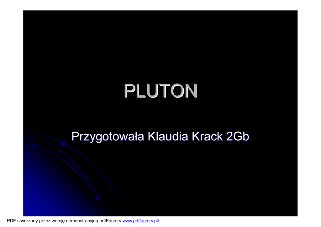 PLUTON Przygotowała Klaudia Krack 2Gb PDF stworzony przez wersję demonstracyjną pdfFactory www.pdffactory.pl/ Na początek… l Pluton jest ostatnią, dziewiątą według oddalenia od Słońca planetą Układu Słonecznego… PDF stworzony przez wersję demonstracyjną pdfFactory www.pdffactory.pl/ Z przeszłości… l Został on odkryty dopiero w 1930 r. przez astronoma amatora. Był nim Clyde Tombaugh. Niektórzy sądzą, że Pluton nie jest planetą i coraz częściej jest on zestawiany z Neptunem, ponieważ sądzi się, że w przeszłości mógł być on jego księżycem. PDF stworzony przez wersję demonstracyjną pdfFactory www.pdffactory.pl/ A co jeszcze ? l Pluton posiada jeszcze jedną bardzo charakterystyczną cechę. Jego orbita jest dużo bardziej nachylona w stosunku do płaszczyzny ekliptyki niż orbity innych planet, bo kąt jej nachylenia wynosi 17*. Kolejną dziwną cechą Plutona jest to, że jego orbita przecina orbitę Neptuna, a peryhelium Plutona jest bliższe Słońca (4,43 mld km) niż peryhelium Neptuna (4,46 mld km). Wynika, więc z tego, że Pluton przez pewien okres czasu nie jest najdalszą planetą w Układzie Słonecznym. I tak było w latach 1979-1999 kiedy to najdalszą planetą był Neptun, gdyż Pluton poruszał się wewnątrz jego orbity. PDF stworzony przez wersję demonstracyjną pdfFactory www.pdffactory.pl/ Trochę liczb… l Ze względu na małe rozmiary i odległość nie zna się dokładnych wymiarów Plutona. Jego promień równikowy wynosi prawdopodobnie ok.1150 km. Masa tej planety zawiera się pomiędzy 7x1021 a 2x10 25 g i wynosi ona kilka procent masy Ziemi. Jeden obieg dookoła Słońca zajmuje Plutonowi ponad 248 lat, natomiast obrót wokół własnej osi trwa ok. 6,4 doby ziemskiej. PDF stworzony przez wersję demonstracyjną pdfFactory www.pdffactory.pl/ Warto się z tym zapoznać. PDF stworzony przez wersję demonstracyjną pdfFactory www.pdffactory.pl/ O planecie. Powierzchnia Plutona złożona jest w dużej części z zamarzniętego metanu. Dopiero niedawno odkryto, że Pluton ma satelitę. Nadano mu nazwę Charon. Mimo, że Kosmiczny Teleskop Hubble`a dostarczył nowych zdjęć planety, to Pluton jest jednak najsłabiej zbadaną planetą Układu Słonecznego, ponieważ nie dotarła do niego jeszcze żadna sonda kosmiczna. NASA planowała wystrzelenie w 2004 r. sondy „Pluto Kuiper Express”, lecz przełożyła to na późniejszy termin. PDF stworzony przez wersję demonstracyjną pdfFactory www.pdffactory.pl/ Fotografie. PDF stworzony przez wersję demonstracyjną pdfFactory www.pdffactory.pl/ Fotografie. l Budowa Plutonu… PDF stworzony przez wersję demonstracyjną pdfFactory www.pdffactory.pl/ Fotografie. PDF stworzony przez wersję demonstracyjną pdfFactory www.pdffactory.pl/ Dziękuję! PDF stworzony przez wersję demonstracyjną pdfFactory www.pdffactory.pl/