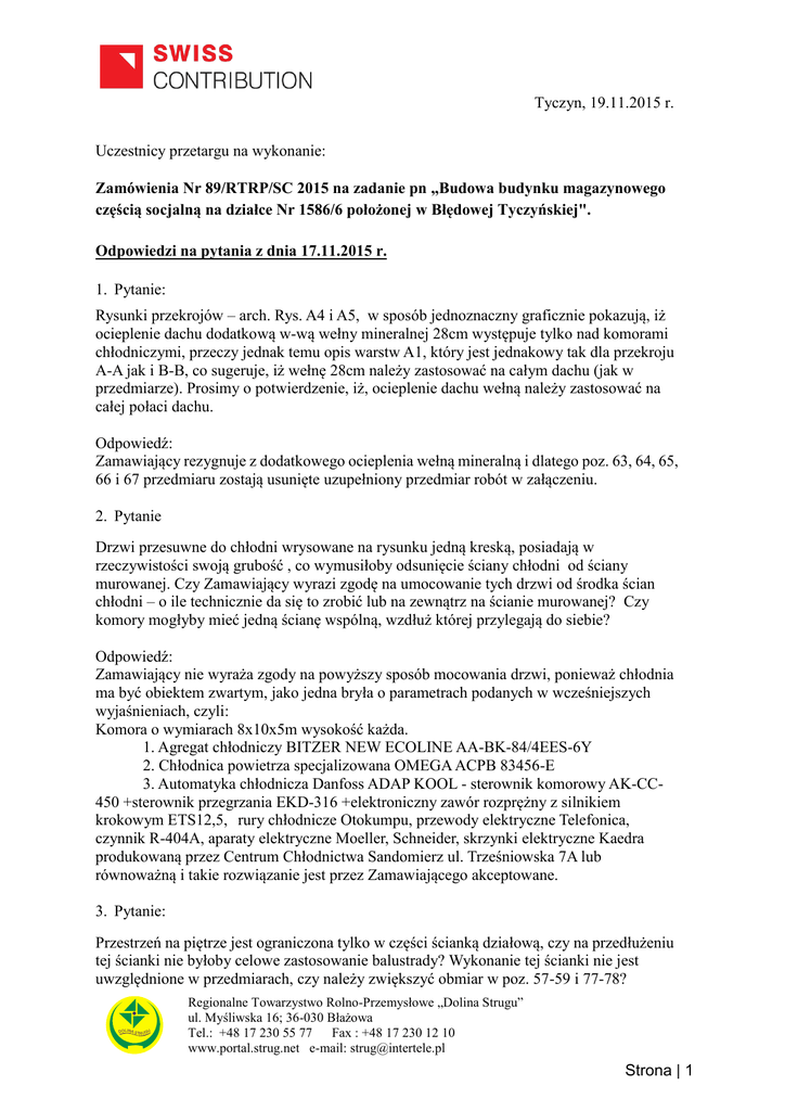 Tyczyn, 19.11.2015 r. Uczestnicy przetargu na wykonanie: Zamówienia Nr 89/RTRP/SC 2015 na zadanie pn „Budowa budynku magazynowego częścią socjalną na działce Nr 1586/6 położonej w Błędowej Tyczyńskiej". Odpowiedzi na pytania z dnia 17.11.2015 r. 1. Pytanie: Rysunki przekrojów – arch. Rys. A4 i A5, w sposób jednoznaczny graficznie pokazują, iż ocieplenie dachu dodatkową w-wą wełny mineralnej 28cm występuje tylko nad komorami chłodniczymi, przeczy jednak temu opis warstw A1, który jest jednakowy tak dla przekroju A-A jak i B-B, co sugeruje, iż wełnę 28cm należy zastosować na całym dachu (jak w przedmiarze). Prosimy o potwierdzenie, iż, ocieplenie dachu wełną należy zastosować na całej połaci dachu. Odpowiedź: Zamawiający rezygnuje z dodatkowego ocieplenia wełną mineralną i dlatego poz. 63, 64, 65, 66 i 67 przedmiaru zostają usunięte uzupełniony przedmiar robót w załączeniu. 2. Pytanie Drzwi przesuwne do chłodni wrysowane na rysunku jedną kreską, posiadają w rzeczywistości swoją grubość , co wymusiłoby odsunięcie ściany chłodni od ściany murowanej. Czy Zamawiający wyrazi zgodę na umocowanie tych drzwi od środka ścian chłodni – o ile technicznie da się to zrobić lub na zewnątrz na ścianie murowanej? Czy komory mogłyby mieć jedną ścianę wspólną, wzdłuż której przylegają do siebie? Odpowiedź: Zamawiający nie wyraża zgody na powyższy sposób mocowania drzwi, ponieważ chłodnia ma być obiektem zwartym, jako jedna bryła o parametrach podanych w wcześniejszych wyjaśnieniach, czyli: Komora o wymiarach 8x10x5m wysokość każda. 1. Agregat chłodniczy BITZER NEW ECOLINE AA-BK-84/4EES-6Y 2. Chłodnica powietrza specjalizowana OMEGA ACPB 83456-E 3. Automatyka chłodnicza Danfoss ADAP KOOL - sterownik komorowy AK-CC450 +sterownik przegrzania EKD-316 +elektroniczny zawór rozprężny z silnikiem krokowym ETS12,5, rury chłodnicze Otokumpu, przewody elektryczne Telefonica, czynnik R-404A, aparaty elektryczne Moeller, Schneider, skrzynki elektryczne Kaedra produkowaną przez Centrum Chłodnictwa Sandomierz ul. Trześniowska 7A lub równoważną i takie rozwiązanie jest przez Zamawiającego akceptowane. 3. Pytanie: Przestrzeń na piętrze jest ograniczona tylko w części ścianką działową, czy na przedłużeniu tej ścianki nie byłoby celowe zastosowanie balustrady? Wykonanie tej ścianki nie jest uwzględnione w przedmiarach, czy należy zwiększyć obmiar w poz. 57-59 i 77-78? DOLINA S TR UGU Regionalne Towarzystwo Rolno-Przemysłowe „Dolina Strugu” ul. Myśliwska 16; 36-030 Błażowa Tel.: +48 17 230 55 77 Fax : +48 17 230 12 10 www.portal.strug.net e-mail: [email protected] Strona | 1 Odpowiedź: Nie ma potrzeby stosowania balustrady, wykonanie tej ścianki jest uwzględnione w obmiarach. 4. Pytanie: Zamieszczone wyjaśnienie nadal nie precyzują rodzaju posadzki w magazynie – czy ma to być tylko zatarta nawierzchnia betonowa jak w odpowiedziach, czy też epoksydowa – jak w opisie do architektury. Na przekroju opisano ją ogólnie jako posadzkę przemysłową. Prosimy o jednoznaczną odpowiedź jak ma być wykończona posadzka w części magazynowej. Odpowiedź: Proszę przyjąć w pom. 1.10, 1.11 i 1.14 posadzkę epoksydową gr. 5 mm, w pom. 1.12, 1.13 posadzka betonowa zatarta na gładko zabezpieczona przed pyleniem w pozostałych pomieszczeniach terakota o parametrach podanych w wcześniejszych wyjaśnieniach uzupełniony przedmiar robót w załączeniu. 5. Pytanie: Wg opisu w-w podposadzkowych izolacja przeciwwilgociowa to 2xpapa na lepiku (czego praktycznie już się nie stosuje), wg opisu w architekturze to folia PE pod i nad ociepleniem, prosimy o sprecyzowanie rodzaju tej izolacji jaką należy wycenić. Odpowiedź: Proszę przyjąć folię uzupełniony przedmiar robót w załączeniu. 6. Pytanie: Poz. 92 przedmiaru przewiduje wykonanie parapetów z aglomarmuru, nie znajduje to potwierdzenia w projekcie – nie zaznaczono podokienników na rysunku rzutu, brak również takiej informacji w opisie technicznym. Prosimy o potwierdzenie, że podokienniki takie należy uwzględnić w wycenie i że mają być wykonane z tego właśnie materiału. Odpowiedź: Proszę przyjąć parapety z aglomarmuru zgodnie z przedmiarem. 7. Pytanie: Jaki rodzaj tynków elewacyjnych należy uwzględnić w wycenie – silikonowe jak opisano je na rys. elewacji czy mineralne – jak na przekroju ? Odpowiedź: Proszę zastosować tynki silikonowe. 8. Pytanie: Prosimy o sprecyzowanie sposobu podłączenia grzejników – boczne czy dolne oraz ich określenie ich rodzaju. Odpowiedź: proszę zastosować grzejniki dolno zasilane DOLINA S TR UGU Regionalne Towarzystwo Rolno-Przemysłowe „Dolina Strugu” ul. Myśliwska 16; 36-030 Błażowa Tel.: +48 17 230 55 77 Fax : +48 17 230 12 10 www.portal.strug.net e-mail: [email protected] Strona | 2 Odpowiedzi na pytania z dnia 18.11.2015 r. 1. Pytanie: W toku sporządzania wyceny obiektu "Budynek magazynowy z cz.socjalną w Błedowej Tyczyńskiej", wobec dużego kosztu, jaki stanowić będzie zakup i montaż komór chłodniczych, zwróciliśmy się z zapytaniem do firmy zajmującej się budową takich komór. Przesłaliśmy w tym celu odnośne rysunki z projektu wykonawczego - rzut i przekrój. Wyjaśnienia, jakie otrzymaliśmy nieco zmieniają założenia projektowe, prosimy o odniesienie się do informacji jakie otrzymaliśmy: „Na obudowę zimnochronną zaproponowałem dla tzw. komór zerowych zastosowanie płyt warstwowych z rdzeniem PU, którego izolacyjność jest 2x lepsza od styropianu, stąd pewnie w projekcie jest grubość 200mm. Ewidentnym błędem projektowym jest zastosowanie do izolacji zimnochronnej stropu wełny mineralnej z paroizolacją od strony komory! Izolacja komory musi być wykonana z materiałów niehigroskopijnych z pełną ciągłością paroizolacji od strony napływu wilgoci tj. strony cieplejszej=zewnętrznej. Stropy komór chłodniczych wykon