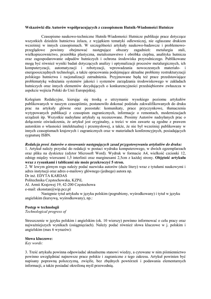 Wskazówki dla Autorów współpracujących z czasopismem Hutnik-Wiadomości Hutnicze Czasopismo naukowo-techniczne Hutnik-Wiadomości Hutnicze publikuje prace dotyczące wszystkich dziedzin hutnictwa żelaza, z wyjątkiem tematyki odlewniczej, nie ogłaszane drukiem wcześniej w innych czasopismach. W szczególności artykuły naukowo-badawcze i problemowoprzeglądowe powinny obejmować następujące obszary zagadnień: metalurgia stali, wielkopiecownictwo, przeróbka plastyczna, metaloznawstwo i obróbka cieplna, analityka hutnicza oraz zagospodarowanie odpadów hutniczych i ochrona środowiska przyrodniczego. Publikowane mogą być również wyniki badań dotyczących analizy i optymalizacji procesów metalurgicznych, ich komputeryzacji, automatyzacji i robotyzacji, wprowadzania nowoczesnych materiało- i energooszczędnych technologii, a także opracowania podejmujące aktualne problemy restrukturyzacji polskiego hutnictwa i racjonalizacji zatrudnienia. Przyjmowane będą też prace przedstawiające problematykę wdrażania systemów jakości i systemów zarządzania środowiskowego w zakładach hutniczych oraz innych elementów decydujących o konkurencyjności przedsiębiorstw zwłaszcza w aspekcie wejścia Polski do Unii Europejskiej. Kolegium Redakcyjne, kierując się troską o utrzymanie wysokiego poziomu artykułów publikowanych w naszym czasopiśmie, postanowiło dokonać podziału zakwalifikowanych do druku prac na artykuły główne oraz pozostałe: komunikaty, prace przyczynkowe, tłumaczenia wytypowanych publikacji z czasopism zagranicznych, informacje o remontach, modernizacjach urządzeń itp. Wszystkie nadsyłane artykuły są recenzowane. Prosimy Autorów nadsyłanych prac o dołączenie oświadczenia, że artykuł jest oryginalny, a treści w nim zawarte są zgodne z prawem autorskim o własności intelektualnej i przemysłowej, a także, że nie był wcześniej publikowany w innych czasopismach krajowych i zagranicznych oraz w materiałach konferencyjnych, posiadających sygnaturę ISBN. Redakcja prosi Autorów o stosowanie następujących zasad przygotowywaniu artykułów do druku: 1. Artykuł należy przysłać do redakcji w postaci wydruku komputerowego, w dwóch egzemplarzach oraz pliku na dyskietce (edytor Microsoft Word). Wydruk w formacie A4, wielkość czcionki 12, odstęp między wierszami 1,5 interlinii oraz marginesami 2,5cm z każdej strony. Objętość artykułu wraz z rysunkami i tablicami nie może przekroczyć 5 stron. 2. W lewym górnym rogu należy podać nazwiska autorów (duże litery) wraz z tytułami naukowymi i adres instytucji oraz adres e-mailowy głównego (jednego) autora np. Dr inż. EDYTA KARDAS Politechnika Częstochowska, KZPiL Al. Armii Krajowej 19, 42-200 Częstochowa e-mail: [email protected] Następnie tytuł artykułu w języku polskim (pogrubiony, wyśrodkowany) i tytuł w języku angielskim (kursywą, wyśrodkowany), np.: Postęp w technologii Technological progress of Streszczenie w języku polskim i angielskim (ok. 10 wierszy) powinno informować o celu pracy oraz najważniejszych wynikach (osiągnięciach). Należy podać również słowa kluczowe w j. polskim i angielskim (max 6 wyrazów): Słowa kluczowe: Key words: 3. Treść artykułu powinna odpowiadać aktualnemu stanowi wiedzy, a cytowane w nim piśmiennictwo powinno uwzględniać najnowsze prace polskie i zagraniczne z tego zakresu. Artykuł powinien być napisany poprawną polszczyzną, zwięźle, bez zbędnych powtórzeń i podawania elementarnych informacji, a także posiadać określoną myśl przewodnią. 4. Układ artykułu powinien być zwarty i przejrzysty, a jego treść podzielona na zatytułowane rozdziały tworzące zamkniętą całość. Artykuł powinien kończyć się podsumowaniem i ewentualnie jasno sformułowanymi wnioskami. 5. Jednostki miar, słownictwo techniczne, skróty najważniejszych oznaczeń, wielkości we wzorach, znaki matematyczne itp. powinny odpowiadać obowiązującemu Międzynarodowemu Układowi Jednostek (SI). Inne jednostki mogą być stosowane, jeśli są uznane za legalne lub przejściowo dopuszczone do stosowania. 6. Tablice i rysunki (fotografie) powinny znajdować się poza tekstem na oddzielnych stronach, a na marginesie wydruku tekstu powinny być zaznaczone miejsca ich umieszczenia. Należy pamiętać, że w tekście powinny znajdować się nawiązania do umieszczonych w artykule rysunków i tablic. Ponadto każdy rysunek powinien być utworzony jako osobny plik graficzny (JPG lub bmp). Każda tablica również powinna znaleźć się w osobnym pliku z umieszczonym na górze opisem. Dodatkowo należy również dodać odrębny plik zawierający spis rysunków. 7. Tablice powinny być ponumerowane cyframi arabskimi z lewej strony u góry. Następnie należy podać tytuł dotyczący zawartości danej tablicy w języku polskim (tekst pogrubiony). W następnym wierszu należy podać numer tablicy i jej tytuł w języku angielskim (kursywa, bez pogrubienia)np.: Tablica 2. Skład chemiczny badanej stali Table 2. Chemical composition of the investigated steel Pożądane jest, aby mieściły się w szerokości szpalty lub kolumny (podstawa 8 cm lub 17 cm). Nie należy dołączać tablic, gdy dane tablicowe są na rysunku. 8. Materiały ilustracyjne (rysunki, wykresy, schematy, diagramy, fotografie) należy ponumerować cyframi arabskimi z podaniem napisu objaśniającego w języku polskim (tekst pogrubiony) i w języku angielskim (kursywa),np.: Rys. 1. Schemat obróbki cieplnej badanej stali Fig. 1. Schematic diagram of the heat treatment of investigated steel 9. Podobnie jak tablice, także rysunki powinny mieścić się na jednej szpalcie (8 cm) lub kolumnie (17 cm). Fotografie (tylko czarno-białe) powinny być wyraźne i kontrastowe, przysłane również w formie pliku na dyskietce. Na odwrocie należy opisać ołówkiem ich numery oraz nazwisko pierwszego autora i początek tytułu pracy, a także zaznaczyć "góra" "dół". 10