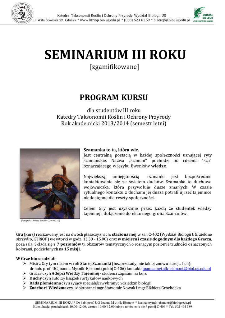 Katedra Taksonomii Roślin i Ochrony Przyrody Wydział Biologii UG ul. Wita Stwosza 59, Gdańsk * www.ktriop.bio.ug.edu.pl * (058) 523 61 59 * [email protected] SEMINARIUM III ROKU [zgamifikowane] PROGRAM KURSU dla studentów III roku Katedry Taksonomii Roślin i Ochrony Przyrody Rok akademicki 2013/2014 (semestr letni) Szamanka to ta, która wie. Jest centralną postacią w każdej społeczności uznającej ryty szamańskie. Nazwa „szaman” pochodzi od rdzenia "sza" oznaczającego w języku Ewenków wiedzę. Największą umiejętnością szamanki jest bezpośrednie kontaktowanie się ze światem duchów. Szamanka to duchowa wojowniczka, która przywołuje dusze zmarłych. W czasie rytualnego kontaktu z duchami jej dusza potrafi ujrzeć tajemnice niedostępne dla reszty społeczności. Celem Gry jest uzyskanie przez każdą ze studentek wiedzy tajemnej i dołączenie do elitarnego grona Szamanów. [Fotografia: Arkady Zarubin CC BY-NC 2.0] Gra (kurs) realizowany jest na dwóch płaszczyznach: stacjonarnej w sali C-402 (Wydział Biologii UG, zielone skrzydło, KTRiOP) we wtorki w godz. 13.30 - 15.00) oraz w miejscu i czasie dogodnym dla każdego Gracza, poza salą. Składa się z 7 poziomów tj. obszarów tematycznych o rosnącym poziomie trudności oznaczonych kolorami, podzielonych na 15 misji. W Grze biorą udział: Mistrz Gry tym razem w roli Starej Szamanki (bez przesady, nie takiej znowu starej... heh): dr hab. prof. UG Joanna Mytnik-Ejsmont (pokój C-406) kontakt: [email protected] Gracze czyli Adepci Wiedzy Tajemnej - studenci zapisani na kurs Duchy czyli autorzy książek i artykułów naukowych Rada plemienna czyli żyjący specjaliści wybranych dziedzin biologii Znachor i Wiedźma czyli doktoranci mgr Sławomir Nowak i mgr Elżbieta Grochocka SEM INARIUM III ROKU * Dr hab. prof. UG Joanna M ytnik-Ejsmont * [email protected] Konsultacje: poniedziałek 10.00-12.00, wtorek 10.00-12.00 lub po umówieniu się * pokój C-406 * Tel. 502 494 189 Katedra Taksonomii Roślin i Ochrony Przyrody Wydział Biologii UG ul. Wita Stwosza 59, Gdańsk * www.ktriop.bio.ug.edu.pl * (058) 523 61 59 * [email protected] ZASADY GRY Każdy Adept Wiedzy Tajemnej przybiera imię, którym zatytułowane będzie jego POLE WALKI w Google Sheets (tabela zadań i paski postępu) oraz jego Folder Gry w DropBoxie. ZADANIA KONIECZNOŚCI I WYBORU Zadania konieczności są obowiązkowe. Zadania wyboru nie są obowiązkowe, ale można przystąpić do ich wykonywania PO zaliczeniu wszystkich zadań konieczności z danego tygodnia. Okno czasowe dla każdego zadania (konieczności i wyboru) trwa 2 tygodnie, kolejny tydzień (trzeci) to możliwość zdobycia połowy punktów, czwarty tydzień - 1/4 punktów.. Okno czasowe otwiera się po zajęciach na sali (wtorki godz. 15.00) Rozwiązania zadań z danego tygodnia można zacząć przesyłać do swojego Folderu Gry w DropBoxie po zakończeniu zajęć na sali przewidzianych dla danej misji. Szczegóły dotyczące zadań podawane są podczas misji stacjonarnych. POLE WALKI Każdy z Adeptów dokonuje samooceny po każdej misji stacjonarnej, Stara Szamanka weryfikuje liczbę punktów. UMIEJĘTNOŚCI (14) Umiejętności są Adeptowi przyznawane automatycznie po przekroczeniu wymaganej liczby punktów. Postęp w zdobywaniu umiejętności pokazuje pasek postępu w POLU WALKI. Za zdobycie 2, 5, 8 i 12 umiejętności Stara Szamanka przyznaje nagrody:) Lista umiejętności znajduje się na końcu dokumentu. ODZNAKI (12) Odznaki są przyznawane przez GRACZY sobie wzajemnie przez cały czas trwania Gry (tajne głosowanie drogą elektroniczną w POLU WALKI). W przypadku wątpliwości Starej Szamanki co do zasadności przyznania odznaki należy swoją decyzję uzasadnić (w takim przypadku zostanie wystosowana prośba o uzasadnienie). Stara Szamanka również ma prawo przyznawania odznak Adeptom. Przyznawane odznaki pojawiają się sukcesywnie w POLU WALKI Adepta. Lista odznak znajduje się na końcu dokumentu. NAGRODY Nagrodę można otrzymać za zwycięstwo w KONKURSACH (przez tajne głosowania na najlepszy projekt/wystąpienie podczas), na półmetku mając min. 500 pkt oraz po zdobyciu dwóch, pięciu, ośmiu i dwunastu umiejętności. PÓŁMETEK Półmetek Gry to dzień 8 kwietnia godz. 20.00. NIEOBECNOŚCI Każda nieobecność na misji stacjonarnej to utrata 1 życia. Każdy z Graczy ma 3 życia w momencie rozpoczęcia Gry. Aby uzyskać pozytywną ocenę z seminarium trzeba ukończyć Grę z min. 1 życiem. Każde dodatkowe ocalone życie (drugie i trzecie) na koniec Gry, to 30 pkt. (razem max. 60 pkt). Utracone życie można odzyskać po przedstawieniu zwolnienia lekarskiego obejmującego czas trwania misji stacjonarnej. Utracone punkty z misji stacjonarnej można uzyskać indywidualnie u Starej Szamanki. WSPARCIE TECHNICZNE Drukarka / ksero / papier ksero (biały i kolor) / papier wizytówkowy / gilotyna / aparat fotograficzny / dostęp do komputera z dostępem do Internetu itp. są do dyspozycji Adeptów po wcześniejszym uzgodnieniu terminu ze Starą Szamanką. SEM INARIUM III ROKU * Dr hab. prof. UG Joanna M ytnik-Ejsmont * [email protected] Konsultacje: poniedziałek 10.00-12.00, wtorek 10.00-12.00 lub po umówieniu się * pokój C-406 * Tel. 502 494 189 Katedra Taksonomii Roślin i Ochrony Przyrody Wydział Biologii UG ul. Wita Stwosza 59, Gdańsk * www.ktriop.bio.ug.edu.pl * (058) 523 61 59 * [email protected] ZALICZENIE Punkty zdobyte wyłącznie podczas zajęć na sali nie wystarczają do uzyskania pozytywnej oceny z seminarium. Warunki zaliczenia zajęć na poszczególne oceny przedstawia tabela: OCENA PUNKTY MINIMALNA LICZBA UMIEJĘTNOŚCI MINIMALNA LICZBA ODZNAK MINIMALNA LICZBA ŻYĆ KAŻDE ZADANIE KONIECZNOŚCI KAŻDY POZIOM bdb min. 1150 11 4 1 zaliczone na min. 50% zaliczony db+ 1149-910 10 3 1 zaliczone na min. 50% zaliczony db 909-760 8 3 1 zaliczone na min. 50% zaliczony dst+ 759-610 6 2 1 zaliczone na min. 50% zaliczony dst 609-485 5 2 1 zaliczone na min. 5