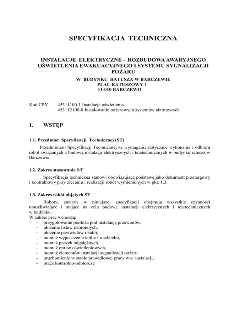 SPECYFIKACJA TECHNICZNA INSTALACJE ELEKTRYCZNE – ROZBUDOWA AWARYJNEGO OŚWIETLENIA EWAKUACYJNEGO I SYSTEMU SYGNALIZACJI POŻARU W BUDYNKU RATUSZA W BARCZEWIE PLAC RATUSZOWY 1 11-010 BARCZEWO Kod CPV 1. 45311100-1 Instalacja oświetlenia 453112100-8 Instalowanie pożarowych systemów alarmowych WSTĘP 1.1. Przedmiot Specyfikacji Technicznej (ST) Przedmiotem Specyfikacji Technicznej są wymagania dotyczące wykonania i odbioru robót związanych z budową instalacji elektrycznych i teletechnicznych w budynku ratusza w Barczewie. 1.2. Zakres stosowania ST Specyfikacja techniczna stanowi obowiązującą podstawę jako dokument przetargowy i kontraktowy przy zlecaniu i realizacji robót wymienionych w pkt. 1.3. 1.3. Zakres robót objętych ST Roboty, zawarte w niniejszej specyfikacji obejmują wszystkie czynności umożliwiające i mające na celu budowę instalacji elektrycznych i teletechnicznych w budynku. W zakres prac wchodzą: - przygotowanie podłoża pod instalację przewodów, - ułożenie listew ochronnych, - ułożenie przewodów i kabli, - montaż wyposażenia tablic i rozdzielni, - montaż puszek odgałęźnych, - montaż opraw oświetleniowych, - montaż elementów instalacji sygnalizacji pożaru - uruchomienie w stanie prawidłowej pracy ww. instalacji, - prace kontrolno-odbiorcze Określenia podane w ST są zgodne z odpowiednimi normami i określeniami podanymi w dokumentacji technicznej. 1.4. Charakterystyka elementów objętych ST – zagadnienia ogólne Przyłącze – jest to linia elektroenergetyczna łącząca złącze (odbiorcę) z siecią zasilającą. Złącze – z jednej strony jest końcowym elementem sieci zasilającej, zaś z drugiej – początkiem instalacji obiektu budowlanego. Rozdzielnia główna – jest to element instalacji elektrycznej występujący w przypadku, gdy z jednego złącza zasilana jest więcej niż jedna linia zasilającą. W rozdzielnicy głównej usytuowane są zabezpieczenia poszczególnych wewnętrznych linii zasilających. Rozdzielnicę budynku umieszcza się zwykle w pobliżu złącza. Wewnętrzna linia zasilająca (WLZ) – jest to obwód zasilający tablice rozdzielcze (rozdzielnice), z których zasilane są instalacje odbiorcze. Obwód rozdzielczy – jest to obwód zasilający tablice rozdzielcze. W obiektach budowlanych rolę obwodów rozdzielczych pełnią wewnętrzne linie zasilające (WLZ). Obwód odbiorczy (obwód końcowy) – jest to obwód, do którego przyłączone są bezpośrednio odbiorniki energii elektrycznej lub gniazda wtyczkowe. Głównymi elementami obwodu instalacji elektrycznej są przewody (tory prądowe) umożliwiające przesyłanie energii elektrycznej, łączniki umożliwiające załączanie i wyłączanie oraz zabezpieczenia chroniące elementy obwodu przed skutkami zakłóceń. Kable – wyroby składające się z jednej lub większej liczby żył izolowanych, zaopatrzone w powłokę oraz ewentualnie – w zależności od warunków układania i eksploatacji w osłonę i pancerz. Kable przystosowane są do układania bezpośrednio w ziemi, w wodzie lub w kanałach podziemnych, albo też do zawieszania w powietrzu. Przewody – wyroby składające się z jednego lub kilku skręconych drutów albo jednej większej liczby żył izolowanych bez powłoki lub w zależności od warunków, w których mają być zastosowane – zaopatrzone w powłokę niemetalową. Linia kablowa – kabel wielożyłowy lub wiązka kabli jednożyłowych w układzie wielofazowym albo kilka kabli jedno lub wielożyłowych połączonych równolegle łącznie z osprzętem, ułożone na wspólnej trasie i łączące zaciski tych samych dwóch urządzeń elektrycznych jedno lub wielofazowych. Trasa kablowa – pas terenu w którym ułożone są jedna lub więcej linii kablowych. Napięcie znamionowe linii – napięcie międzyprzewodowe, na które linia kablowa została zbudowana. Osprzęt linii kablowej – zbiór elementów przeznaczonych do łączenia, rozgałęzienia lub zakończenia kabli. Przepust kablowy – konstrukcja o przekroju najczęściej okrągłym przeznaczona do ochrony kabla przed uszkodzeniami mechanicznymi, chemicznymi, i działaniem łuku elektrycznego. Dodatkowa ochrona przeciwporażeniowa – ochrona części przewodzących, dostępnych w wypadku pojawienia się na nich napięcia w warunkach zakłóceniowych. Bezpieczniki topikowe – zabezpieczają przed przetężeniami, przede wszystkim przed skutkami zwarć. Na działanie , parametry i jakość bezpiecznika wpływają wszystkie jego części składowe, ale decydujący wpływ mają: topik, gasiwo i korpus wkładki. 1.5. Ogólne wymagania dotyczące robót. Wykonawca robót jest odpowiedzialny za jakość ich wykonania oraz za ich zgodność z dokumentacją projektową, ST i poleceniami inżyniera. 2. MATERIAŁY 2.1. Ogólne wymagania Ogólne wymagania dotyczące materiałów podano w dokumentacji technicznej. 2.2. Przewody elektroenergetyczne Typy przewodów stosować zgodnie z dokumentacją techniczną i specyfikacją dokumentacji technicznej. Do wykonania instalacji elektrycznych w budynkach stosować przewody izolowane do układania na stałe. Żyły przewodów wielożyłowych muszą posiadać różne barwy izolacji, w tym żółto- zieloną dla przewodu ochronnego. Sposób układania przewodów w instalacji musi być dostosowany do charakteru budynku oraz przeznaczenia pomieszczeń w celu ograniczenia wzajemnego wpływu instalacji elektrycznych i środowiska. Przewody instalacyjne stosować na napięcie znamionowe (450/750V). Stosować przewody z żyłami miedzianymi. 2.3. Przewody instalacji teletechnicznych Stosować dla linii dozorowych typu YnTKSYekw 1x2x0.8 oraz dla linii sygnalizacyjnych typu HDGs 2x1. 2.4. Rozdzielnia główna i tablice rozdzielcze Pod pojęciem rozdzielnicy rozumie się zespół urządzeń elektrycznych złożony z: aparatury rozdzielczej, zabezpieczeniowej, pomiarowej, sterowniczej i sygnalizacyjnej. - szyn zbiorczych, - odpowiednich