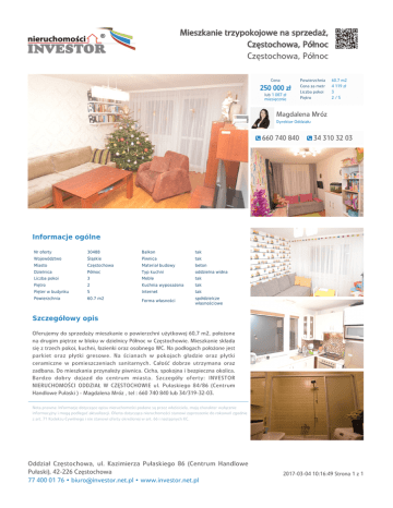 Mieszkanie trzypokojowe na sprzedaż, Częstochowa, Północ Częstochowa, Północ Cena 250 000 zł lub 1 087 zł miesięcznie Powierzchnia Cena za metr Liczba pokoi Piętro 60.7 m2 4 119 zł 3 2/5 Magdalena Mróz Dyrektor Oddziału 660 740 840 34 310 32 03 Informacje ogólne Nr oferty 30488 Balkon tak Województwo Śląskie Piwnica tak Miasto Częstochowa Materiał budowy beton Dzielnica Północ Typ kuchni oddzielna widna Liczba pokoi 3 Meble tak Piętro 2 Kuchnia wyposażona tak Pięter w budynku 5 Internet tak Powierzchnia 60.7 m2 Forma własności spółdzielcze własnościowe Szczegółowy opis Oferujemy do sprzedaży mieszkanie o powierzchni użytkowej 60,7 m2, położone na drugim piętrze w bloku w dzielnicy Północ w Częstochowie. Mieszkanie składa się z trzech pokoi, kuchni, łazienki oraz osobnego WC. Na podłogach położone jest parkiet oraz płytki gresowe. Na ścianach w pokojach gładzie oraz płytki ceramiczne w pomieszczeniach sanitarnych. Całość dobrze utrzymana oraz zadbana. Do mieszkania przynależy piwnica. Cicha, spokojna i bezpieczna okolica. Bardzo dobry dojazd do centrum miasta. Szczegóły oferty: INVESTOR NIERUCHOMOŚCI ODDZIAŁ W CZĘSTOCHOWIE ul. Pułaskiego 84/86 (Centrum Handlowe Pułaski ) - Magdalena Mróz , tel : 660 740 840 lub 34/319-32-03. Nota prawna: Informacje dotyczące opisu nieruchomości podane są przez właściciela, mają charakter wyłącznie informacyjny i mogą podlegać aktualizacji. Oferta dotycząca nieruchomości stanowi zaproszenie do rokowań zgodnie z art. 71 Kodeksu Cywilnego i nie stanowi oferty określonej w art. 66 i następnych KC. Oddział Częstochowa, ul. Kazimierza Pułaskiego 86 (Centrum Handlowe Pułaski), 42-226 Częstochowa 77 400 01 76 • [email protected] • www.investor.net.pl 2017-03-04 10:16:49 Strona 1 z 1