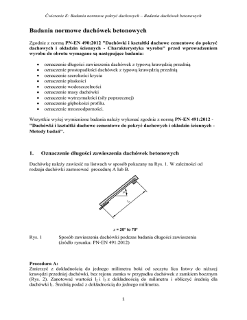 Ćwiczenie E: Badania normowe pokryć dachowych – Badania dachówek betonowych Badania normowe dachówek betonowych Zgodnie z normą PN-EN 490:2012 "Dachówki i kształtki dachowe cementowe do pokryć dachowych i okładzin ściennych - Charakterystyka wyrobu" przed wprowadzeniem wyrobu do obrotu wymagane są następujące badania: oznaczenie długości zawieszenia dachówek z typową krawędzią przednią oznaczenie prostopadłości dachówek z typową krawędzią przednią oznaczenie szerokości krycia oznaczenie płaskości oznaczenie wodoszczelności oznaczenie masy dachówki oznaczenie wytrzymałości (siły poprzecznej) oznaczenie głębokości profilu. oznaczenie mrozoodporności. Wszystkie wyżej wymienione badania należy wykonać zgodnie z normą PN-EN 491:2012 "Dachówki i kształtki dachowe cementowe do pokryć dachowych i okładzin ściennych Metody badań". 1. Oznaczenie długości zawieszenia dachówek betonowych Dachówkę należy zawiesić na listwach w sposób pokazany na Rys. 1. W zależności od rodzaju dachówki zastosować procedurę A lub B. Rys. 1 Sposób zawieszenia dachówki podczas badania długości zawieszenia (źródło rysunku: PN-EN 491:2012) Procedura A: Zmierzyć z dokładnością do jednego milimetra boki od szczytu lica listwy do niższej krawędzi przedniej dachówki, bez rejonu zamka w przypadku dachówek z zamkiem bocznym (Rys. 2). Zanotować wartości l2 i l3 z dokładnością do milimetra i obliczyć średnią dla dachówki l1. Średnią podać z dokładnością do jednego milimetra. 1 Ćwiczenie E: Badania normowe pokryć dachowych – Badania dachówek betonowych Rys. 2 Sposób badania długości zawieszenia dla dachówki ze stałą nominalną długością zawieszenia (źródło rysunku: PN-EN 491:2012) Dopuszczalna odchyłka: Dla dachówek ze stałą nominalną długością zawieszenia zmierzona wartość długości zawieszenia, zgodnie z PN-EN 491:2012 nie powinna różnić się od wartości deklarowanej przez producenta o więcej niż ± 4 mm. Procedura B: Zmierzyć z dokładnością do jednego milimetra odległość od szczytu lica listwy do najniższego punktu dachówki (Rys. 3). Zanotować wartość l1 z dokładnością do jednego milimetra. Rys. 3 Sposób badania długości zawieszenia dla dachówki ze zmienną nominalną długością zawieszenia (źródło rysunku: PN-EN 491:2012) Dopuszczalna odchyłka: Dla dachówek ze zmienną nominalną długością zawieszenia zmierzona wartość długości zawieszenia, zgodnie z PN-EN 491:2012 nie powinna różnić się od wartości deklarowanej przez producenta o więcej niż ± 4 mm. 2 Ćwiczenie E: Badania normowe pokryć dachowych – Badania dachówek betonowych 2. Oznaczenie prostopadłości dachówek betonowych Badanie to wykonuje się dla dachówek ze stałą nominalną długością zawieszenia. Procedura badawcza: - Zmierzyć z dokładnością do jednego milimetra boki od szczytu lica listwy do niższej krawędzi przedniej dachówki, bez rejonu zamka w przypadku dachówek z zamkiem bocznym (Rys. 2). - Zanotować wartości l2 i l3 z dokładnością do milimetra. - Obliczyć różnicę pomiędzy wartościami l2 i l3. Wynik badania: Zgodnie z normą PN-EN 491:2012, krawędzie dachówki uznaje się za prostopadłe jeśli różnica wartości l2 i l3 nie jest większa niż 4 mm. 3. Oznaczenie szerokości krycia dachówek betonowych Procedura badawcza : Dachówki z zamkiem: - 11 sztuk dachówek zawiesić lub ułożyć na listwie. - Maksymalnie rozciągnąć zamki dachówek. Zmierzyć z dokładnością do 1 mm szerokość krycia rozsuniętych 10 dachówek cwd (Rys. 4). Rys. 4 Sposób pomiaru szerokości krycia rozsuniętych 10 dachówek cwd (źródło rysunku: PN-EN 491:2012) - Zsunąć zamki dachówek. Zmierzyć z dokładnością do milimetra szerokość krycia zsuniętych 10 dachówek cwc (Rys. 5) 3 Ćwiczenie E: Badania normowe pokryć dachowych – Badania dachówek betonowych Rys. 5 Sposób pomiaru szerokości krycia zsuniętych 10 dachówek cwc (źródło rysunku: PN-EN 491:2012) Obliczyć z dokładnością do 1 mm: a) średnią wartość szerokości krycia rozsuniętych dachówek c wd/10 i średnią wartość szerokości krycia zsuniętych dachówek cwc/10 b) średnią szerokość krycia (c wd + cwc)/20. Dachówki bez zamka: - Zawiesić lub położyć na listwie 10 dachówek pokrycia w sposób podany przez producenta. - Obliczyć z dokładnością do 1 mm średnią szerokość krycia c wc/10. Dopuszczalna odchyłka: Jeżeli producent nie deklaruje odchyłki od szerokości krycia, zgodnie z PN-EN 490:2012 zmierzona szerokość krycia musi mieścić się w zakresie: "deklarowana przez producenta wartość szerokości krycia ± 5 mm". 4. Oznaczenie wodoszczelności dachówek betonowych Procedura badawcza: - Przed badaniem dachówki należy kondycjonować przez co najmniej 20 h w temperaturze od 15°C do 30°C i minimalnej wilgotności względnej 30%, tak, aby powietrze miało swobodny dostęp ze wszystkich stron do każdej dachówki. - Na badanej dachówce lub wokół niej umieścić szczelną ramkę (Rys. 6-7). Połączenie dachówki z ramką uszczelnić kitem. Zakitować otwory montażowe. - Dachówkę zalać wodą do poziomu minimum 10 - 15 mm nad najwyższą jej powierzchnią. - Przez cały czas prowadzenia badania obserwować czy ze spodniej powierzchni dachówki spadła kropla wody. 4 Ćwiczenie E: Badania normowe pokryć dachowych – Badania dachówek betonowych Rys. 6 Sposób pomiaru wodoszczelności dachówek betonowych z wykorzystaniem lustra (1 – woda, 2 - kit o szerokości max 15 mm, 3 - Rama wodoszczelna, 4 – dachówka, 5 – lustro, 6 - minimalna wysokość lustra wody od 10 do 15 mm) (źródło rysunku: PN-EN 491:2012) Rys. 7 Sposób pomiaru wodoszczelności dachówek betonowych z wykorzystaniem elektrycznego urządzenia wzmacniającego (7 - dwie warstwy metalowej siatki z warstwą izolacyjną między nimi, 8 - przyrząd pomiarowy, 9 - urządzenie rejestrujące) (źródło