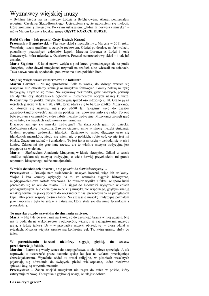 Wyznawcy wiejskiej muzy – Byliśmy kiedyś na wsi między Łodzią a Bełchatowem. Akurat poznawałem repertuar Czesława Skrzydłowskiego. Ucieszyłem się, że nauczyłem się melodii, które zrozumieją miejscowi. Po czym usłyszałem: „ładna ta norweska muzyka” – mówi Marcin Lorenc z łódzkiej grupy GĘSTY KOŻUCH KURZU. Rafał Gawin: – Jak powstał Gęsty Kożuch Kurzu? Przemysław Bogusławski: – Pierwszy skład stworzyliśmy z Marysią w 2011 roku. Wcześniej razem graliśmy w zespole rockowym. Gdzieś po drodze, na festiwalach, poznaliśmy pozostałych członków kapeli: Marcina Lorenca z Łodzi i Asię Gancarczyk, która mieszka w Ozorkowie. Powstał czteroosobowy skład – i tak już zostało. Maria Stępień: – Z kolei nazwa wzięła się od kurzu gromadzącego się na pudle skrzypiec, które dawni muzykanci trzymali na szafach albo wieszali na ścianach. Taka nazwa nam się spodobała, ponieważ ma dużo polskich liter. Skąd się wzięło wasze zainteresowanie folkiem? Marcin Lorenc: – Muszę sprostować. Folk to worek, do którego wrzuca się wszystko. Nie określamy siebie jako muzyków folkowych. Gramy polską muzykę tradycyjną. Czym to się różni? Nie używamy elektroniki, gitar basowych, perkusji ani djembe czy afrykańskich bębnów – instrumentów obcych naszej kulturze. Rekonstruujemy polską muzykę tradycyjną sprzed osiemdziesięciu lat. Grano ją na weselach jeszcze w latach 70. i 80., teraz zdarza się to bardzo rzadko. Muzykanci, od których się uczymy, mają po 80-90 lat. Sięgamy więc do czasów „przedrockandrollowych”, zanim na polskiej wsi upowszechniło się radio. To ono było jednym z czynników, które zabiły muzykę tradycyjną. Muzykanci zaczęli grać nowe hity, a w kapelach zadomowiła się harmonia. Dlaczego zajmuję się muzyką tradycyjną? Na skrzypcach gram od dziecka, skończyłem szkołę muzyczną. Zawsze ciągnęło mnie w stronę muzyki etnicznej. Grałem repertuar żydowski, irlandzki. Zastanowiło mnie: dlaczego uczę się irlandzkich mazurków, kiedy nie wiem nic o polskich, robię coś, co nie jest mi bliskie. Zacząłem szukać – i znalazłem. To jest jak z miłością – wchodzi się w nią i koniec. Zdarza mi się grać inne rzeczy, ale to właśnie muzyka tradycyjna jest przygodą na wiele lat. Maria: – Skończyłam Akademię Muzyczną w klasie skrzypiec. Odkąd w czasie studiów zajęłam się muzyką tradycyjną, o wiele łatwiej przychodziło mi granie repertuaru klasycznego, także emocjonalnie. W wielu dziedzinach obserwuje się powrót do słowiańszczyzny… Przemysław: – Brakuje nam świadomości naszych korzeni, więc ich szukamy. Wojna i lata komuny wpłynęły na to, że naturalna ciągłość historyczna, międzypokoleniowa została przerwana. To również wynika z faktu, że sporo ludzi przeniosło się ze wsi do miasta. PRL sięgał do ludowości wyłącznie w celach propagandowych. Nie chciałbym mieć z tą muzyką nic wspólnego, gdybym znał ją w takiej formie, w jakiej dociera do większości z nas: prezentowana na przeglądach kapel albo przez zespoły pieśni i tańca. Na szczęście muzykę tradycyjną poznałem jako taneczną i była to sytuacja naturalna, która stała się dla mnie łącznikiem z przeszłością. To muzyka przede wszystkim do słuchania na żywo. Maria: – Nie tyle do słuchania na żywo, co do czynnego brania w niej udziału. Nie ma tu podziału na wykonawców i odbiorców, wszyscy są zaangażowani: muzycy grają, a ludzie tańczą lub – w przypadku muzyki obrzędowej – biorą udział w rytuałach. Muzyka wiejska zawsze ma konkretny cel. Ta, którą gramy, służy do tańca. W poszukiwaniu korzeni niektórzy sięgają głębiej, do czasów przedchrześcijańskich. Marcin: – Łatwo się wtedy wraca do neopogaństwa, to się dobrze sprzedaje. A tak naprawdę ta twórczość przez ostatnie tysiąc lat jest na wskroś przesiąknięta chrześcijaństwem. Wyraźnie widać tu treści religijne, w pieśniach weselnych pojawiają się odwołania do świętych, pieśni wielkopostne, które niedawno śpiewaliśmy, są w rytmie mazurka. Przemysław: – Żaden wiejski muzykant nie zagra do tańca w poście, który zatrzymuje zabawę. To wynika z głębokiej wiary, że tak jest dobrze. Co i na czym gracie? Przemysław: – Instrumentarium jest sprzed 80 i więcej lat: skrzypce, głos i instrumenty rytmiczne: bębenek i baraban, na których gram zamiennie, oraz tzw. basy – instrument, który daje puls, nie gra – jak np. w muzyce góralskiej czy rzeszowskiej – akordów ani harmonii. Okolice, z których czerpiemy, to Mazowsze, ale w szczególności województwo łódzkie. Poruszamy się w kilku regionach, np. w opoczyńskim i sieradzkim rytmiczna podstawa to bębenek obręczowy, w łowickim i łęczyckim pojawia się już duży bęben, baraban. Maria: – Spotykamy się z ludowymi muzykantami. Marcin jest uczniem Tadeusza Kubiaka, grającego łęczyckie melodie. Uczymy się utworów również z nagrań archiwalnych Polskiego Radia czy Instytutu Sztuki PAN. Łódzki Dom Kultury też ma kilka takich wydawnictw. Przemysław: – Mamy problem z nazywaniem i rozróżnianiem granych przez nas utworów. Tytuły bierzemy albo od nazwy regionu, z którego muzyka pochodzi, np. „Mazurek spod Łowicza”, ewentualnie od nazwy wsi, albo od nazwiska muzykanta, od którego daną melodię wzięliśmy. Potem okazuje się, że tego samego mazurka, nieco inaczej wykonanego, słyszymy u innego muzykanta. Tu się wszystko miesza. Jeżeli coś ma konkretną nazwę, możemy podejrzewać, że to mazurek napisany przez jakiegoś kompozytora i niewiele ma wspólnego z muzyką tradycyjną. Województwo łódzkie to zagłębie muzyki tradycyjnej. Przemysław: – Skończyłem etnologię, a przez pierwsze półtora roku zajmowania się tą muzyką nie wiedziałem, kiedy Marysia i Marcin grają melodię łowicką, a kiedy opoczyńską. Teraz mam większą świadomość. Inaczej