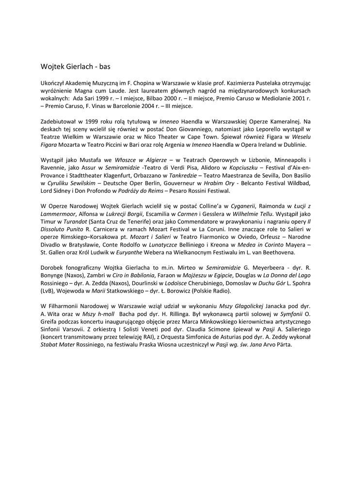 Wojtek Gierlach - bas Ukończył Akademię Muzyczną im F. Chopina w Warszawie w klasie prof. Kazimierza Pustelaka otrzymując wyróżnienie Magna cum Laude. Jest laureatem głównych nagród na międzynarodowych konkursach wokalnych: Ada Sari 1999 r. – I miejsce, Bilbao 2000 r. – II miejsce, Premio Caruso w Mediolanie 2001 r. – Premio Caruso, F. Vinas w Barcelonie 2004 r. – III miejsce. Zadebiutował w 1999 roku rolą tytułową w Imeneo Haendla w Warszawskiej Operze Kameralnej. Na deskach tej sceny wcielił się również w postać Don Giovanniego, natomiast jako Leporello wystąpił w Teatrze Wielkim w Warszawie oraz w Nico Theater w Cape Town. Śpiewał również Figara w Weselu Figara Mozarta w Teatro Piccini w Bari oraz rolę Argenia w Imeneo Haendla w Opera Ireland w Dublinie. Wystąpił jako Mustafa we Włoszce w Algierze – w Teatrach Operowych w Lizbonie, Minneapolis i Ravennie, jako Assur w Semiramidzie -Teatro di Verdi Pisa, Alidoro w Kopciuszku – Festival d’Aix-enProvance i Stadttheater Klagenfurt, Orbazzano w Tankredzie – Teatro Maestranza de Sevilla, Don Basilio w Cyruliku Sewilskim – Deutsche Oper Berlin, Gouverneur w Hrabim Ory - Belcanto Festival Wildbad, Lord Sidney i Don Profondo w Podróży do Reims – Pesaro Rossini Festiwal. W Operze Narodowej Wojtek Gierlach wcielił się w postać Colline’a w Cyganerii, Raimonda w Łucji z Lammermoor, Alfonsa w Lukrecji Borgii, Escamilia w Carmen i Gesslera w Wilhelmie Tellu. Wystąpił jako Timur w Turandot (Santa Cruz de Tenerife) oraz jako Commendatore w prawykonaniu i nagraniu opery Il Dissoluto Punito R. Carnicera w ramach Mozart Festival w La Coruni. Inne znaczące role to Salieri w operze Rimskiego–Korsakowa pt. Mozart i Salieri w Teatro Fiarmonico w Oviedo, Orfeusz – Narodne Divadlo w Bratysławie, Conte Rodolfo w Lunatyczce Belliniego i Kreona w Medea in Corinto Mayera – St. Gallen oraz Król Ludwik w Euryanthe Webera na Wielkanocnym Festiwalu im L. van Beethovena. Dorobek fonograficzny Wojtka Gierlacha to m.in. Mirteo w Semiramidzie G. Meyerbeera - dyr. R. Bonynge (Naxos), Zambri w Ciro in Babilonia, Faraon w Mojżeszu w Egipcie, Douglas w La Donna del Lago Rossiniego – dyr. A. Zedda (Naxos), Dourlinski w Lodoïsce Cherubiniego, Domoslav w Duchu Gór L. Spohra (LvB), Wojewoda w Marii Statkowskiego – dyr. Ł. Borowicz (Polskie Radio). W Filharmonii Narodowej w Warszawie wziął udział w wykonaniu Mszy Głagolickej Janacka pod dyr. A. Wita oraz w Mszy h-moll Bacha pod dyr. H. Rillinga. Był wykonawcą partii solowej w Symfonii O. Greifa podczas koncertu inaugurującego objęcie przez Marca Minkowskiego kierownictwa artystycznego Sinfonii Varsovii. Z orkiestrą I Solisti Veneti pod dyr. Claudia Scimone śpiewał w Pasji A. Salieriego (koncert transmitowany przez telewizję RAI), z Orquesta Simfonica de Asturias pod dyr. A. Zeddy wykonał Stabat Mater Rossiniego, na festiwalu Praska Wiosna uczestniczył w Pasji wg. św. Jana Arvo Pärta.