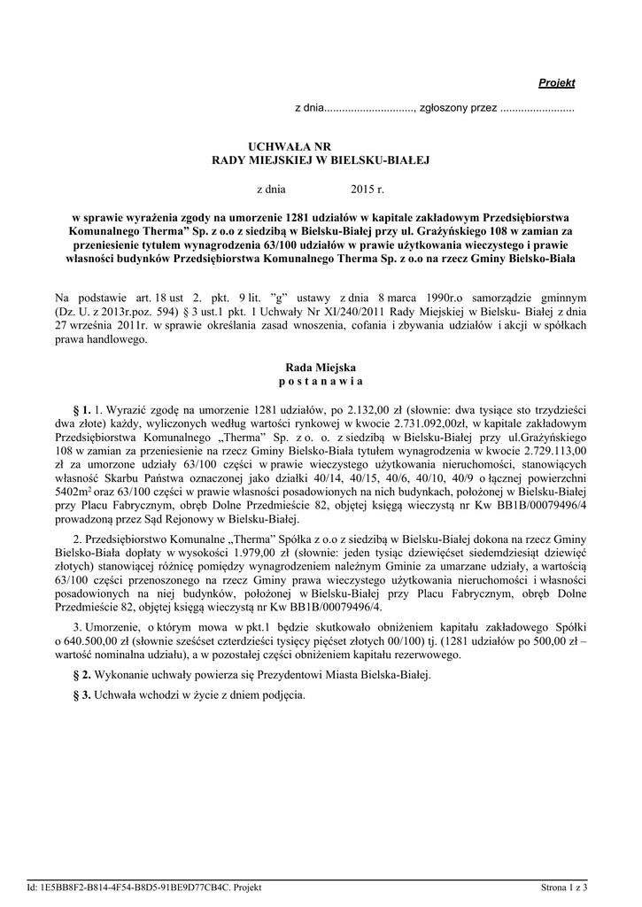 Projekt z dnia.............................., zgłoszony przez ......................... UCHWAŁA NR RADY MIEJSKIEJ W BIELSKU-BIAŁEJ z dnia 2015 r. w sprawie wyrażenia zgody na umorzenie 1281 udziałów w kapitale zakładowym Przedsiębiorstwa Komunalnego Therma” Sp. z o.o z siedzibą w Bielsku-Białej przy ul. Grażyńskiego 108 w zamian za przeniesienie tytułem wynagrodzenia 63/100 udziałów w prawie użytkowania wieczystego i prawie własności budynków Przedsiębiorstwa Komunalnego Therma Sp. z o.o na rzecz Gminy Bielsko-Biała Na podstawie art. 18 ust 2. pkt. 9 lit. ”g” ustawy z dnia 8 marca 1990r.o samorządzie gminnym (Dz. U. z 2013r.poz. 594) § 3 ust.1 pkt. 1 Uchwały Nr XI/240/2011 Rady Miejskiej w Bielsku- Białej z dnia 27 września 2011r. w sprawie określania zasad wnoszenia, cofania i zbywania udziałów i akcji w spółkach prawa handlowego. Rada Miejska postanawia § 1. 1. Wyrazić zgodę na umorzenie 1281 udziałów, po 2.132,00 zł (słownie: dwa tysiące sto trzydzieści dwa złote) każdy, wyliczonych według wartości rynkowej w kwocie 2.731.092,00zł, w kapitale zakładowym Przedsiębiorstwa Komunalnego „Therma” Sp. z o. o. z siedzibą w Bielsku-Białej przy ul.Grażyńskiego 108 w zamian za przeniesienie na rzecz Gminy Bielsko-Biała tytułem wynagrodzenia w kwocie 2.729.113,00 zł za umorzone udziały 63/100 części w prawie wieczystego użytkowania nieruchomości, stanowiących własność Skarbu Państwa oznaczonej jako działki 40/14, 40/15, 40/6, 40/10, 40/9 o łącznej powierzchni 5402m2 oraz 63/100 części w prawie własności posadowionych na nich budynkach, położonej w Bielsku-Białej przy Placu Fabrycznym, obręb Dolne Przedmieście 82, objętej księgą wieczystą nr Kw BB1B/00079496/4 prowadzoną przez Sąd Rejonowy w Bielsku-Białej. 2. Przedsiębiorstwo Komunalne „Therma” Spółka z o.o z siedzibą w Bielsku-Białej dokona na rzecz Gminy Bielsko-Biała dopłaty w wysokości 1.979,00 zł (słownie: jeden tysiąc dziewięćset siedemdziesiąt dziewięć złotych) stanowiącej różnicę pomiędzy wynagrodzeniem należnym Gminie za umarzane udziały, a wartością 63/100 części przenoszonego na rzecz Gminy prawa wieczystego użytkowania nieruchomości i własności posadowionych na niej budynków, położonej w Bielsku-Białej przy Placu Fabrycznym, obręb Dolne Przedmieście 82, objętej księgą wieczystą nr Kw BB1B/00079496/4. 3. Umorzenie, o którym mowa w pkt.1 będzie skutkowało obniżeniem kapitału zakładowego Spółki o 640.500,00 zł (słownie sześćset czterdzieści tysięcy pięćset złotych 00/100) tj. (1281 udziałów po 500,00 zł – wartość nominalna udziału), a w pozostałej części obniżeniem kapitału rezerwowego. § 2. Wykonanie uchwały powierza się Prezydentowi Miasta Bielska-Białej. § 3. Uchwała wchodzi w życie z dniem podjęcia. Id: 1E5BB8F2-B814-4F54-B8D5-91BE9D77CB4C. Projekt Strona 1 z 3 Uzasadnienie Przedsiębiorstwo Komunalne „Therma” Spółka z o. o. z siedzibą w Bielsku-Białej przy ul. Grażyńskiego 108 zwróciła się do Gminy z wnioskiem o wyrażenie zgody na umorzenie części udziałów w Spółce w zamian za przeniesienie 63/100 udziałów w prawie użytkowania wieczystego działek stanowiących własność Skarbu Państwa oznaczonych jako 40/6, 40/9, 40/10, 40/14, 40/15 o łącznej powierzchni 5402 m 2 i własności posadowionych na nich budynków PK „Therma” Sp. z o. o. na rzecz Gminy Bielsko-Biała i z tym związane obniżenie kapitału zakładowego. Gmina Bielsko-Biała jest w posiadaniu 37/100 udziałów w prawie użytkowania wieczystego w/w działek i własności posadowionych na niej budynków. Gmina otrzymała prawo użytkowania wieczystego gruntu położonego przy Pl. Fabrycznym i własność budynków w zamian za zaległości podatkowe, natomiast PK „Therma” w zamian za wierzytelności powstałe z tytułu sprzedanego ciepła. Gmina stanie się jedynym użytkownikiem wieczystym w/w nieruchomości i właścicielem posadowionych na niej budynków. Na przedmiotowych działkach znajdują się: dz. 40/15 obręb 82 Dolne Przedmieście o pow. 2131 m 2 zabudowana częścią budynku, dz. 40/14 o powierzchni 788 m 2 : zabudowana budynkiem mieszkalno – usługowym (byłego hotelu robotniczego) . Obecnie w budynku mieszczą się lokale socjalne, dz. 40/6 o pow. 903 m 2 : zabudowana budynkiem administracyjnym, dz. 40/10 o pow. 152 m 2 (niezabudowana). Działka wykorzystywana jako parking, nawierzchnia utwardzona tłuczniem kamiennym, dz.40/9 o pow. 1428 m2 zabudowana kompleksem budynków o funkcji usługowo-handlowej. Obniżeniu ulega kapitał zakładowy o kwotę 640.500,00 zł (iloczyn 1281 udziałów o wartości nominalnej 500,00 zł za 1 udział) oraz kapitał rezerwowy o kwotę 2.090.592,00 zł (liczony jako różnica pomiędzy wynagrodzeniem należnym Gminie za umarzane udziały tj. 2.731.092,00 zł. a obniżanym kapitałem zakładowym 640.500,00 zł). Wartość 63/100 części nieruchomości PK Therma oszacowana została przez rzeczoznawcę majątkowego na kwotę 2.729.113,00 zł (słownie: dwa miliony siedemset dwadzieścia dziewięć tysięcy sto trzynaście złotych). Natomiast wartość wynagrodzenia należnego Gminie za umorzone udziały wyliczona przez biuro rachunkowe wynosi 2.731.092,00 zł (słownie: dwa miliony siedemset trzydzieści jeden tysięcy dziewięćdziesiąt dwa złote) tj. 1281 udziałów po wartości rynkowej 2.132,00 zł (słownie: dwa tysiące sto trzydzieści dwa złote) za jeden udział. Przedsiębiorstwo Komunalne „Therma” Spółka z ograniczoną odpowiedzialnością z siedzibą w BielskuBiałej dokona na rzecz Gminy Bielsko-Biała dopłaty w wysokości 1.979,00 zł (słownie: jeden tysiąc dziewięćset siedemdziesiąt dziewięć złotych) stanowiącej różnicę pomiędzy wynagrodzeniem należnym Gminie za umarzane udziały, a wartością 63/100 części przenoszonej na rzecz Gminy nieruchomości. W związku z opodatkowaniem zb