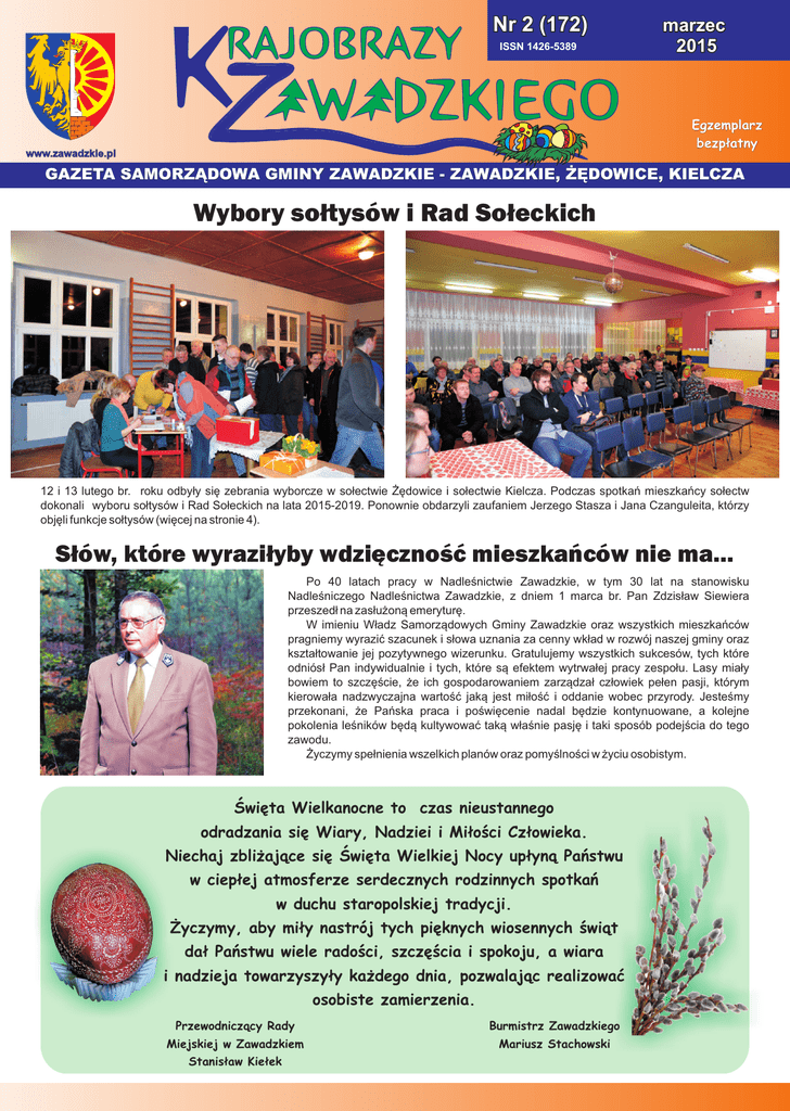Nr 2 (172) ISSN 1426-5389 marzec 2015 Egzemplarz bezp³atny www.zawadzkie.pl GAZETA SAMORZ¥DOWA GMINY ZAWADZKIE - ZAWADZKIE, ¯ÊDOWICE, KIELCZA Wybory so³tysów i Rad So³eckich 12 i 13 lutego br. roku odby³y siê zebrania wyborcze w so³ectwie ¯êdowice i so³ectwie Kielcza. Podczas spotkañ mieszkañcy so³ectw dokonali wyboru so³tysów i Rad So³eckich na lata 2015-2019. Ponownie obdarzyli zaufaniem Jerzego Stasza i Jana Czanguleita, którzy objêli funkcje so³tysów (wiêcej na stronie 4). S³ów, które wyrazi³yby wdziêcznoœæ mieszkañców nie ma... Po 40 latach pracy w Nadleœnictwie Zawadzkie, w tym 30 lat na stanowisku Nadleœniczego Nadleœnictwa Zawadzkie, z dniem 1 marca br. Pan Zdzis³aw Siewiera przeszed³ na zas³u¿on¹ emeryturê. W imieniu W³adz Samorz¹dowych Gminy Zawadzkie oraz wszystkich mieszkañców pragniemy wyraziæ szacunek i s³owa uznania za cenny wk³ad w rozwój naszej gminy oraz kszta³towanie jej pozytywnego wizerunku. Gratulujemy wszystkich sukcesów, tych które odniós³ Pan indywidualnie i tych, które s¹ efektem wytrwa³ej pracy zespo³u. Lasy mia³y bowiem to szczêœcie, ¿e ich gospodarowaniem zarz¹dza³ cz³owiek pe³en pasji, którym kierowa³a nadzwyczajna wartoœæ jak¹ jest mi³oœæ i oddanie wobec przyrody. Jesteœmy przekonani, ¿e Pañska praca i poœwiêcenie nadal bêdzie kontynuowane, a kolejne pokolenia leœników bêd¹ kultywowaæ tak¹ w³aœnie pasjê i taki sposób podejœcia do tego zawodu. ¯yczymy spe³nienia wszelkich planów oraz pomyœlnoœci w ¿yciu osobistym. Œwiêta Wielkanocne to czas nieustannego odradzania siê Wiary, Nadziei i Mi³oœci Cz³owieka. Niechaj zbli¿aj¹ce siê Œwiêta Wielkiej Nocy up³yn¹ Pañstwu w ciep³ej atmosferze serdecznych rodzinnych spotkañ w duchu staropolskiej tradycji. ¯yczymy, aby mi³y nastrój tych piêknych wiosennych œwi¹t da³ Pañstwu wiele radoœci, szczêœcia i spokoju, a wiara i nadzieja towarzyszy³y ka¿dego dnia, pozwalaj¹c realizowaæ osobiste zamierzenia. Przewodnicz¹cy Rady Burmistrz Zawadzkiego Miejskiej w Zawadzkiem Mariusz Stachowski Stanis³aw Kie³ek Krajobrazy Zawadzkiego V Sesja Rady Miejskiej w Zawadzkiem W dniu 23 lutego 2015 r. odby³a siê V sesja Rady Miejskiej w Zawadzkiem. G³ównym tematem sesji by³o przyjêcie informacji o stanie bezpieczeñstwa i porz¹dku publicznego w rejonie dzia³ania Komisariatu Policji w Zawadzkiem w 2014 r. Szczegó³owa informacja na powy¿szy temat zosta³a przed³o¿ona w formie pisemnej przez Komendanta Komisariatu Policji w Zawadzkiem Arkadiusza Chêtnickiego, który na sesji przedstawi³ równie¿ statystyki dotycz¹ce wykorzystania œrodków finansowych z bud¿etu gminy Zawadzkie na zwiêkszenie iloœci patroli w czasie przekraczaj¹cym normê okreœlon¹ przepisami ustawy o policji. Sprawozdanie komendanta zosta³o przyjête przez radnych jednog³oœnie. W dalszej kolejnoœci porz¹dku obrad sesji zosta³y podjête uchwa³y: - w sprawie zmiany uchwa³y Nr III/10/14 Rady Miejskiej w Zawadzkiem z dnia 29 grudnia 2014 r. w sprawie uchwa³y bud¿etowej na 2015 r. (zmiany dotycz¹ wprowadzenia do bud¿etu gminy dotacji otrzymanych z Opolskiego Urzêdu Wojewódzkiego w zakresie pomocy spo³ecznej) – uchwa³a zosta³a podjêta jednog³oœnie; - w sprawie przekazania œrodków finansowych dla Policji - dotyczy pokrycia kosztów rekompensaty pieniê¿nej policjantom Komisariatu Policji w Zawadzkiem w celu zwiêkszenia iloœci patroli w czasie przekraczaj¹cym normê okreœlon¹ przepisami ustawy o Policji – uchwa³a zosta³a podjêta jednog³oœnie; - w sprawie wyra¿enia zgody na wyodrêbnienie w bud¿ecie gminy œrodków stanowi¹cych fundusz so³ecki – fundusz so³ecki to pieni¹dze w bud¿ecie gminy zagwarantowane dla so³ectwa na realizacjê zadañ w³asnych gminy, które s³u¿¹ poprawie warunków ¿ycia mieszkañców i s¹ zgodne ze strategi¹ rozwoju gminy – uchwa³a zosta³a podjêta jednog³oœnie; - w sprawie wyboru metody i ustalenia wysokoœci stawki op³aty za gospodarowanie odpadami komunalnymi – 1 lutego 2015 r. wesz³a w ¿ycie nowelizacja ustawy o utrzymaniu czystoœci i porz¹dku w gminach. W zwi¹zku z tym Rada Miejska zobligowana zosta³a do zmiany przepisów prawa miejscowego obowi¹zuj¹cych na terenie naszej gminy z zakresu gospodarki odpadami. Dotychczasowa uchwa³a w sprawie metody i stawki straci³a moc, wiêc w pierwszej kolejnoœci nale¿a³o uchwaliæ now¹ uchwa³ê w tej sprawie – uchwa³a zosta³a podjêta jednog³oœnie; - w sprawie okreœlenia kryteriów i liczby punktów przyznanych ka¿demu z kryteriów, obowi¹zuj¹cych na drugim etapie postêpowania rekrutacyjnego do przedszkoli publicznych prowadzonych przez Gminê Zawadzkie oraz dokumentów niezbêdnych do potwierdzenia tych kryteriów – rodzice spe³niaj¹ce kryteria wymienione w uchwale otrzymaj¹ dodatkowe punkty, które zwiêksz¹ szanse na przyjêcie do przedszkola, kryteria te maj¹ na celu zaspokojenie potrzeb spo³ecznoœci lokalnej – uchwa³a zosta³a podjêta jednog³oœnie; - w sprawie wyra¿enia zgody na odst¹pienie od ¿¹dania zwrotu bonifikaty udzielonej przy sprzeda¿y lokalu mieszkalnego – uchwa³a zosta³a podjêta stosunkiem g³osów 7 „za”, przy 5 g³osach „wstrzymuj¹cych siê”; - w sprawie zmiany Uchwa³y Nr XIII/97/11 Rady Miejskiej w Zawadzkiem z dnia 21 listopada 2011 r. w sprawie przyjêcia „Programu usuwania azbestu i wyrobów zawieraj¹cych azbest z terenu Gminy Zawadzkie na lata 2011 – 2032” zmienionej Uchwa³¹ Nr XXX/334/13 Rady Miejskiej w Zawadzkiem z dnia 25 marca 2013 r. oraz Uchwa³¹ Nr XL/409/14 Rady Miejskiej w Zawadzkiem z dnia 24 lutego 2014 r. – w uchwale dokonano aktualizacji miejsc i iloœci wystêpowania wyrobów zawieraj¹cych azbest - uchwa³a zosta³a podjêta stosunkiem g³osów 12 „za”, przy 1 g³osie „wstrzymuj¹cym siê”; - zmieniaj¹ca Uchwa³ê Nr XIII/98/11 Rady Miejskiej w Zawadzkiem z dnia 21 listopada 2011 r. w sprawie 