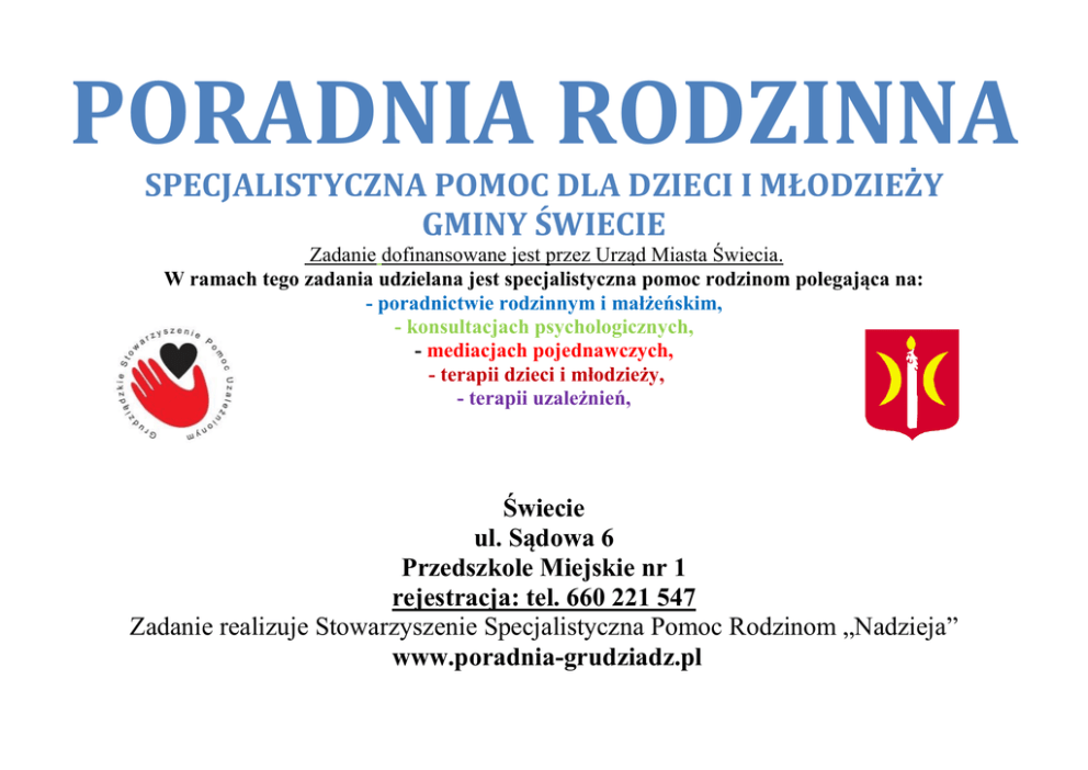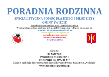 PORADNIA RODZINNA SPECJALISTYCZNA POMOC DLA DZIECI I MŁODZIEŻY GMINY ŚWIECIE Zadanie dofinansowane jest przez Urząd Miasta Świecia. W ramach tego zadania udzielana jest specjalistyczna pomoc rodzinom polegająca na: - poradnictwie rodzinnym i małżeńskim, - konsultacjach psychologicznych, - mediacjach pojednawczych, - terapii dzieci i młodzieży, - terapii uzależnień, Świecie ul. Sądowa 6 Przedszkole Miejskie nr 1 rejestracja: tel. 660 221 547 Zadanie realizuje Stowarzyszenie Specjalistyczna Pomoc Rodzinom „Nadzieja” www.poradnia-grudziadz.pl