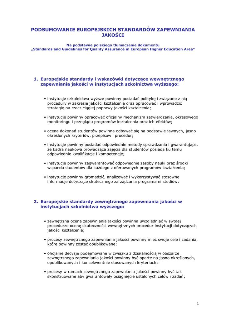 PODSUMOWANIE EUROPEJSKICH STANDARDÓW ZAPEWNIANIA JAKOŚCI Na podstawie polskiego tłumaczenie dokumentu „Standards and Guidelines for Quality Assurance in European Higher Education Area” 1. Europejskie standardy i wskazówki dotyczące wewnętrznego zapewniania jakości w instytucjach szkolnictwa wyższego: • instytucje szkolnictwa wyższe powinny posiadać politykę i związane z nią procedury w zakresie jakości kształcenia oraz opracować i wprowadzić strategię na rzecz ciągłej poprawy jakości kształcenia; • instytucje powinny opracować oficjalny mechanizm zatwierdzania, okresowego monitoringu i przeglądu programów kształcenia oraz ich efektów; • ocena dokonań studentów powinna odbywać się na podstawie jawnych, jasno określonych kryteriów, przepisów i procedur; • instytucje powinny posiadać odpowiednie metody sprawdzania i gwarantujące, że kadra naukowa prowadząca zajęcia dla studentów posiada ku temu odpowiednie kwalifikacje i kompetencje; • instytucje powinny zagwarantować odpowiednie zasoby nauki oraz środki wsparcia studentów dla każdego z oferowanych programów kształcenia; • instytucje powinny gromadzić, analizować i wykorzystywać stosowne informacje dotyczące skutecznego zarządzania programami studiów; 2. Europejskie standardy zewnętrznego zapewniania jakości w instytucjach szkolnictwa wyższego: • zewnętrzna ocena zapewniania jakości powinna uwzględniać w swojej procedurze ocenę skuteczności wewnętrznych procedur instytucji dotyczących jakości kształcenia; • procesy zewnętrznego zapewniania jakości powinny mieć swoje cele i zadania, które powinny zostać opublikowane; • oficjalne decyzje podejmowane w związku z działalnością w obszarze zewnętrznego zapewniania jakości powinny być oparte na jasno określonych, opublikowanych i konsekwentnie stosowanych kryteriach; • procesy w ramach zewnętrznego zapewniania jakości powinny być tak skonstruowane aby gwarantowały osiągnięcie ustalonych celów i zadań; 1 • należy publikować raporty, które powinny być zrozumiałe przystępne dla czytelnika; • procesy zapewniania jakości zawierające zalecenia odnośnie dalszego działania lub wymagające wprowadzenia zmian powinny posiadać ustaloną z góry procedurę uzupełniającą; • należy cyklicznie podejmować działania w zakresie zewnętrznego zapewniania jakości; • agencje zapewniania jakości powinny okresowo sporządzać zbiorcze raporty zwierające omówienia i analizą ogólnych wniosków; 3. Europejskie standardy dotyczące agencji zewnętrznego zapewniania jakości: • zewnętrzne zapewnianie jakości agencji powinno uwzględniać obecność i skuteczność procesów zewnętrznego zapewniania jakości; • kompetentne władze publiczne Europejskiego Obszaru Szkolnictwa Wyższego powinny formalnie uznać daną agencję za organy odpowiedzialne; agencja zaś zobowiązana jest do prowadzenia swojej działalności w oparciu o obowiązujące podstawy prawne oraz spełnia wymagania w ramach jurysdykcji w której funkcjonuje; • agencje powinny regularnie podejmować działania w zakresie zewnętrznego zapewniania jakości (na szczeblu instytucjonalnym lub programowym); • agencje powinny dysponować dostatecznymi i proporcjonalnymi zasobami zarówno finansowymi jak i personalnymi, umożliwiającymi skuteczne organizowanie i prowadzenie procesów zewnętrznego zapewniania jakości; • agencja powinna pracować w oparciu o jasne i wyraźnie określone cele i zadania ujęte w deklaracji programowej agencji; • agencje powinny być niezależne w takim stopniu, aby ponosiły niezależną odpowiedzialność a tytułu prowadzonej działalności i nie podlegały oddziaływaniu ze strony osób trzecich; • stosowane przez agencję kryteria i procedury powinny być określone z wyprzedzeniem i powszechnie dostępne; przyjmuje się, że proces zewnętrznego zapewniania jakości powinien zawierać: samoocenę lub równorzędną procedurę przeprowadzoną przez jednostkę będącą podmiotem procesu zapewniania jakości, zewnętrzną oceną dokonaną przez ekspertów, publikację raportu zawierającego decyzje, zalecenia i inne formalne rezultaty, procedury uzupełniające w celu analizy działań podjętych przez jednostkę będącą podmiotem procesu; • agencja powinna posiadać procedury w zakresie własnej odpowiedzialności; 2