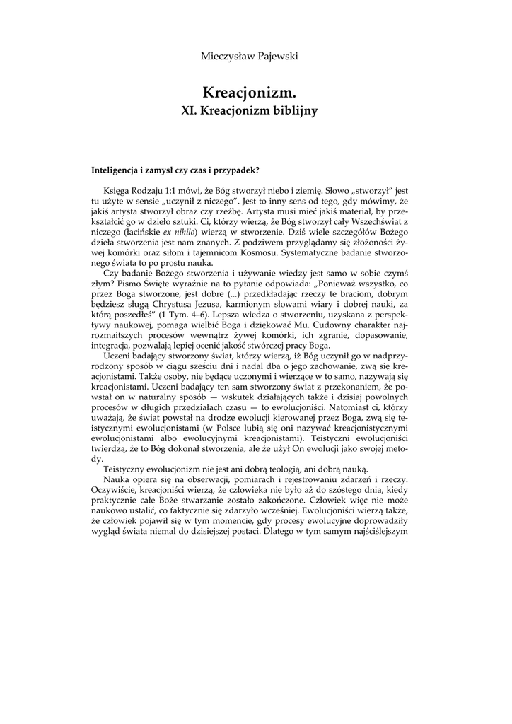 Mieczysław Pajewski Kreacjonizm. XI. Kreacjonizm biblijny Inteligencja i zamysł czy czas i przypadek? Księga Rodzaju 1:1 mówi, że Bóg stworzył niebo i ziemię. Słowo „stworzył” jest tu użyte w sensie „uczynił z niczego”. Jest to inny sens od tego, gdy mówimy, że jakiś artysta stworzył obraz czy rzeźbę. Artysta musi mieć jakiś materiał, by przekształcić go w dzieło sztuki. Ci, którzy wierzą, że Bóg stworzył cały Wszechświat z niczego (łacińskie ex nihilo) wierzą w stworzenie. Dziś wiele szczegółów Bożego dzieła stworzenia jest nam znanych. Z podziwem przyglądamy się złożoności żywej komórki oraz siłom i tajemnicom Kosmosu. Systematyczne badanie stworzonego świata to po prostu nauka. Czy badanie Bożego stworzenia i używanie wiedzy jest samo w sobie czymś złym? Pismo Święte wyraźnie na to pytanie odpowiada: „Ponieważ wszystko, co przez Boga stworzone, jest dobre (...) przedkładając rzeczy te braciom, dobrym będziesz sługą Chrystusa Jezusa, karmionym słowami wiary i dobrej nauki, za którą poszedłeś” (1 Tym. 4–6). Lepsza wiedza o stworzeniu, uzyskana z perspektywy naukowej, pomaga wielbić Boga i dziękować Mu. Cudowny charakter najrozmaitszych procesów wewnątrz żywej komórki, ich zgranie, dopasowanie, integracja, pozwalają lepiej ocenić jakość stwórczej pracy Boga. Uczeni badający stworzony świat, którzy wierzą, iż Bóg uczynił go w nadprzyrodzony sposób w ciągu sześciu dni i nadal dba o jego zachowanie, zwą się kreacjonistami. Także osoby, nie będące uczonymi i wierzące w to samo, nazywają się kreacjonistami. Uczeni badający ten sam stworzony świat z przekonaniem, że powstał on w naturalny sposób — wskutek działających także i dzisiaj powolnych procesów w długich przedziałach czasu — to ewolucjoniści. Natomiast ci, którzy uważają, że świat powstał na drodze ewolucji kierowanej przez Boga, zwą się teistycznymi ewolucjonistami (w Polsce lubią się oni nazywać kreacjonistycznymi ewolucjonistami albo ewolucyjnymi kreacjonistami). Teistyczni ewolucjoniści twierdzą, że to Bóg dokonał stworzenia, ale że użył On ewolucji jako swojej metody. Teistyczny ewolucjonizm nie jest ani dobrą teologią, ani dobrą nauką. Nauka opiera się na obserwacji, pomiarach i rejestrowaniu zdarzeń i rzeczy. Oczywiście, kreacjoniści wierzą, że człowieka nie było aż do szóstego dnia, kiedy praktycznie całe Boże stwarzanie zostało zakończone. Człowiek więc nie może naukowo ustalić, co faktycznie się zdarzyło wcześniej. Ewolucjoniści wierzą także, że człowiek pojawił się w tym momencie, gdy procesy ewolucyjne doprowadziły wygląd świata niemal do dzisiejszej postaci. Dlatego w tym samym najściślejszym 74 Problemy genezy, t. XV (2007), nr 1–2 (215–216) sensie słowa „nauka” ewolucjonista także nie jest w stanie naukowo ustalić (zaobserwować, zmierzyć i zarejestrować) tzw. fakt ewolucji. Obie te grupy, kreacjoniści i ewolucjoniści, mogą jedynie obserwować i mierzyć dzisiaj istniejący świat, by — jak detektywi — próbować na tej podstawie ustalić, co najprawdopodobniej się zdarzyło w przeszłości: stworzenie czy ewolucja? Jeśli świat powstał tak, jak twierdzą ewolucjoniści, to przyczyną świata, który dzisiaj obserwujemy, jest czas i przypadek. Ale jeśli świat powstał tak, jak wierzą kreacjoniści, to obecny świat został utworzony przez Boga, projekt i inteligencję. Mamy więc pięć pojęć: czas, przypadek, Bóg, projekt i inteligencja. O których z nich wspomina Pismo? Przyjrzyjmy się kilku tekstom: Każdy bowiem dom jest przez kogoś zbudowany, a Tym, który zbudował wszystko, jest Bóg (Hebr. 3:4). Niebiosa głoszą chwałę Boga, dzieło rąk Jego obwieszcza nieboskłon (Ps. 19:2). A co mówią wyniki badania świata? Czy przekonują nas, że rzeczywistość powstała dzięki czasowi i przypadkowi (ewolucja) czy może dzięki projektowi i inteligencji Boga (stworzenie)? Przyjrzyjmy się następującemu faktowi: Ziemia znajduje się w dokładnie właściwej odległości od Słońca. Gdybyśmy byli nawet jeden procent bliżej lub jeden procent dalej, to zmieniłoby to na tyle warunki na powierzchni naszej planety, że życie na niej stałoby się niemożliwe. Czy fakt ten wskazuje na przypadek czy na projekt? Albo taki fakt: Woda należy do bardzo nielicznych cieczy, które rozszerzają się przy zamarzaniu (gdy powstaje lód). Gdyby woda wówczas gęstniała, jak to jest z większością cieczy, opadałaby na dno jezior czy rzek. Wówczas niemal wszystkie jeziora i rzeki położone na północy zamarzałyby całkowicie, niszcząc niemal całe życie wodne. Czy ten ważny wyjątek od naturalnego zachowania się cieczy wskazuje na projekt czy przypadek? Są to przykłady, jak kreacjonista widzi własności świata. Celem kreacjonisty jest tylko zilustrowanie zamysłów Bożych, a wśród tych zamysłów największy dotyczy zbawienia dzięki ofierze Jezusa Chrystusa za nasze grzechy. Ewangelia Jana 1:1–3 pokazuje, że Syn Boży, nasz Odkupiciel, miał wiele wspólnego ze stworzeniem. „Bez Niego nic się nie stało, co się stało” (w. 3). Choć już teraz możemy cieszyć się z błogosławieństwa Jego zbawienia, to całe stworzenie jęczy razem z nami pod brzemieniem grzechu, oczekując na Jego ostateczny powrót i usunięcie wszelkiego grzechu oraz jego skutków. Czytamy o tym w Liście do Rzymian 8:18–23. Tylko Boża łaska, Jego zbawcza moc, może pomóc nam i całemu stworzeniu. Kreacjonista powołuje się na odkryte fakty, by świadczyć o tej łasce i wychwalać Boga. Biblia a nauka Pierwszy wiersz Księgi Rodzaju zawiera dwa niezwykle ważne pojęcia współczesnej fizyki. Wierzący uczyli się o nich przez tysiące lat, nie zdając sobie sprawy z tego. Po pierwsze, zwrot „na początku” dotyczy czasu. Mamy tu do czynienia z początkiem czasu. Bóg, będący Duchem, istnieje poza czasem. C
