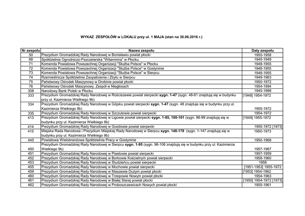 WYKAZ ZESPOŁÓW w LOKALU przy ul. 1 MAJA (stan na 30.06.2016 r.) Nr zespołu 50 68 71 72 73 74 75 76 308 333 334 335 413 414 415 445 450 451 452 453 455 459 460 461 462 Nazwa zespołu Prezydium Gromadzkiej Rady Narodowej w Bonisławiu powiat płocki Spółdzielnia Ogrodniczo-Pszczelarska "Witanmina" w Płocku Komenda Powiatowa Powszechnej Organizacji "Służba Polsce" w Płocku Komenda Powiatowa Powszechnej Organizacji "Służba Polsce" w Gostyninie Komenda Powiatowa Powszechnej Organizacji "Służba Polsce" w Sierpcu Rzemieślnicza Spółdzielnia Zaopatrzenia i Zbytu w Sierpcu Państwowy Ośrodek Maszynowy w Drobinie powiat płocki Państwowy Ośrodek Maszynowy. Zespół w Niegłosach Narodowy Bank Polski w Płocku Prezydium Gromadzkiej Rady Narodowej w Rościszewie powiat sierpecki sygn. 1-47 (sygn. 48-61 znajdują się w budynku przy ul. Kazimierza Wielkiego 9b) Prezydium Gromadzkiej Rady Narodowej w Gójsku powiat sierpecki sygn. 1-47 (sygn. 48 znajduje się w budynku przy ul. Kazimierza Wielkiego 9b) Prezydium Gromadzkiej Rady Narodowej w Szczutowie powiat sierpecki Prezydium Gromadzkiej Rady Narodowej w Ligowie powiat sierpecki sygn. 1-95, 100-101 (sygn. 96-99 znajdują się w budynku przy ul. Kazimierza Wielkiego 9b) Prezydium Gromadzkiej Rady Narodowej w Gozdowie powiat sierpecki Miejska Rada Narodowa i Prezydium Miejskiej Rady Narodowej w Sierpcu sygn. 148-178 (sygn. 1-147 znajdują się w budynku przy ul. Kazimierza Wielkiego 9b) Powiatowa Wielobranżowa Spółdzielnia Pracy w Gostyninie Prezydium Gromadzkiej Rady Narodowej w Sierpcu sygn. 1-95 (sygn. 96-106 znajdują się w budynku przy ul. Kazimierza Wielkiego 9b) Prezydium Gromadzkiej Rady Narodowej w Piastowie powiat sierpecki Prezydium Gromadzkiej Rady Narodowej w Borkowie Kościelnym powiat sierpecki Prezydium Gromadzkiej Rady Narodowej w Studzieńcu powiat sierpecki Prezydium Gromadzkiej Rady Narodowej w Mochowie powiat sierpecki Prezydium Gromadzkiej Rady Narodowej w Maszewie Dużym powiat płocki Prezydium Gromadzkiej Rady Narodowej w Trzepowie Nowym powiat płocki Prezydium Gromadzkiej Rady Narodowej w Białej Starej powiat płocki Prezydium Gromadzkiej Rady Narodowej w Proboszczewicach Nowych powiat płocki Daty zespołu 1955-1958 1945-1949 1948-1955 1948-1955 1948-1955 1949-1963 1950-1972 1954-1994 1945-1998 [1948] 1954-1972 1955-1972 1954-1972 [1949] 1955-1972 1955-1972 [1973] 1950-1973 1950-1968 1957-1967 1957-1959 1958-1960 1958 [1951-1953] 1955-1972 [1953] 1954-1962 1954-1963 [1950] 1954-1972 [1973] 1955-1961 463 465 468 483 Prezydium Gromadzkiej Rady Narodowej w Zągotach powiat płocki Prezydium Gromadzkiej Rady Narodowej w Zawidzu powiat sierpecki Prezydium Gromadzkiej Rady Narodowej w Rembielinie powiat płocki Rejonowe Przedsiębiorstwo Młynów Gospodarczych Przedsiebiorstwo Państwowe w Płocku 489 Wojewódzki Komitet Frontu Jedności Narodu w Płocku 1975-1984 493 Rada Wojewódzka Patriotycznego Ruchu Odrodzenia Narodowego w Płocku 1982-1989 494 Delegatura Najwyższej Izby Kontroli w Warszwie. Wojewódzki Oddział do spraw Inspekcji Robotniczo-Chłopskiej w Płocku 1985-1989 495 Centralny Związek Spółdzielni "Samopomoc Chłopska" Terenowy Zespół Lustracji w Płocku 1975-1989 496 513 Akta komisji wyborczych do rad narodowych z terenu województwa płockiego z wyborów przeprowadzonych w dniu 19.06.1988 r. Przedsiębiorstwo Robót Instalacyjno-Montażowych Budownictwa Rolniczego w Drobinie 514 515 516 517 518 519 Rejonowe Przedsiębiorstwo Melioracyjne w Płocku Przedsiębiorstwo Transportowe Handlu Wewnętrznego w Płocku Prezydium Gromadzkiej Rady Narodowej w Podgórzu powiat płocki Prezydium Gromadzkiej Rady Narodowej w Rębowie powiat płocki Płocki Kombinat Budowlany w Płocku Płockie Przedsiębiorstwo Konstrukcji Stalowych i Urządzeń Przemysłowych "Mostostal" w Płocku 520 Akta komisji wyborczych do Sejmu PRL i rad narodowych z terenu powiatu sierpeckiego z wyborów przeprowadzonych w dniu 30.05.1965 r. Akta komisji wyborczych do Sejmu PRL i rad narodowych z terenu powiatu sierpeckiego z wyborów przeprowadzonych w dniu 01.06.1969 r. 521 522 525 526 527 528 530 531 537 541 542 1955-1969 1955-1972 1954-1972 [1945] 1952-1962 1988 1957-1994 1964-1993 1973-1991 1955-1969 [1950] 1955-1969 1950-1991 1963-1992 1965 1969 1972 Akta komisji wyborczych do Sejmu PRL z terenu powiatu sierpeckiego z wyborów przeprowadzonych w dniu 19.03.1972r. Państwowe Gospodarstwo Rolne w Górach Komitet Wojewódzki Polskiej Zjednoczonej Partii Robotniczej w Płocku Okręgowa Spółdzielnia Mleczarska w Płocku Zakład Stolarki Budowlanej "Stolbud" w Płocku Przedsiębiorstwo Budownictwa Komunalnego w Płocku Przedsiębiorstwo Remontowo-Montażowe w Sierpcu Ubezpieczalnia Społeczna w Płocku Prezydium Gromadzkiej Rady Narodowej w Lelicach powiat sierpecki Prezydium Gromadzkiej Rady Narodowej w Kurowie powiat sierpecki 1968-1993 [1945] 1975-1990 1939-1993 1950-1997 1951-1995 1973-1991 1934-1951 1954-1972 1956-1965 543 544 545 551 552 553 555 556 557 558 559 560 561 562 563 568 569 570 571 572 573 575 576 577 579 580 581 582 583 584 585 586 587 588 589 Gminna Rada Narodowa w Gozdowie Urząd Gminy w Iłowie Gminna Rada Narodowa w Iłowie Gminna Rada Narodowa w Czerwińsku nad Wisłą Urząd Gminy w Czerwińsku nad Wisłą Urząd Miejski w Sierpcu sygn. 154-9633 (sygn. 1-153 znajdują się w budynku przy ul. Kazimierza Wielkiego 9b) Gminna Rada Narodowa w Nowym Duninowie Prezydium Gromadzkiej Rady Narodowej w Soczewce powiat gostyniński Prezydium Gromadzkiej Rady Narodowej w Duninowie Nowym powiat gostyniński Urząd Gminy w Nowym Duninowie Prezydium Gromadzkiej Rady Narodowej w Radzanowie powiat płocki Urząd Gminy w Radzanowie Gminna Rada Narodowa w Radzanowie Bank Inwestycyjny w Płocku Spółdzielnia Pracy Przemysłu Dziewiarskiego "Stilana" w Płocku Urząd Gminy w Kiernozi Gminna Rada Narodowa w Kiernozi Urząd Gminy w Brudzeniu Dużym Prezydium Gromadzkiej Rady Narodowej w Brudzeniu Dużym powiat płocki Pre