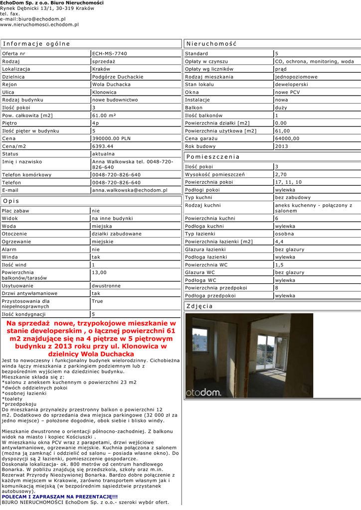 EchoDom Sp. z o.o. Biuro Nieruchomości Rynek Dębnicki 13/1, 30-319 Kraków tel. fax. e-mail:[email protected] www.nieruchomosci.echodom.pl Informacje ogólne Nieruchomość Oferta nr ECH-MS-7740 Standard 5 Rodzaj sprzedaż Opłaty w czynszu CO, ochrona, monitoring, woda Lokalizacja Kraków Opłaty wg liczników prąd Dzielnica Podgórze Duchackie Rodzaj mieszkania jednopoziomowe Rejon Wola Duchacka Stan lokalu deweloperski Ulica Klonowica Okna nowe PCV Rodzaj budynku nowe budownictwo Instalacje nowa Ilość pokoi 3 Balkon duży Pow. całkowita [m2] 61.00 m² Ilość balkonów 1 Piętro 4p Powierzchnia działki [m2] 0.00 Ilość pięter w budynku 5 Powierzchnia użytkowa [m2] 61,00 Cena 390000.00 PLN Cena garażu 64000,00 Cena/m2 6393.44 Rok budowy 2013 Status aktualna Imię i nazwisko Anna Walkowska tel. 0048-720826-640 Ilość pokoi 3 Telefon komórkowy 0048-720-826-640 Wysokość pomieszczeń 2,70 Telefon 0048-720-826-640 Powierzchnia pokoi 17, 11, 10 E-mail [email protected] Podłogi pokoi wylewka Typ kuchni bez zabudowy Rodzaj kuchni aneks kuchenny - połączony z salonem Opis Pomieszczenia Plac zabaw nie Widok na inne budynki Powierzchnia kuchni 6 Woda miejska Podłoga kuchni wylewka Otoczenie działki zabudowane Typ łazienki osobna Ogrzewanie miejskie Powierzchnia łazienki [m2] 4,4 Alarm nie Glazura łazienki bez glazury Winda tak Podłoga łazienki wylewka Ilość wind 1 Powierzchnia WC 1,5 Powierzchnia balkonów/tarasów 13,00 Glazura WC bez glazury Podłoga WC wylewka Usytuowanie dwustronne Powierzchnia przedpokoi 8 Drzwi antywłamaniowe tak Podłoga przedpokoi wylewka Przystosowania dla niepełnosprawnych True Ilość kondygnacji 5 Zdjęcia Na sprzedaż nowe, trzypokojowe mieszkanie w stanie developerskim , o łącznej powierzchni 61 m2 znajdujące się na 4 piętrze w 5 piętrowym budynku z 2013 roku przy ul. Klonowica w dzielnicy Wola Duchacka Jest to nowoczesny i funkcjonalny budynek wielorodzinny. Cichobieżna winda łączy mieszkania z parkingiem podziemnym lub z bezpośrednim wyjściem na dziedziniec budynku. Mieszkanie składa się z: *salonu z aneksem kuchennym o powierzchni 23 m2 *dwóch oddzielnych pokoi *osobnej łazienki *toalety *przedpokoju Do mieszkania przynależy przestronny balkon o powierzchni 12 m2. Dodatkowo do sprzedania dwa miejsca parkingowe (32 000 zł za jedno miejsce) – położone dogodnie, obok siebie i blisko windy. Mieszkanie dwustronne o orientacji północno-zachodniej. Z balkonu widok na miasto i kopiec Kościuszki . W mieszkaniu okna PCV wraz z parapetami, drzwi wejściowe antywłamaniowe, ogrzewanie miejskie. Kuchnia połączona z salonem (można ją zamknąć i oddzielić od salonu – posiada własne okno). Do dyspozycji są 2 łazienki, pomieszczenie gospodarcze. Doskonała lokalizacja- ok. 800 metrów od centrum handlowego Bonarka. W pobliżu znajdują się przedszkola, szkoły oraz m.in. Rezerwat Przyrody Nieożywionej Bonarka. Bardzo dobre połączenie z każdym miejscem w Krakowie, zarówno transportem własnym jak i komunikacją miejską (w bezpośrednim sąsiedztwie przystanek autobusowy). POLECAM I ZAPRASZAM NA PREZENTACJĘ!!! BIURO NIERUCHOMOŚCI EchoDom Sp. z o.o.- szeroki wybór ofert. Kompleksowa obsługa przy sprzedaży, wynajmie nieruchomości. Atrakcyjne propozycje kredytowe, sporządzane wedle potrzeb Klientów. ZAPEWNIAMY PROFESJONALIZM I BEZPIECZEŃSTWO ZAWIERANYCH TRANSAKCJI. © Wszelkie prawa zastrzeżone - EchoDom