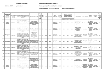 Na terenie GMINY: POMNIKI PRZYRODY Data wypełnienia formularza: 26.08.2010 r. gmina: Jawor Osoba wypełniająca formularz: Krystyna Pańczyk Kontakt: nr telefonu: 076 870 20 21 wew.232 Lp. 1 2 3 4 5 6 Nazwa pomnika przyrody Data utworzenia Obowiązująca podstawa prawna wraz z (jak w akcie pomnika oznaczeniem miejsca ogłoszenia aktu prawnym o przyrody prawnego ustanowieniu) Platan klonolistny Dąb szypułkowy Kasztanowiec biały Dąb szypułkowy Cis pospolity Dąb szypułkowy 7 Dąb szypułkowy 8 Platan klonolistny Opis pomnika przyrody 1996.12.04 Uchwała Nr XXXVI/206/96 Rady Platan klonolistny Miejskiej w Jaworze z dnia 4 grudnia (Platanus acerifolia) o 1996 w sprawie uznania drzew za obwodzie 305 cm, korona pomniki przyrody na terenie miasta rozłozysta Jawora 1996.12.04 Uchwała Nr XXXVI/206/96 Rady Miejskiej w Jaworze z dnia 4 grudnia Dąb szypułkowy (Quercus 1996 w sprawie uznania drzew za robur) o obwodzie 248 pomniki przyrody na terenie miasta cm, okazała korona Jawora 1996.12.04 Uchwała Nr XXXVI/206/96 Rady Miejskiej w Jaworze z dnia 4 grudnia 1996 w sprawie uznania drzew za pomniki przyrody na terenie miasta Jawora Obwód na wysoko Wys. ści 1,3 [m] m [cm] 305 25 Gmina Jawor Miejscowość Obręb ewidencyjny adres: e-mail: [email protected] Nr działki ewidencyj nej PołoŜenie geograficzne (długość geograficzna, szerokość geograficzna) Sprawujacy nadzór Opis lokalizacji Forma własności Powiat Jaworski Bi - zgodnie z zapisami w Burmistrz ewidencji Miasta Jawor gruntów NIE NIE stopnie [ ° ] minuty [ ' ] sekundy [ '' ] b.d. b.d. b.d. Rośnie przy ul. Szpitalnej 12a, w podwórzu Gmina Jawor B - zgodnie z zapisami w Burmistrz ewidencji Miasta Jawor gruntów Jawor obręb nr 7 Stare Miasto 189/4 b.d. b.d. b.d. Rośnie w centrum miasta przy ul. Staromiejskiej 1, w podwórzu 767/2 Rodzaj gruntów Ochrona w zakresie prawa międzyna rod. 350 20 Jawor Jawor obręb nr 7 Stare Miasto 301 23 Jawor Jawor obręb nr 7 Stare Miasto 391 b.d. b.d. b.d. Rośnie przy ul. Armii Krajowej 7, między drogami dojazdowymi Własność prywatna Bi - zgodnie z zapisami w Burmistrz ewidencji Miasta Jawor gruntów NIE 1996.12.04 Uchwała Nr XXXVI/206/96 Rady Miejskiej w Jaworze z dnia 4 grudnia Dąb szypułkowy (Quercus 1996 w sprawie uznania drzew za robur) o obwodzie 318 pomniki przyrody na terenie miasta cm, rozłoŜysta korona Jawora 318 20 Jawor Jawor obręb nr 7 Stare Miasto 391 b.d. b.d. b.d. Rośnie przy ul. Armii Krajowej 7, między drogami dojazdowymi Własność prywatna Bi - zgodnie z zapisami w Burmistrz ewidencji Miasta Jawor gruntów NIE 1996.12.04 Uchwała Nr XXXVI/206/96 Rady Miejskiej w Jaworze z dnia 4 grudnia 1996 w sprawie uznania drzew za pomniki przyrody na terenie miasta Jawora 157 9 Jawor Jawor obręb nr 7 Stare Miasto 339/4 b.d. b.d. b.d. Rośnie przy ul. Cichej 1, od strony ul. Łukasińskiego Gmina Jawor Bi - zgodnie z zapisami w Burmistrz ewidencji Miasta Jawor gruntów NIE 1996.12.04 Uchwała Nr XXXVI/206/96 Rady Miejskiej w Jaworze z dnia 4 grudnia Dąb szypułkowy (Quercus 1996 w sprawie uznania drzew za robur) o obwodzie 375 pomniki przyrody na terenie miasta cm, okazała korona Jawora 375 24 Jawor Jawor obręb nr 7 Stare Miasto 404 b.d. b.d. b.d. Rośnie przy ul. Pistowskiej 11, przy ogrodzeniu z posesją nr 10, pomiędzy budynkami Własność prywatna B - zgodnie z zapisami w Burmistrz ewidencji Miasta Jawor gruntów NIE 1996.12.04 Uchwała Nr XXXVI/206/96 Rady Dąb szypułkowy (Quercus Miejskiej w Jaworze z dnia 4 grudnia robur) o obwodzie 330 1996 w sprawie uznania drzew za cm, okazała, równomierna pomniki przyrody na terenie miasta korona Jawora 330 30 Jawor Jawor obręb nr 7 Stare Miasto 578 b.d. b.d. b.d. Rośnie przy ul. Przyjaciół śołnierza 9 Własność prywatna B - zgodnie z zapisami w Burmistrz ewidencji Miasta Jawor gruntów NIE 1996.12.04 Uchwała Nr XXXVI/206/96 Rady Platan klonolistny Miejskiej w Jaworze z dnia 4 grudnia (Platanus acerifolia) o 1996 w sprawie uznania drzew za obwodzie 340 cm, pomniki przyrody na terenie miasta okazała rozłoŜysta korona Jawora 340 20 Jawor Jawor obręb nr 7 Stare Miasto 266 b.d. b.d. b.d. Rośnie na naroŜniku ul. Reja i ul. Wrocławskiej Gmina Jawor - Bi - zgodnie uŜytkowanie z zapisami w Burmistrz wieczyste Bank ewidencji Miasta Jawor Spółdzielczy gruntów NIE Kasztanowiec biały (Aesculus hippocastanum) o obwodzie 301 cm, okazała, rozłoŜysta korona Cis pospolity (Taxus bacatta) o obwodzie 157 cm, okazała, rozłoŜysta korona 9 Dąb szypułkowy 10 Dąb czerwony 11 Platan klonolistny 12 13 14 Dąb szypułkowy Dąb szypułkowy Dąb szypułkowy 15 Platan klonolistny 16 Platan klonolistny 17 Lipa drobnolistna 18 Lipa drobnolistna 19 Lipa drobnolistna 1996.12.04 Uchwała Nr XXXVI/206/96 Rady Miejskiej w Jaworze z dnia 4 grudnia Dąb szypułkowy (Quercus 1996 w sprawie uznania drzew za robur) o obwodzie 380 pomniki przyrody na terenie miasta cm, okazała korona Jawora 1996.12.04 Uchwała Nr XXXVI/206/96 Rady Dąb czerwony (Quercus Miejskiej w Jaworze z dnia 4 grudnia rubra) o obwodzie 317 1996 w sprawie uznania drzew za cm, rozłozysta, masywna pomniki przyrody na terenie miasta korona Jawora 317 19 1996.12.04 Uchwała Nr XXXVI/206/96 Rady Miejskiej w Jaworze z dnia 4 grudnia 1996 w sprawie uznania drzew za pomniki przyrody na terenie miasta Jawora 413 1996.12.04 Uchwała Nr XXXVI/206/96 Rady Miejskiej w Jaworze z dnia 4 grudnia Dąb szypułkowy (Quercus 1996 w sprawie uznania drzew za robur) o obwodzie 300 pomniki przyrody na terenie miasta cm, okazała korona Jawora Jawor obręb nr 7 Stare Miasto Jawor Jawor obręb nr 7 Stare Miasto 236 b.d. b.d. 22 Jawor Jawor obręb nr 7 Stare Miasto 228/5 b.d. 300 19 Jawor Jawor obręb nr 7 Stare Miasto 224/3 1996.12.04 Uchwała Nr XXXVI/206/96 Rady Miejskiej w Jaworze z dnia 4 grudnia Dąb szypułkowy (Quercus 1996 w sprawie uznania drzew za robur) o obwodzie 301 pomniki przyrody na terenie miasta cm, korona rozłoŜysta Jawora 301 20 Jawor Jawor obręb nr 7 Stare 