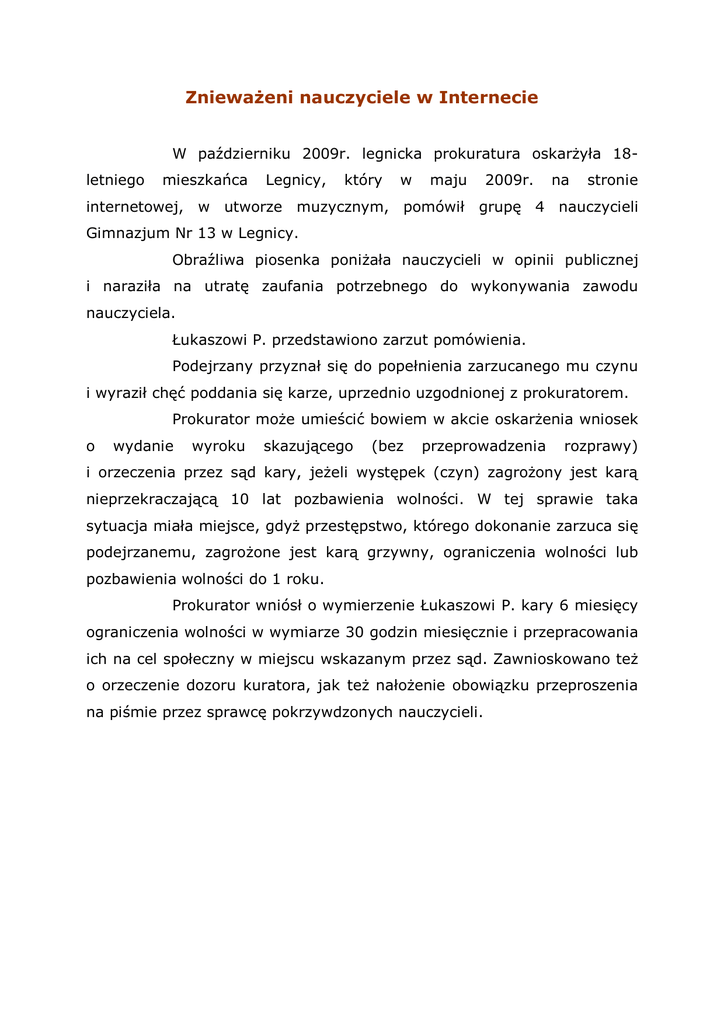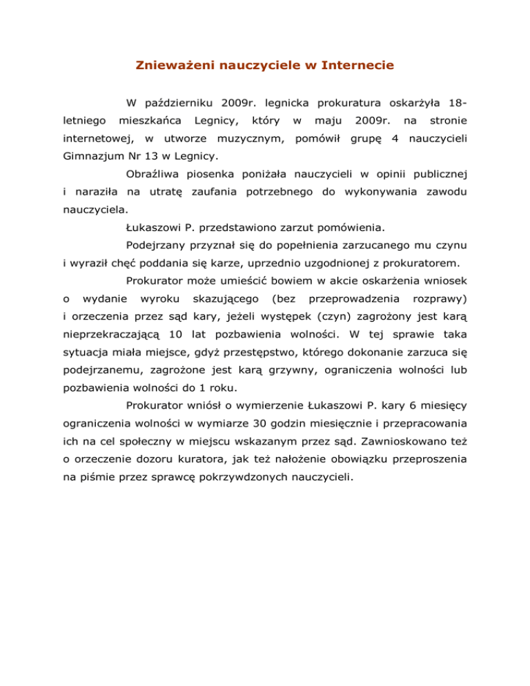 Znieważeni nauczyciele w Internecie W październiku 2009r. legnicka prokuratura oskarżyła 18letniego mieszkańca Legnicy, który w maju 2009r. na stronie internetowej, w utworze muzycznym, pomówił grupę 4 nauczycieli Gimnazjum Nr 13 w Legnicy. Obraźliwa piosenka poniżała nauczycieli w opinii publicznej i naraziła na utratę zaufania potrzebnego do wykonywania zawodu nauczyciela. Łukaszowi P. przedstawiono zarzut pomówienia. Podejrzany przyznał się do popełnienia zarzucanego mu czynu i wyraził chęć poddania się karze, uprzednio uzgodnionej z prokuratorem. Prokurator może umieścić bowiem w akcie oskarżenia wniosek o wydanie wyroku skazującego (bez przeprowadzenia rozprawy) i orzeczenia przez sąd kary, jeżeli występek (czyn) zagrożony jest karą nieprzekraczającą 10 lat pozbawienia wolności. W tej sprawie taka sytuacja miała miejsce, gdyż przestępstwo, którego dokonanie zarzuca się podejrzanemu, zagrożone jest karą grzywny, ograniczenia wolności lub pozbawienia wolności do 1 roku. Prokurator wniósł o wymierzenie Łukaszowi P. kary 6 miesięcy ograniczenia wolności w wymiarze 30 godzin miesięcznie i przepracowania ich na cel społeczny w miejscu wskazanym przez sąd. Zawnioskowano też o orzeczenie dozoru kuratora, jak też nałożenie obowiązku przeproszenia na piśmie przez sprawcę pokrzywdzonych nauczycieli.