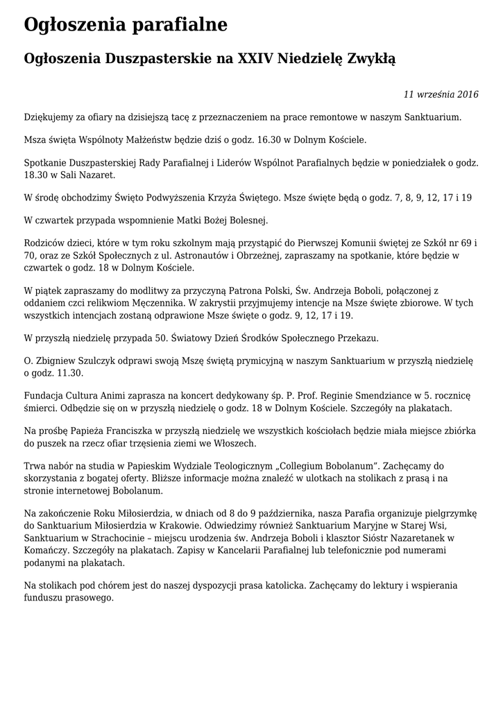 Ogłoszenia parafialne Ogłoszenia Duszpasterskie na XXIV Niedzielę Zwykłą 11 września 2016 Dziękujemy za ofiary na dzisiejszą tacę z przeznaczeniem na prace remontowe w naszym Sanktuarium. Msza święta Wspólnoty Małżeństw będzie dziś o godz. 16.30 w Dolnym Kościele. Spotkanie Duszpasterskiej Rady Parafialnej i Liderów Wspólnot Parafialnych będzie w poniedziałek o godz. 18.30 w Sali Nazaret. W środę obchodzimy Święto Podwyższenia Krzyża Świętego. Msze święte będą o godz. 7, 8, 9, 12, 17 i 19 W czwartek przypada wspomnienie Matki Bożej Bolesnej. Rodziców dzieci, które w tym roku szkolnym mają przystąpić do Pierwszej Komunii świętej ze Szkół nr 69 i 70, oraz ze Szkół Społecznych z ul. Astronautów i Obrzeżnej, zapraszamy na spotkanie, które będzie w czwartek o godz. 18 w Dolnym Kościele. W piątek zapraszamy do modlitwy za przyczyną Patrona Polski, Św. Andrzeja Boboli, połączonej z oddaniem czci relikwiom Męczennika. W zakrystii przyjmujemy intencje na Msze święte zbiorowe. W tych wszystkich intencjach zostaną odprawione Msze święte o godz. 9, 12, 17 i 19. W przyszłą niedzielę przypada 50. Światowy Dzień Środków Społecznego Przekazu. O. Zbigniew Szulczyk odprawi swoją Mszę świętą prymicyjną w naszym Sanktuarium w przyszłą niedzielę o godz. 11.30. Fundacja Cultura Animi zaprasza na koncert dedykowany śp. P. Prof. Reginie Smendziance w 5. rocznicę śmierci. Odbędzie się on w przyszłą niedzielę o godz. 18 w Dolnym Kościele. Szczegóły na plakatach. Na prośbę Papieża Franciszka w przyszłą niedzielę we wszystkich kościołach będzie miała miejsce zbiórka do puszek na rzecz ofiar trzęsienia ziemi we Włoszech. Trwa nabór na studia w Papieskim Wydziale Teologicznym „Collegium Bobolanum”. Zachęcamy do skorzystania z bogatej oferty. Bliższe informacje można znaleźć w ulotkach na stolikach z prasą i na stronie internetowej Bobolanum. Na zakończenie Roku Miłosierdzia, w dniach od 8 do 9 października, nasza Parafia organizuje pielgrzymkę do Sanktuarium Miłosierdzia w Krakowie. Odwiedzimy również Sanktuarium Maryjne w Starej Wsi, Sanktuarium w Strachocinie – miejscu urodzenia św. Andrzeja Boboli i klasztor Sióstr Nazaretanek w Komańczy. Szczegóły na plakatach. Zapisy w Kancelarii Parafialnej lub telefonicznie pod numerami podanymi na plakatach. Na stolikach pod chórem jest do naszej dyspozycji prasa katolicka. Zachęcamy do lektury i wspierania funduszu prasowego.
