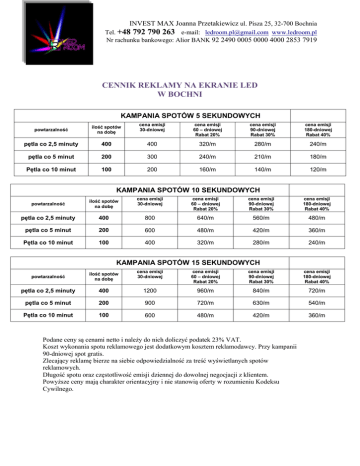 INVEST MAX Joanna Przetakiewicz ul. Pisza 25, 32-700 Bochnia Tel. +48 792 790 263 e-mail: [email protected] www.ledroom.pl Nr rachunku bankowego: Alior BANK 92 2490 0005 0000 4000 2853 7919 CENNIK REKLAMY NA EKRANIE LED W BOCHNI KAMPANIA SPOTÓW 5 SEKUNDOWYCH powtarzalność ilość spotów na dobę cena emisji 30-dniowej cena emisji 60 – dniowej Rabat 20% cena emisji 90-dniowej Rabat 30% cena emisji 180-dniowej Rabat 40% pętla co 2,5 minuty 400 400 320/m 280/m 240/m pętla co 5 minut 200 300 240/m 210/m 180/m Pętla co 10 minut 100 200 160/m 140/m 120/m KAMPANIA SPOTÓW 10 SEKUNDOWYCH powtarzalność ilość spotów na dobę cena emisji 30-dniowej cena emisji 60 – dniowej Rabat 20% cena emisji 90-dniowej Rabat 30% cena emisji 180-dniowej Rabat 40% pętla co 2,5 minuty 400 800 640/m 560/m 480/m pętla co 5 minut 200 600 480/m 420/m 360/m Pętla co 10 minut 100 400 320/m 280/m 240/m KAMPANIA SPOTÓW 15 SEKUNDOWYCH powtarzalność ilość spotów na dobę cena emisji 30-dniowej cena emisji 60 – dniowej Rabat 20% cena emisji 90-dniowej Rabat 30% cena emisji 180-dniowej Rabat 40% pętla co 2,5 minuty 400 1200 960/m 840/m 720/m pętla co 5 minut 200 900 720/m 630/m 540/m Pętla co 10 minut 100 600 480/m 420/m 360/m Podane ceny są cenami netto i należy do nich doliczyć podatek 23% VAT. Koszt wykonania spotu reklamowego jest dodatkowym kosztem reklamodawcy. Przy kampanii 90-dniowej spot gratis. Zlecający reklamę bierze na siebie odpowiedzialność za treść wyświetlanych spotów reklamowych. Długość spotu oraz częstotliwość emisji dziennej do dowolnej negocjacji z klientem. Powyższe ceny mają charakter orientacyjny i nie stanowią oferty w rozumieniu Kodeksu Cywilnego.