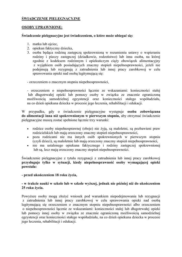 ŚWIADCZENIE PIELĘGNACYJNE OSOBY UPRAWNIONE: Świadczenie pielęgnacyjne jest świadczeniem, o które może ubiegać się: 1. matka lub ojciec, 2. opiekun faktyczny dziecka, 3. osoba będąca rodziną zastępczą spokrewnioną w rozumieniu ustawy o wspieraniu rodziny i pieczy zastępczej (dziadkowie, rodzeństwo) lub inna osoba, na której zgodnie z kodeksem rodzinnym i opiekuńczym ciąży obowiązek alimentacyjny z wyjątkiem osób posiadających znaczny stopień niepełnosprawności, jeżeli nie podejmują lub rezygnują z zatrudnienia lub innej pracy zarobkowej w celu sprawowania opieki nad osobą legitymującą się: - orzeczeniem o znacznym stopniu niepełnosprawności, - orzeczeniem o niepełnosprawności łącznie ze wskazaniami: konieczności stałej lub długotrwałej opieki lub pomocy osoby w związku ze znacznie ograniczoną możliwością samodzielnej egzystencji oraz konieczności stałego współudziału, na co dzień opiekuna dziecka w procesie jego leczenia, rehabilitacji i edukacji. W przypadku, gdy o świadczenie pielęgnacyjne występuje osoba zobowiązana do alimentacji inna niż spokrewnionym w pierwszym stopniu, aby otrzymać świadczenie pielęgnacyjne muszą zostać spełnione łącznie trzy warunki: rodzice osoby niepełnosprawnej (oboje) nie żyją, są małoletni, są pozbawieni praw rodzicielskich lub mają orzeczony znaczny stopień niepełnosprawności, poza rodzicami nie ma innych osób spokrewnionych w pierwszym stopniu (czyli dzieci), są małoletnie lub mają orzeczony znaczny stopień niepełnosprawności, nie ma ustalonego opiekuna faktycznego i rodziny zastępczej spokrewnionej lub są, lecz mają orzeczony znaczny stopień niepełnosprawności. Świadczenie pielęgnacyjne z tytułu rezygnacji z zatrudnienia lub innej pracy zarobkowej przysługuje tylko w sytuacji, kiedy niepełnosprawność osoby wymagającej opieki powstała: - przed ukończeniem 18 roku życia, - w trakcie nauki w szkole lub w szkole wyższej, jednak nie później niż do ukończeniem 25 roku życia. Powyższe osoby mogą złożyć wniosek pod warunkiem niepodejmowania lub rezygnacji z zatrudnienia lub innej pracy zarobkowej w celu sprawowania opieki nad osobą legitymującą się orzeczeniem o znacznym stopniu niepełnosprawności albo orzeczeniem o niepełnosprawności łącznie ze wskazaniami: konieczności stałej lub długotrwałej opieki lub pomocy innej osoby w związku ze znacznie ograniczoną możliwością samodzielnej egzystencji oraz konieczności stałego współudziału, na co dzień opiekuna dziecka w procesie jego leczenia, rehabilitacji i edukacji. Ustalenie prawa do świadczenia pielęgnacyjnego oraz jego wypłata następuje odpowiednio na wniosek jednej z w/w osób. Wniosek składa się w Gminnym Ośrodku Pomocy Społecznej w Moszczenicy z siedzibą w Kosowie. Świadczenie pielęgnacyjne przysługuje niezależnie od wysokości osiągniętego dochodu. Świadczenie wypłacane jest miesięcznie: - w okresie od 1 lipca 2013r. do 30 kwietnia 2014r. – 620,00zł - w okresie od 1 maja 2014r. do 31 grudnia 2014r. – 800,00 zł, - w okresie od 1 stycznia 2015r. do 31 grudnia 2015r. – 1 200,00 zł, - w okresie od 1 stycznia 2016r. do 31 grudnia 2016r. – 1 300,00 zł, Prawo do świadczenia pielęgnacyjnego ustala się na czas nieokreślony, chyba, że orzeczenie o niepełnosprawności lub orzeczenie o stopniu niepełnosprawności zostało wydane na czas określony. W przypadku wydania orzeczenia o niepełnosprawności lub orzeczenia o stopniu niepełnosprawności na czas określony prawo do świadczenia pielęgnacyjnego ustala się do ostatniego dnia miesiąca, w którym upływa termin ważności orzeczenia. WYMAGANE DOKUMENTY W celu otrzymania świadczenia pielęgnacyjnego konieczne jest złożenie wniosku oraz dołączenie do niego następujących dokumentów: 1) dokument stwierdzający tożsamość wnioskodawcy (oryginał do wglądu, w celu potwierdzenia tożsamości oraz miejsca zamieszkania), 2) dokument stwierdzający tożsamość dziecka lub osoby wymagającej opieki, (np. skrócony odpis aktu urodzenia dziecka, lub inny urzędowy dokument stwierdzający wiek dziecka), 3) orzeczenie o niepełnosprawności: * w przypadku dzieci do 16 roku życia orzeczenie o zaliczeniu do osób niepełnosprawnych wraz ze wskazaniami w punktach: 7 i 8 (konieczność stałej lub długotrwałej opieki lub pomocy innej osoby w związku ze znacznie ograniczoną możliwością samodzielnej egzystencji oraz konieczności stałego współudziału, na co dzień opiekuna dziecka w procesie jego leczenia, rehabilitacji i edukacji,) * w przypadku osób powyżej 16 roku życia orzeczenie o znacznym stopniu niepełnosprawności, I grupie inwalidzkiej lub całkowitej niezdolności do pracy i samodzielnej egzystencji, 4) zaświadczenie placówki zapewniającej całodobową opiekę, w przypadku umieszczenia w niej dziecka, o liczbie dni w tygodniu, w których korzysta w niej z całodobowej opieki albo oświadczenie o nie korzystaniu przez więcej niż 5 dni w tygodniu z całodobowej opieki nad dzieckiem umieszczonym w placówce zapewniającej całodobową opiekę, w tym w specjalnym ośrodku szkolno - wychowawczym; 5) zaświadczenie z Zakładu Ubezpieczeń Społecznych o nie pobieraniu świadczeń emerytalno-rentowych, 6) oświadczenie o niepopieraniu świadczeń emerytalno-rentowych z KRUS, Biura Emerytalnego MSW IA, Wojskowego Biura Emerytalnego i innych instytucji, nie pobieraniu zasiłku stałego na podstawie przepisów ustawy o Pomocy Społecznej , nie prowadzeniu pozarolniczej działalności gospodarczej, 7) zaświadczenie z Urzędu Pracy o niefigurowaniu w rejestrze osób bezrobotnych, 8) inne dokumenty mające wpływ na ustalenie prawa do świadczenia pielęgnacyjnego m.in. - w przypadku, gdy rodzice osoby wymagającej opieki nie żyją – odpisy zgonów rodziców, - w przypadku, gdy rodzice osoby wymagającej opieki mają orzeczony znaczny stopień niepełnosprawności – orzeczenia