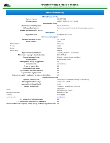 Powiatowy Urząd Pracy w Oleśnie http://pupolesno.pl/oferta/5718/malarz-budowlany Malarz budowlany Identyfikacja oferty Numer oferty: StPr/17/0018 Oferta ważna: od 2017-01-05 do 2017-04-04 Stanowisko pracy Nazwa stanowiska pracy: Malarz budowlany Zakres obowiązków: Malowanie, szpachlowanie, tynkowanie, docieplenia. Liczba wolnych miejsc pracy: 1 Wymagania Wykształcenie: zasadnicze zawodowe Warunki płacy i pracy Data rozpoczęcia pracy: 2017-01-09 Miejsce pracy: Polska Województwo: OPOLSKIE Powiat: oleski Gmina: Radłów Miejscowość: Radłów System wynagrodzenia: Czasowy ze stawką miesięczną Minimalne wynagrodzenie brutto: Rodzaj zatrudnienia: 3000.00 PLN Umowa o pracę na czas określony Wymiar etatu: w pełnym wymiarze Liczba godzin pracy w tygodniu: Zmianowość: 40 jedna zmiana Praca w wolne dni: NIE Zatrudnienie od zaraz: NIE Zapewnienie zakwaterowania: NIE Zapewnienie wyżywienia: NIE Pracodawca pokrywa koszty przejazdu do Polski: NIE Sposób Aplikowania Sposób aplikowania: Wymagane dokumenty: Język składania aplikacji: Nazwa organizacji: Za pośrednictwem Powiatowego Urzędu Pracy Skierowanie z PUP polski Powiatowy Urząd Pracy w Oleśnie Adres: Dworcowa 4 46-300 Olesno, Polska Osoba do kontaktu: Aurelia Szyszka Telefon: 343505993 Adres e-mail: pokaż adres Czy oferta jest subsydiowana: NIE Czy oferta jest finansowana z PFRON: NIE Upowszechnienie krajowej oferty pracy na terenie państw EOG: NIE