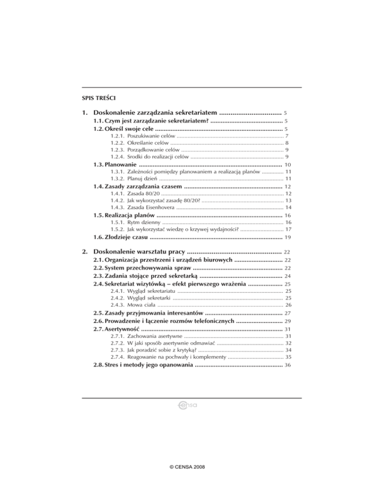SPIS TREŚCI 1. Doskonalenie zarządzania sekretariatem ................................. 5 1.1. Czym jest zarządzanie sekretariatem? .......................................... 5 1.2. Określ swoje cele .......................................................................... 5 1.2.1. 1.2.2. 1.2.3. 1.2.4. Poszukiwanie celów ..................................................................... 7 Określanie celów ......................................................................... 8 Porządkowanie celów .................................................................. 9 Srodki do realizacji celów ............................................................ 9 1.3. Planowanie ................................................................................... 10 1.3.1. Zależności pomiędzy planowaniem a realizacją planów .............. 11 1.3.2. Planuj dzień ................................................................................ 11 1.4. Zasady zarządzania czasem ......................................................... 12 1.4.1. Zasada 80/20 ............................................................................... 12 1.4.2. Jak wykorzystać zasadę 80/20? ..................................................... 13 1.4.3. Zasada Eisenhovera ..................................................................... 14 1.5. Realizacja planów ......................................................................... 16 1.5.1. Rytm dzienny .............................................................................. 16 1.5.2. Jak wykorzystać wiedzę o krzywej wydajności? ............................ 17 1.6. Złodzieje czasu ............................................................................. 19 2. Doskonalenie warsztatu pracy .................................................. 22 2.1. Organizacja przestrzeni i urządzeń biurowych ............................ 22 2.2. System przechowywania spraw .................................................... 22 2.3. Zadania stojące przed sekretarką ................................................ 24 2.4. Sekretariat wizytówką – efekt pierwszego wrażenia .................... 25 2.4.1. Wygląd sekretariatu .................................................................... 25 2.4.2. Wygląd sekretarki ....................................................................... 25 2.4.3. Mowa ciała ................................................................................. 26 2.5. Zasady przyjmowania interesantów ............................................. 27 2.6. Prowadzenie i łączenie rozmów telefonicznych ........................... 29 2.7. Asertywność .................................................................................. 31 2.7.1. 2.7.2. 2.7.3. 2.7.4. Zachowania asertywne ................................................................ 31 W jaki sposób asertywnie odmawiać ........................................... 32 Jak poradzić sobie z krytyką? ....................................................... 34 Reagowanie na pochwały i komplementy .................................... 35 2.8. Stres i metody jego opanowania ................................................... 36 © CENSA 2008 3. Korespondencja biurowa ............................................................... 40 3.1 3.2 3.3 3.4 Wprowadzenie ................................................................................... Analiza korespondencji ..................................................................... Prowadzenie rejestru korespondencji ............................................... Zasady sporządzania pism ................................................................ 40 40 42 43 3.4.1. Formy adresatywne ........................................................................... 46 3.4.2. Zasady edycji tekstów ....................................................................... 52 3.4.3. Wzory pism użytkowych ................................................................... 53 3.4.3.1. E–mail ................................................................................ 53 3.4.3.2. Koperta .............................................................................. 54 3.4.3.3. List ..................................................................................... 55 3.4.3.4. Opinia ............................................................................... 56 3.4.3.5. Podanie ............................................................................. 58 3.4.3.6. Protokół ............................................................................. 59 3.4.3.7. Sprawozdanie ..................................................................... 61 3.4.3.8. Upoważnienie .................................................................... 62 3.4.3.9. Wizytówka ......................................................................... 62 Zawiadomienie .................................................................. 63 3.4.3.10. 4. Biurowy savoir vivre ...................................................................... 64 4.1. Tytulatura i precedencja .................................................................... 64 4.2. Kultura języka mówionego ................................................................ 67 4.2.1. O powitaniu ..................................................................................... 4.2.2. O pożegnaniu .................................................................................. 4.2.3. Relacje (ty – pan/pani) ...................................................................... 4.2.4. Obsługa interesantów ....................................................................... 4.2.4.1. Rozmowa telefoniczna ....................................................... 4.2.4.2. Poczta głosowa .................................................................. 67 68 69 69 70 71 4.3. Kultura języka pisanego .....................................