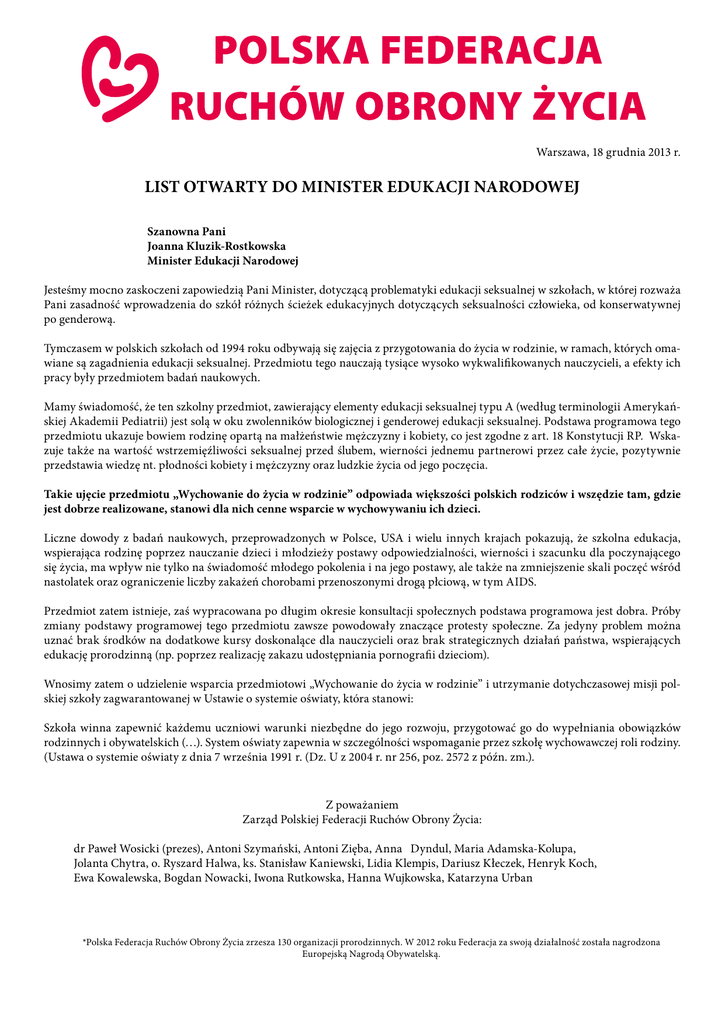 Warszawa, 18 grudnia 2013 r. LIST OTWARTY DO MINISTER EDUKACJI NARODOWEJ Szanowna Pani Joanna Kluzik-Rostkowska Minister Edukacji Narodowej Jesteśmy mocno zaskoczeni zapowiedzią Pani Minister, dotyczącą problematyki edukacji seksualnej w szkołach, w której rozważa Pani zasadność wprowadzenia do szkół różnych ścieżek edukacyjnych dotyczących seksualności człowieka, od konserwatywnej po genderową. Tymczasem w polskich szkołach od 1994 roku odbywają się zajęcia z przygotowania do życia w rodzinie, w ramach, których omawiane są zagadnienia edukacji seksualnej. Przedmiotu tego nauczają tysiące wysoko wykwalifikowanych nauczycieli, a efekty ich pracy były przedmiotem badań naukowych. Mamy świadomość, że ten szkolny przedmiot, zawierający elementy edukacji seksualnej typu A (według terminologii Amerykańskiej Akademii Pediatrii) jest solą w oku zwolenników biologicznej i genderowej edukacji seksualnej. Podstawa programowa tego przedmiotu ukazuje bowiem rodzinę opartą na małżeństwie mężczyzny i kobiety, co jest zgodne z art. 18 Konstytucji RP. Wskazuje także na wartość wstrzemięźliwości seksualnej przed ślubem, wierności jednemu partnerowi przez całe życie, pozytywnie przedstawia wiedzę nt. płodności kobiety i mężczyzny oraz ludzkie życia od jego poczęcia. Takie ujęcie przedmiotu „Wychowanie do życia w rodzinie” odpowiada większości polskich rodziców i wszędzie tam, gdzie jest dobrze realizowane, stanowi dla nich cenne wsparcie w wychowywaniu ich dzieci. Liczne dowody z badań naukowych, przeprowadzonych w Polsce, USA i wielu innych krajach pokazują, że szkolna edukacja, wspierająca rodzinę poprzez nauczanie dzieci i młodzieży postawy odpowiedzialności, wierności i szacunku dla poczynającego się życia, ma wpływ nie tylko na świadomość młodego pokolenia i na jego postawy, ale także na zmniejszenie skali poczęć wśród nastolatek oraz ograniczenie liczby zakażeń chorobami przenoszonymi drogą płciową, w tym AIDS. Przedmiot zatem istnieje, zaś wypracowana po długim okresie konsultacji społecznych podstawa programowa jest dobra. Próby zmiany podstawy programowej tego przedmiotu zawsze powodowały znaczące protesty społeczne. Za jedyny problem można uznać brak środków na dodatkowe kursy doskonalące dla nauczycieli oraz brak strategicznych działań państwa, wspierających edukację prorodzinną (np. poprzez realizację zakazu udostępniania pornografii dzieciom). Wnosimy zatem o udzielenie wsparcia przedmiotowi „Wychowanie do życia w rodzinie” i utrzymanie dotychczasowej misji polskiej szkoły zagwarantowanej w Ustawie o systemie oświaty, która stanowi: Szkoła winna zapewnić każdemu uczniowi warunki niezbędne do jego rozwoju, przygotować go do wypełniania obowiązków rodzinnych i obywatelskich (…). System oświaty zapewnia w szczególności wspomaganie przez szkołę wychowawczej roli rodziny. (Ustawa o systemie oświaty z dnia 7 września 1991 r. (Dz. U z 2004 r. nr 256, poz. 2572 z późn. zm.). Z poważaniem Zarząd Polskiej Federacji Ruchów Obrony Życia: dr Paweł Wosicki (prezes), Antoni Szymański, Antoni Zięba, Anna Dyndul, Maria Adamska-Kolupa, Jolanta Chytra, o. Ryszard Halwa, ks. Stanisław Kaniewski, Lidia Klempis, Dariusz Kłeczek, Henryk Koch, Ewa Kowalewska, Bogdan Nowacki, Iwona Rutkowska, Hanna Wujkowska, Katarzyna Urban *Polska Federacja Ruchów Obrony Życia zrzesza 130 organizacji prorodzinnych. W 2012 roku Federacja za swoją działalność została nagrodzona Europejską Nagrodą Obywatelską.