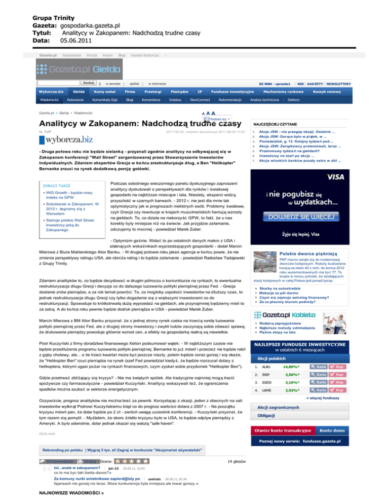 Grupa Trinity Gazeta: gospodarka.gazeta.pl Tytu³: Analitycy w Zakopanem: Nadchodz¹ trudne czasy Data: 05.06.2011 Gazeta.pl Gospodarka Poczta Szukaj Wyborcza.biz Wiadomości Gazeta.pl Giełda Notowania Giełda Forum i j k l m n Blogi w serwisie Gazeta Wyborcza j k l m n spółek Kursy walut Firma Komunikaty Espi Blogi j k l m n w internecie Przetargi Komentarze BZ WBK - sprzedaż Pieniądze Indeksy CF Fundusze inwestycyjne NewConnect Wiadomości A Rekomendacje RSS Mechanizmy rynkowe Analiza techniczna GAD ŻETY NEWSLETTERY Koszyk cenowy Sektory AA Podziel się Analitycy w Zakopanem: Nadchodzą trudne czasy is, ToP 2011 -06-05, ostatnia aktualizacja 2011 -06-05 13:03 NAJCZĘŚCIEJ CZYTANE Akcje JSW - nie przegap okazji. Ostatnie ... Akcje JSW: Gorąco było w pi ątek, w ... Poniedziałek, g. 13: Kolejny tydzień pod ... Akcje JSW: Zwi ązkowcy protestowali, teraz ... Przełomowy tydzie ń na giełdach? Inwestorzy na start po akcje ... Akcje włoskich banków poszły ostro w dół ... 1. 2. 3. 4. - Druga połowa roku nie będzie sielanką - przyznali zgodnie analitycy na odbywającej się w Zakopanem konferencji "Wall Street" zorganizowanej przez Stowarzyszenie Inwestorów Indywidualnych. Zdaniem ekspertów Grecja w końcu zrestrukturyzuje dług, a Ben "Helikopter" Bernanke zrzuci na rynek dodatkową porcję gotówki. 5. 6. 7. Podczas sobotniego wieczornego panelu dyskusyjnego zaproszeni analitycy dyskutowali o perspektywach dla rynków i światowej gospodarki na najbliższe miesiące i lata. Niestety, eksperci widzą przyszłość w czarnych barwach. - 2012 r. nie jest dla mnie tak optymistyczny jak w prognozach niektórych osób. Problemy światowe, czyli Grecja czy rewolucje w krajach muzułmańskich hamują wzrosty na giełdach. To, co działa na niekorzyść GPW, to fakt, że u nas korekty były mniejsze niż na świecie. Jak przyjdzie załamanie, odczujemy to mocniej - powiedział Marek Zuber. ZOBACZ TAKŻE WIG Growth - będzie nowy indeks na GPW Sobolewski w Zakopanem: W 2012 r. żegnamy się z Warsetem Startuje polskie Wall Street. Inwestorzy jadą do Zakopanego - Optymizm gaśnie. Widać to po ostatnich danych makro z USA i słabnących wskaźnikach wyprzedzających gospodarki - dodał Marcin Mierzwa z Biura Maklerskiego Alior Banku. - W drugiej połowie roku jakaś agencja w końcu powie, że nie zmienia perspektywy ratingu USA, ale obniża rating i to będzie załamanie - powiedział Radosław Tadajewski z Grupy Trinity. Zdaniem analityków to, co będzie decydować w drugim półroczu o koniunkturze na rynkach, to ewentualna restrukturyzacja długu Grecji i decyzja co do dalszego luzowania polityki pieniężnej przez Fed. - Grecja dostanie znów pieniądze, a za rok temat powróci. To, co mogłoby uspokoić inwestorów na dłuższy czas, to jednak restrukturyzacja długu Grecji czy tylko dogadanie się z większymi inwestorami co do restrukturyzacji. Spowoduje to krótkotrwałą dużą wyprzedaż na giełdach, ale przynajmniej będziemy mieli to za sobą. A do końca roku pewnie będzie dodruk pieniądza w USA - powiedział Marek Zuber. Polskie dworce pięknieją PKP mocno wzięło się do modernizacji dworców kolejowych. Roboty budowlane trwaj ą na około 40 z nich, do końca 2012 roku wyremontowanych ma być 77. To kropla w morzu potrzeb, bo działających stacji kolejowych w całej Polsce jest ponad tysiąc. Skarby na autostradzie Wakacje za pół darmo Czym si ę zajmuje astrolog finansowy? Za co płacimy biurom podró ży? Marcin Mierzwa z BM Alior Banku przyznał, że z jednej strony rynek czeka na trzecią rundę luzowania polityki pieniężnej przez Fed, ale z drugiej strony inwestorzy i zwykli ludzie zaczynają sobie zdawać sprawę, że drukowanie pieniędzy powoduje głównie wzrost cen, a efekty na gospodarkę realną są niewielkie. Piotr Kuczyński z firmy doradztwa finansowego Xelion podsumował wątek: - W najbliższym czasie nie będzie przedłużenia programu luzowania polityki pieniężnej. Bernanke to już mówił i przecież nie będzie robił z gęby cholewy, ale... o ile trzeci kwartał może być jeszcze niezły, potem będzie coraz gorzej i się okaże, że "Helikopter Ben" rzuci pieniądze na rynek (szef Fed powiedział kiedyś, że będzie rozrzucał dolary z helikoptera, którymi ugasi pożar na rynkach finansowych, czym zyskał sobie przydomek "Helikopter Ben"). Gdzie przetrwać zbliżający się kryzys? - Nie ma świętych spółek. Ale tradycyjnie najmniej mogą tracić spożywcze czy farmaceutyczne - powiedział Kuczyński. Analitycy wskazywali też, że ograniczenia spadków można szukać w sektorze energetycznym. Oczywiście, prognoz analityków nie można brać za pewnik. Korzystając z okazji, jeden z obecnych na sali inwestorów wytknął Piotrowi Kuczyńskiemu błąd co do prognoz wartości dolara z 2007 r. - Na początku kryzysu mówił pan, że dolar będzie po 2 zł - zwrócił uwagę uczestnik konferencji. - Kuczyński przyznał, że tym razem się pomylił. - Myślałem, że skoro źródło kryzysu było w USA, to będzie odpływ pieniędzy z Ameryki. A było odwrotnie, dolar jednak okazał się walutą "safe haven". Rodziną zaprzyja źniona Najtańsze metody odmładzania Piękne stopy na lato NAJLEPSZE FUNDUSZE INWESTYCYJNE w ostatnich 6 miesiącach Akcji polskich 1. ALBU 14,89%* 2. INSP 3,50%* 3. IDE05 3,10%* 4. UAME 2,93%* + więcej funduszy Akcji zagranicznych Obligacji REKLAMA Poznaj nowy serwis: fundusze.gazeta.pl Rebranding po polsku | Wygraj 5 tys. zł! Zagraj w konkursie "Akcjonariat obywatelski" 24 komentarze Drukuj Ocena: lol...anale w zakopanem? jot-23 co to ma byc taki bieda-davos?» 14 głosów 05.06.11, 16:04 Za komuny nurki smietnikowe zapierd@laly po sselrats 06.06.11, 05:44 fajansach nie gorzej niz teraz. Moze konkurencja byla mniejsza ale towar gorszy.» NAJNOWSZE WIADOMOŚCI » Prywatni inwestorzy dołączą się do ratowania Grecji Rebranding po polsku | Wygraj 5 tys. zł! Zagraj w konkursie "Akcjonariat obyw