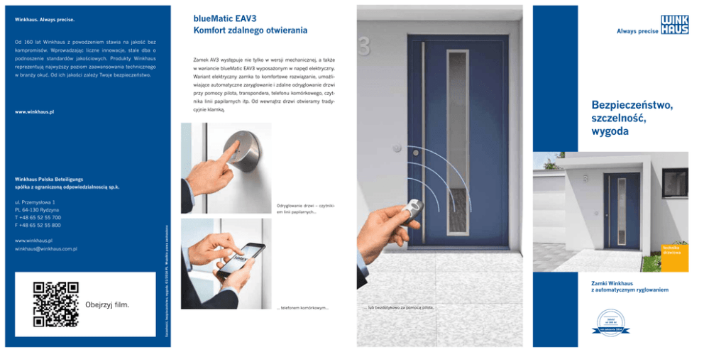 blueMatic EAV3 Komfort zdalnego otwierania Winkhaus. Always precise. Od 160 lat Winkhaus z powodzeniem stawia na jakość bez kompromisów. Wprowadzając liczne innowacje, stale dba o podnoszenie standardów jakościowych. Produkty Winkhaus Zamek AV3 występuje nie tylko w wersji mechanicznej, a także reprezentują najwyższy poziom zaawansowania technicznego w wariancie blueMatic EAV3 wyposażonym w napęd elektryczny. w branży okuć. Od ich jakości zależy Twoje bezpieczeństwo. Wariant elektryczny zamka to komfortowe rozwiązanie, umożliwiające automatyczne zaryglowanie i zdalne odryglowanie drzwi przy pomocy pilota, transpondera, telefonu komórkowego, czyt- Bezpieczeństwo, szczelność, wygoda nika linii papilarnych itp. Od wewnątrz drzwi otwieramy tradycyjnie klamką. www.winkhaus.pl Winkhaus Polska Beteiligungs spółka z ograniczoną odpowiedzialnoscią sp.k. ul. Przemysłowa 1 Odryglowanie drzwi – czytniki- PL 64-130 Rydzyna em linii papilarnych... F +48 65 52 55 800 www.winkhaus.pl [email protected] Obejrzyj film. Szczelność, bezpieczeństwo, wygoda. 01/2014 PL Wszelkie prawa zastrzeżone T +48 65 52 55 700 technika drzwiowa Zamki Winkhaus z automatycznym ryglowaniem ... telefonem komórkowym... ... lub bezdotykowo za pomocą pilota. Zamki autoLock AV3 Innowacyjne 2-częściowe rygle 01 Rygle hakowe zapewniają podwyższone bezpieczeństwo 02 Optymalna szczelność dzięki elementom uszczelniającym Zamki autoLock AV3 Automatyczne ryglowanie Zamki autoLock AV3 Przełącznik w tryb dzienny Funkcja automatycznego ryglowania zamków autoLock zwięk- Niebieski element w części środkowej zamka pozwala jednym sza wygodę i bezpieczeństwo użytkowania drzwi. dotknięciem (funkcja oneTouch) przełączyć drzwi w tzw. tryb dzienny. Wystarczy domknąć drzwi, a zamek rygluje się automatycznie. element Wyzwalacz magnetyczny uruchamia 2 masywne rygle hakowe Dzięki temu możemy otwierać drzwi od zewnątrz bez użycia uszczelniający u góry i na dole skrzydła – dzieje się to w momencie, gdy skrzy- klucza. Jest to praktyczne rozwiązanie, umożliwiające na przy- dło znajduje się już w ramie. Dzięki temu unikamy zarysowań i kład swobodne wypakowanie zakupów z samochodu, wyjście na uszkodzeń ramy i do naszych uszu nie dochodzą odgłosy pracy chwilę do ogrodu czy wpuszczenie do domu dzieci wracających masywny rygiel mechanizmu zamykającego. ze szkoły. hakowy Po zaryglowaniu drzwi rygle są automatycznie zabezpieczone przed próbą cofnięcia. Dzięki temu zamek autoLock AV3 zapewnia wysoki poziom bezpieczeństwa, jeszcze zanim przekręcimy klucz we wkładce, uruchamiając rygiel środkowy. NOWOŚĆ! 03 W yzwalacz magnetyczny zapobiega powstawaniu zarysowań na ramie drzwiowej Konstrukcja rygli autoLock AV3 zapewnia wysoki poziom bezpieczeństwa oraz optymalną szczelność, skutecznie chroniąc drzwi przed wpływem czynników atmosferycznych i wypaczeniem. Zamek autoLock AV3 wyposażony jest w charakterystyczne po- przełącznik dwójne rygle hakowe ze specjalnie zaprojektowanym elementem w tryb dzienny uszczelniającym. Elementy uszczelniające działają niezależnie Rygiel hakowy z elementem uszczel- od rygli i zapewniają odpowiedni docisk skrzydła do ościeżnicy. niającym w trakcie ryglowania... Dbają o to, by uszczelka była skompresowana, a drzwi prawidłowo dociśnięte do ramy. Masywne rygle hakowe zagłębiają się w zaczepach, gwarantując stabilne połączenie, odporne na próby sforsowania. Po zaryglowaniu rygle są automatycznie zabezpieczone przed próbą cofnięcia. 01 Rygle hakowe zapewniają podwyższone bezpieczeństwo 02 Optymalna szczelność dzięki elementom uszczelniającym ... i po zaryglowaniu drzwi.