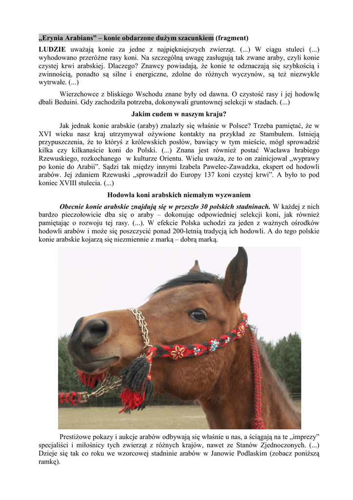 „Erynia Arabians” – konie obdarzone duŜym szacunkiem (fragment) LUDZIE uwaŜają konie za jedne z najpiękniejszych zwierząt. (...) W ciągu stuleci (...) wyhodowano przeróŜne rasy koni. Na szczególną uwagę zasługują tak zwane araby, czyli konie czystej krwi arabskiej. Dlaczego? Znawcy powiadają, Ŝe konie te odznaczają się szybkością i zwinnością, ponadto są silne i energiczne, zdolne do róŜnych wyczynów, są teŜ niezwykle wytrwałe. (...) Wierzchowce z bliskiego Wschodu znane były od dawna. O czystość rasy i jej hodowlę dbali Beduini. Gdy zachodziła potrzeba, dokonywali gruntownej selekcji w stadach. (...) Jakim cudem w naszym kraju? Jak jednak konie arabskie (araby) znalazły się właśnie w Polsce? Trzeba pamiętać, Ŝe w XVI wieku nasz kraj utrzymywał oŜywione kontakty na przykład ze Stambułem. Istnieją przypuszczenia, Ŝe to któryś z królewskich posłów, bawiący w tym mieście, mógł sprowadzić kilka czy kilkanaście koni do Polski. (...) Znana jest równieŜ postać Wacława hrabiego Rzewuskiego, rozkochanego w kulturze Orientu. Wielu uwaŜa, ze to on zainicjował „wyprawy po konie do Arabii”. Sądzi tak między innymi Izabela Pawelec-Zawadzka, ekspert od hodowli arabów. Jej zdaniem Rzewuski „sprowadził do Europy 137 koni czystej krwi”. A było to pod koniec XVIII stulecia. (...) Hodowla koni arabskich niemałym wyzwaniem Obecnie konie arabskie znajdują się w przeszło 30 polskich stadninach. W kaŜdej z nich bardzo pieczołowicie dba się o araby – dokonując odpowiedniej selekcji koni, jak równieŜ pamiętając o rozwoju tej rasy. (...). W efekcie Polska uchodzi za jeden z waŜnych ośrodków hodowli arabów i moŜe się poszczycić ponad 200-letnią tradycją ich hodowli. A do tego polskie konie arabskie kojarzą się niezmiennie z marką – dobrą marką. PrestiŜowe pokazy i aukcje arabów odbywają się właśnie u nas, a ściągają na te „imprezy” specjaliści i miłośnicy tych zwierząt z róŜnych krajów, nawet ze Stanów Zjednoczonych. (...) Dzieje się tak co roku we wzorcowej stadninie arabów w Janowie Podlaskim (zobacz poniŜszą ramkę). „Erynia Arabians” – konie obdarzone duŜym szacunkiem (fragment) 2 (...) Małgorzata, właścicielka stadniny „Erynia Arabians”, połoŜonej w innej części naszego kraju, darzy konie duŜym szacunkiem, wypowiadając się o nich z wielkim uznaniem. Powiada, Ŝe zachwycają swoimi ruchami, pięknem i elegancją*. (...) Z zapałem opowiada, co obejmuje codzienna troska o konia arabskiego. (...) * Wiele dodatkowych informacji o koniach arabskich zamieszczono na stronie internetowej stadniny „Erynia Arabians”, której serdeczni i Ŝyczliwi właściciele Małgorzata i Krzysztof Meszyńscy z prawdziwą pasją zajmują się końmi. ^^^^^^^^^^^^^^^^^^^^^^^^^^^^^^^^^^^^^^^^^^^^^^^^^^^^^^^^^^^^^^^^^^^^^^^^^^^^^^^^^ Konie arabskie polskiej hodowli – więcej szczegółów Początki hodowli arabów na ziemiach polskich sięgają XVIII stulecia. W 1817 roku utworzono za zgodą cara Aleksandra I stadninę w Janowie Podlaskim, zwaną „końskim rajem” (...). Niestety w roku 1914 konie przewieziono w głąb Rosji (...). To, co polscy hodowcy stworzyli w okresie 1778-1918 prawie w całości przepadło. (...) Druga wojna światowa w hodowli koni arabskich oznaczała po prostu kolejne wielkie straty. W roku 1939 podczas ewakuacji stadniny na wschód większość koni padła, rozpierzchła się lub została rozkradziona. Po zakończeniu działań wojennych ogromnym wysiłkiem udało się krok po kroku odtworzyć janowską stadninę. (...) Dzisiaj w Janowie chowane są dwie rasy: czystej krwi arabskiej i półkrwi angloarabskiej (...). NajpowaŜniejszymi odbiorcami polskich arabów są Amerykanie i od niedawna hodowcy z Bliskiego Wschodu (...). ^^^^^^^^^^^^^^^^^^^^^^^^^^^^^^^^^^^^^^^^^^^^^^^^^^^^^^^^^^^^^^^^^^^^^^^^^^^^^^^^^ MąŜ Małgorzaty, Krzysztof, z pasją zajmuje się tak zwanym zakarmianiem koni, czyli podawaniem im właściwych składników pokarmowych, soli mineralnych i... witamin – tak, witamin. „Araby potrzebują wysokiej jakości paszy treściwej” – podkreśla Krzysztof. „Chętnie jedzą teŜ owies, lecz musi być gnieciony i dokładnie wymieszany z sieczką. Najbardziej jednak koniom arabskim przypadają do gustu – wyjątkowo im smakują – pasze treściwe”. Jak zaznacza Małgorzata, „konia nie da się oszukać. Byle jaki pokarm nie wpłynie korzystnie na jego rozwój. Dlatego jeśli tylko się to udaje, karmimy nasze konie zielonkami z „Erynia Arabians” – konie obdarzone duŜym szacunkiem (fragment) 3 traw i lucerną”. Arabom naleŜy zapewnić do picia wodę – ale czystą. Konie te nie wypiją wody brudnej. W stadninie „Erynia Arabians” (nazwa wywodzi się od konia o nazwie Erynia) widać prawdziwą troskę o konie arabskie. Właściciele stadniny mówią (i piszą na swojej stronie internetowej), Ŝe araby trzeba obdarzać duŜym szacunkiem. One to dostrzegają, czują i się odwdzięczają pokojową postawą, chętnym podporządkowaniem się hodowcom. Tak właśnie powinno budować się zaufanie do jeźdźca czy opiekuna. Oczywiście konie trzeba chcieć i umieć pokochać! Szybko potrafią rozpoznać w człowieku przyjaciela i wroga. Kiedy okazuje się arabom odrobinę uczuć, takich jak pogłaskanie, dotykanie, wówczas umieją jakby podziękować. Dowodzą tego rŜeniem – w dowód przywiązania, przyjaźni. (...) [Więcej: http://redkor.pl/zamowienie/ ] [Szczepan Kosiakowski] Strona stadniny „Erynia Arabians”: http://eryniaarabians.w.interia.pl/index.html „Nie traktuj konia jak zwierzę, a on ci się za to odpłaci szczerze” Strona główna: www.Redkor.pl