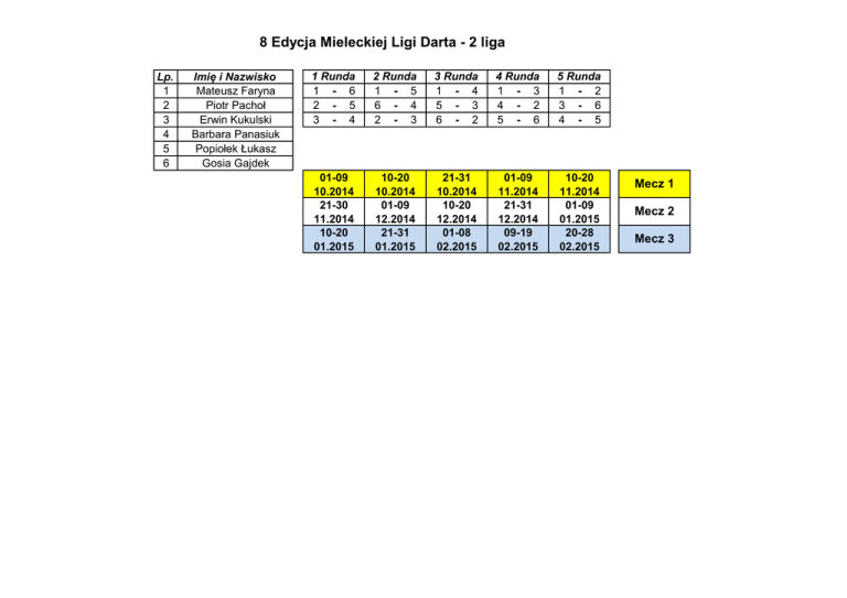 8 Edycja Mieleckiej Ligi Darta - 2 liga Lp. 1 2 3 4 5 6 Imię i Nazwisko Mateusz Faryna Piotr Pachoł Erwin Kukulski Barbara Panasiuk Popiołek Łukasz Gosia Gajdek 1 Runda 1 - 6 2 - 5 3 - 4 2 Runda 1 - 5 6 - 4 2 - 3 3 Runda 1 - 4 5 - 3 6 - 2 4 Runda 1 - 3 4 - 2 5 - 6 5 Runda 1 - 2 3 - 6 4 - 5 01-09 10.2014 21-30 11.2014 10-20 01.2015 10-20 10.2014 01-09 12.2014 21-31 01.2015 21-31 10.2014 10-20 12.2014 01-08 02.2015 01-09 11.2014 21-31 12.2014 09-19 02.2015 10-20 11.2014 01-09 01.2015 20-28 02.2015 Mecz 1 Mecz 2 Mecz 3