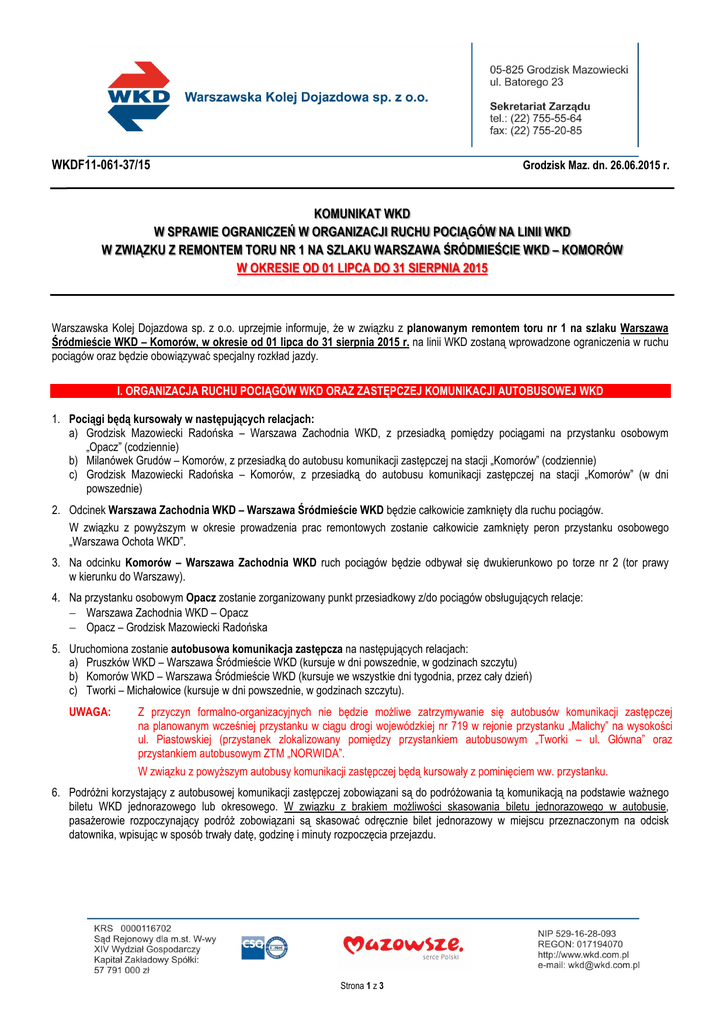 WKDF11-061-37/15 Grodzisk Maz. dn. 26.06.2015 r. KOMUNIKAT WKD W SPRAWIE OGRANICZEŃ W ORGANIZACJI RUCHU POCIĄGÓW NA LINII WKD W ZWIĄZKU Z REMONTEM TORU NR 1 NA SZLAKU WARSZAWA ŚRÓDMIEŚCIE WKD – KOMORÓW W OKRESIE OD 01 LIPCA DO 31 SIERPNIA 2015 Warszawska Kolej Dojazdowa sp. z o.o. uprzejmie informuje, że w związku z planowanym remontem toru nr 1 na szlaku Warszawa Śródmieście WKD – Komorów, w okresie od 01 lipca do 31 sierpnia 2015 r. na linii WKD zostaną wprowadzone ograniczenia w ruchu pociągów oraz będzie obowiązywać specjalny rozkład jazdy. I. ORGANIZACJA RUCHU POCIĄGÓW WKD ORAZ ZASTĘPCZEJ KOMUNIKACJI AUTOBUSOWEJ WKD 1. Pociągi będą kursowały w następujących relacjach: a) Grodzisk Mazowiecki Radońska – Warszawa Zachodnia WKD, z przesiadką pomiędzy pociągami na przystanku osobowym „Opacz” (codziennie) b) Milanówek Grudów – Komorów, z przesiadką do autobusu komunikacji zastępczej na stacji „Komorów” (codziennie) c) Grodzisk Mazowiecki Radońska – Komorów, z przesiadką do autobusu komunikacji zastępczej na stacji „Komorów” (w dni powszednie) 2. Odcinek Warszawa Zachodnia WKD – Warszawa Śródmieście WKD będzie całkowicie zamknięty dla ruchu pociągów. W związku z powyższym w okresie prowadzenia prac remontowych zostanie całkowicie zamknięty peron przystanku osobowego „Warszawa Ochota WKD”. 3. Na odcinku Komorów – Warszawa Zachodnia WKD ruch pociągów będzie odbywał się dwukierunkowo po torze nr 2 (tor prawy w kierunku do Warszawy). 4. Na przystanku osobowym Opacz zostanie zorganizowany punkt przesiadkowy z/do pociągów obsługujących relacje: − Warszawa Zachodnia WKD – Opacz − Opacz – Grodzisk Mazowiecki Radońska 5. Uruchomiona zostanie autobusowa komunikacja zastępcza na następujących relacjach: a) Pruszków WKD – Warszawa Śródmieście WKD (kursuje w dni powszednie, w godzinach szczytu) b) Komorów WKD – Warszawa Śródmieście WKD (kursuje we wszystkie dni tygodnia, przez cały dzień) c) Tworki – Michałowice (kursuje w dni powszednie, w godzinach szczytu). UWAGA: Z przyczyn formalno-organizacyjnych nie będzie możliwe zatrzymywanie się autobusów komunikacji zastępczej na planowanym wcześniej przystanku w ciągu drogi wojewódzkiej nr 719 w rejonie przystanku „Malichy” na wysokości ul. Piastowskiej (przystanek zlokalizowany pomiędzy przystankiem autobusowym „Tworki – ul. Główna” oraz przystankiem autobusowym ZTM „NORWIDA”. W związku z powyższym autobusy komunikacji zastępczej będą kursowały z pominięciem ww. przystanku. 6. Podróżni korzystający z autobusowej komunikacji zastępczej zobowiązani są do podróżowania tą komunikacją na podstawie ważnego biletu WKD jednorazowego lub okresowego. W związku z brakiem możliwości skasowania biletu jednorazowego w autobusie, pasażerowie rozpoczynający podróż zobowiązani są skasować odręcznie bilet jednorazowy w miejscu przeznaczonym na odcisk datownika, wpisując w sposób trwały datę, godzinę i minuty rozpoczęcia przejazdu. Strona 1 z 3 W poniższej tabeli podano lokalizacje przystanków autobusowej komunikacji zastępczej z najbliższym punktem umożliwiającym zakup biletu WKD. Lp. 1. 2. 3. 4. 5. 6. 7. 8. 9. 10. 11. 12. 13. 14. 15. 16. PRZYSTANEK AUTOBUSOWEJ KOMUNIKACJI ZASTĘPCZEJ Komorów – przystanek autobusowy: WKD Komorów / al. Dąbrowskiej (przy stacji WKD) Pruszków WKD – przystanek autobusowy: WKD Pruszków 01 / ul. Kraszewskiego (przy WKD) Pruszków – przystanek autobusowy: Pruszków – Armii Krajowej 01/02 / ul. Prusa Tworki – przystanek autobusowy WKD: WKD TWORKI (SADOWA) / ul. Sadowa – szpital Tworki – przystanek autobusowy: TWORKI/Aleje Jerozolimskie / ul. Główna Malichy – przystanek autobusowy WKD: WKD MALICHY 01 / ul. Dolna (przy WKD) Reguły – przystanek autobusowy ZTM: NORWIDA 01/02 (Piastów – ul. Królewska) Michałowice – przystanek autobusowy ZTM: JESIONOWA 01/02 (Opacz-Kolonia - Aleje Jerozolimskie) Michałowice – przystanek autobusowy WKD: JESIONOWA/ OpaczKolonia - ul. Jesionowa za skrzyżowaniem z Alejami Jerozolimskimi Michałowice – przystanek autobusowy WKD: WKD Michałowice / ul. Jesionowa (przy WKD) Opacz – przystanek autobusowy ZTM: ŻYWIECKA 01/02 (Aleje Jerozolimskie) W-wa Raków – przystanek autobusowy ZTM: ŁOPUSZAŃSKA 01/02 (Aleje Jerozolimskie) W-wa Al. Jerozolimskie – przystanek autobusowy ZTM: PKP WKD ALEJE JEROZOLIMSKIE 01/02 W-wa Zachodnia WKD – przystanek autobusowy ZTM: DWORZEC ZACHODNI 01/02 (Aleje Jerozolimskie) W-wa Ochota WKD – przystanek autobusowy ZTM: PLAC ZAWISZY 01/02 (Aleje Jerozolimskie) W-wa Śródmieście WKD – przystanek autobusowy ZTM: DWORZEC CENTRALNY 06 Aleje Jerozolimskie za rondem Czterdziestolatka w kierunku placu Zawiszy PUNKT BILETOWY kasa biletowa oraz automaty biletowe zlokalizowane na stacji kasa biletowa, kiosk oraz automat biletowy zlokalizowany na stacji najbliższe punkty biletowe na stacji Pruszków WKD, odległość ok. 900m automat biletowy zlokalizowany na przystanku oraz sklep w pobliżu przystanku najbliższe punkty przy przystanku Tworki, odległość ok. 600m automat biletowy oraz kiosk zlokalizowany na przystanku Malichy punkty zlokalizowane przy przystankach Malichy (odległość ok. 2 km) oraz Reguły automat na przystanku oraz sklep w pobliżu (odległość ok. 1 km) kasa biletowa oraz automat biletowy na przystanku, odległość ok. 1,1 km kasa biletowa oraz automat biletowy na przystanku, odległość ok. 1,1 km kasa biletowa oraz automat biletowy na przystanku automat biletowy na p.o. Opacz oraz punkt informacyjny, odległość ok. 600m automaty biletowe zlokalizowane na p.o. W- wa Raków, odległość ok. 600m automat biletowy na p.o. Warszawa Aleje Jerozolimskie kasa biletowa oraz automat biletowy kasa biletowa automat biletowy oraz kasa biletowa zlokalizowane na stacji Warszawa Śródmieście WKD W pociągach WKD uruchamianych zgodnie ze specjalnym rozk