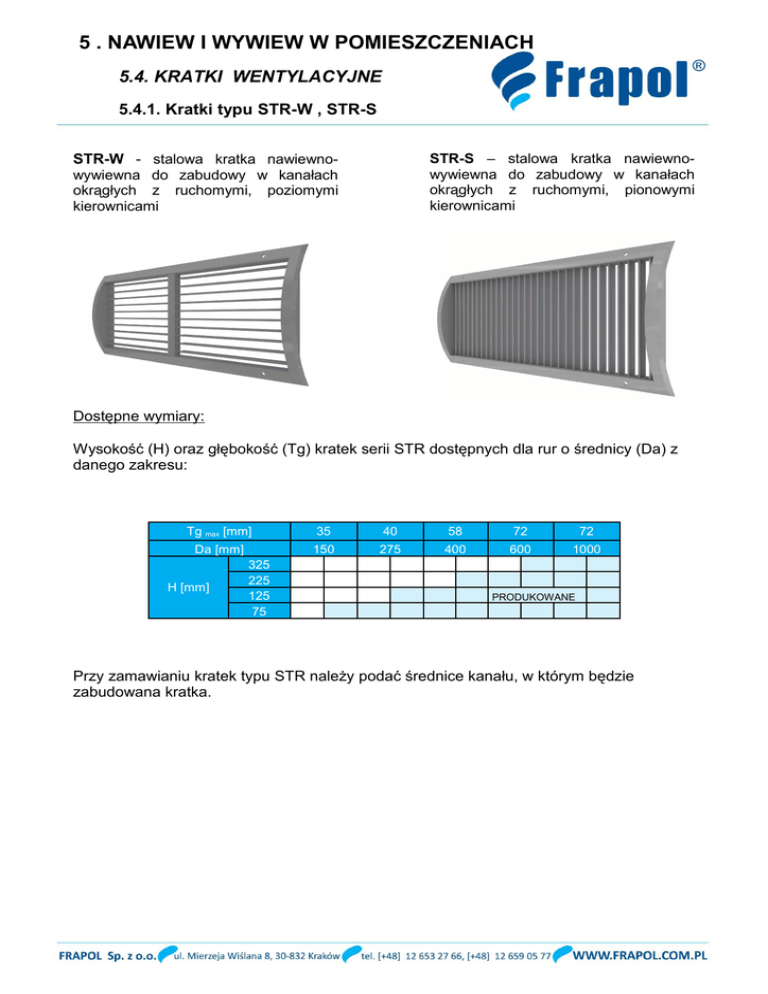 5 . NAWIEW I WYWIEW W POMIESZCZENIACH 5.4. KRATKI WENTYLACYJNE 5.4.1. Kratki typu STR-W , STR-S STR-S – stalowa kratka nawiewnowywiewna do zabudowy w kanałach okrągłych z ruchomymi, pionowymi kierownicami STR-W - stalowa kratka nawiewnowywiewna do zabudowy w kanałach okrągłych z ruchomymi, poziomymi kierownicami Dostępne wymiary: Wysokość (H) oraz głębokość (Tg) kratek serii STR dostępnych dla rur o średnicy (Da) z danego zakresu: Tg max [mm] 35 40 58 72 72 Da [mm] 150 275 400 600 1000 H [mm] 325 225 125 75 PRODUKOWANE Przy zamawianiu kratek typu STR należy podać średnice kanału, w którym będzie zabudowana kratka. 5 . NAWIEW I WYWIEW W POMIESZCZENIACH 5.4. KRATKI WENTYLACYJNE 5.4.1. Kratki typu STR-W , STR-S Dostępne wymiary oraz powierzchnie efektywne: Wielkość H/L STR-W STR-S [mm] [m2] [m2] 0,0073 0,0109 0,0145 0,0181 0,0217 0,0289 0,0361 0,0433 0,0155 0,0231 0,0307 0,0383 0,0459 0,0611 0,0763 0,0915 0,0318 0,0474 0,0630 0,0786 0,0942 0,1254 0,1566 0,1878 0,0717 0,0953 0,1189 0,1425 0,1897 0,2369 0,2841 0,0083 0,0127 0,0171 0,0214 0,0257 0,0343 0,0430 0,0516 0,0162 0,0245 0,0329 0,0412 0,0495 0,0661 0,0828 0,0994 0,0318 0,0481 0,0645 0,0808 0,0971 0,1297 0,1624 0,1950 0,0718 0,0961 0,1204 0,1447 0,1933 0,2420 0,2906 75 125 225 325 225 325 425 525 625 825 1025 1225 225 325 425 525 625 825 1025 1225 225 325 425 525 625 825 1025 1225 325 425 525 625 825 1025 1225 5 . NAWIEW I WYWIEW W POMIESZCZENIACH 5.4. KRATKI WENTYLACYJNE 5.4.1. Kratki typu STR-W , STR-S Wyposażenie dodatkowe: W celu zwiększenia przepływu powietrza przez kratkę, kratki serii STR można wyposażyć w specjalną wersje nasadek w wykonaniu skośnym : • • • G(S) – regulacja ilości powietrza przeciwbieżnie sprzężonymi łopatkami, wykonanie skośne SG (S) – pojedynczo ustawialne kierownice pionowe, regulacja ilości powietrza przeciwbieżnie sprzężonymi łopatkami, wykonanie skośne WG (S) – pojedynczo ustawialne kierownice poziome, regulacja ilości powietrza przeciwbieżnie sprzężonymi łopatkami, wykonanie skośne (S) oznacza wykonanie skośne. Kratki STR-S oraz STR-W mogą być wyposażone w jedną z typowych nasadek: • • • • S / W / – pojedynczo ustawialne kierownice pionowe / poziome / G – regulacja ilości powietrza przeciwbieżnie sprzężonymi łopatkami SG / WG / – pojedynczo ustawialne kierownice pionowe / poziome /, regulacja ilości powietrza przeciwbieżnie sprzężonymi łopatkami SS – przepustnica szczelinowa, maksymalnie 50%wolnego przekroju W zamówieniu należy podać symbol nasadki. 5 . NAWIEW I WYWIEW W POMIESZCZENIACH 5.4. KRATKI WENTYLACYJNE 5.4.1. Kratki typu STR-W , STR-S Wymiary: Głębokość zabudowy kratek serii STR wraz z nasadką ( prostą lub skośną) nie może przekroczyć połowy średnicy kanału okrągłego ( Tr + Tg ≤ Da) L - długość nominalna kratki, H - wysokość nominalna kratki Otwór pod zabudowę: 5 . NAWIEW I WYWIEW W POMIESZCZENIACH 5.4. KRATKI WENTYLACYJNE 5.4.1. Kratki typu STR-W , STR-S Zamocowanie kratki STR-S: • Sposób montażu • Kierunek montażu kratki STR-S ze skośną nasadką względem kierunku przepływu powietrza w kanale od funkcji jaka pełni kratka: 5 . NAWIEW I WYWIEW W POMIESZCZENIACH 5.4. KRATKI WENTYLACYJNE 5.4.1. Kratki typu STR-W , STR-S Przykład zamówienia: