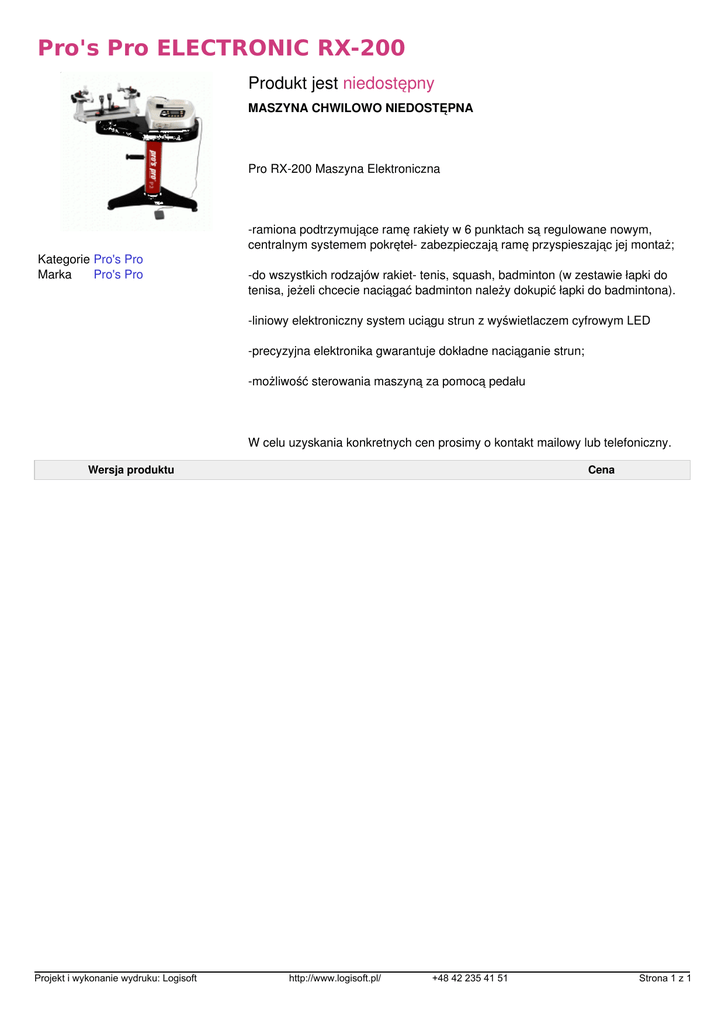 Pro's Pro ELECTRONIC RX-200 Produkt jest niedostępny MASZYNA CHWILOWO NIEDOSTĘPNA Pro RX-200 Maszyna Elektroniczna Kategorie Pro's Pro Marka Pro's Pro -ramiona podtrzymujące ramę rakiety w 6 punktach są regulowane nowym, centralnym systemem pokręteł- zabezpieczają ramę przyspieszając jej montaż; -do wszystkich rodzajów rakiet- tenis, squash, badminton (w zestawie łapki do tenisa, jeżeli chcecie naciągać badminton należy dokupić łapki do badmintona). -liniowy elektroniczny system uciągu strun z wyświetlaczem cyfrowym LED -precyzyjna elektronika gwarantuje dokładne naciąganie strun; -możliwość sterowania maszyną za pomocą pedału W celu uzyskania konkretnych cen prosimy o kontakt mailowy lub telefoniczny. Wersja produktu Projekt i wykonanie wydruku: Logisoft Powered by TCPDF (www.tcpdf.org) Cena http://www.logisoft.pl/ +48 42 235 41 51 Strona 1 z 1