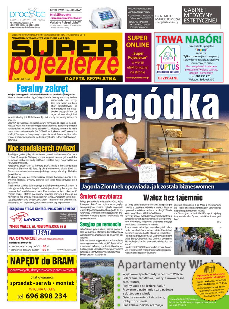 • USUWANIE OWŁOSIENIA • ODMŁADZANIE SKÓRY • USUWANIE I REDUKCJA ZMIAN NACZYNIOWYCH • LECZENIE TRĄDZIKU AKTYWNEGO I ZMIAN POTRĄDZIKOWYCH BOTOX KWAS HIALURONOWY Nici Silhouette AQUALYX - bezoperacyjny lifting twarzy LIPOLIZA FARMAKOLOGICZNA 78-600 Wałcz, Tęczowa 5-7 +48 67 250 90 18, +48 601 210 010 www.proeste.eu, [email protected] Variable Pulsed LightTM - dowiedziona skuteczność w leczeniu niedoskonałości skóry Weekendowe wydanie „Pojezierza Wałeckiego”. (Nr 31) 12 sierpnia 2016 SUPER ONLINE SUPER Największe wydawnictwo w powiecie 7500 egz. Feralny zakręt Kolejne dwa wypadki z okolicach Piecnika na drodze krajowej nr 10. W ostatni weekend w ciągu 24 godzin dachowały na zakręcie dwa samochody. Na szczęście tym razem nie było ofiar śmiertelnych. W komentarzach na Facebooku wyczytaliśmy, że tego odcinka drogi bali się mieszkańcy już 40 lat temu. Był już wtedy nazywany zakrętem śmierci. GDDKiA potwierdza, że zaplanowany remont odbędzie się najpóźniej we wrześniu. Na odcinku jednego kilometra zostanie położona nawierzchnia o zwiększonej szorstkości. Niestety, nie ma na razie szans na ustawienie radarów. GDDKiA wnioskował do Krajowej Inspekcji Transportu Drogowego o pomiar odcinkowy, czyli o ustawienie 2 radarów i pomiar średniej prędkości. Odpowiedź była negatywna. Przedszkole Specjalne ”Tuptuś” „Super Pojezierze” w wersji elektronicznej na stronie GAZETA BEZPŁATNA ISBN 1426-4366 TRWA NABÓR! www.pojezierze.com.pl BEZPŁATNE zaprasza. Tylko u nas: najlepsi terapeuci, sprawdzone terapie, szczęśliwe i uśmiechnięte dzieci. Masz wątpliwości związane z rozwojem Twojego dziecka, przyjdź - pomożemy. tel. 883 233 223, Wałcz, ul. Bydgoska 50 Jagódka Noc spadających gwiazd Spadające gwiazdy będzie można w tym roku obserwować w nocy z 12 na 13 sierpnia. Najlepiej wybrać się poza miasto, gdzie widoku ciemnego nieba nie będą zakłócać świetlne łuny. Na przykład na Półwysep Strączno. Perseidy są pozostałością komety Swifta-Tuttle'a, która przelatuje w okolicy Ziemi co 133 lata. Są obserwowane od około 2000 lat. Pierwsze wzmianki o obserwacjach tego roju pochodzą z Dalekiego Wschodu. W ubiegłym roku prezentowaliśmy zdjęcia Romana Lizonia z zaćmienia księżyca. Byliśmy ciekawi, czy także teraz przyczai się z aparatem. Trzeba mieć bardzo dobry sprzęt, z obiektywem szerokokątnym i z dobrą jasnością, aby uchwycić przelatującą iskierkę. Poza tym, niebo musi być krystalicznie czyste. Próbowałem w tym roku zrobić zdjęcie zorzy. Latałem po okolicy, szukając miejsca, z którego na horyzoncie nie byłoby widać żadnych lamp. Znalazłem takie miejsce, siedziałem kilka godzin, zmarzłem i - niestety - nie udało mi się. Meteory to jest wyzwanie, jeszcze nie wiem, czy je podejmę. OKRĘGOWA STACJA KONTROLI POJAZDÓW ŁAWECCY Godziny otwarcia: pn. - pt. 7.00 - 20.00 sobota: 8.00 - 15.00 tel. 673 070 446 78-600 WAŁCZ, ul. NOWOMIEJSKA 24 A RABATY NA OTWARCIE! -20% od cen konkurencji Badanie samochód: • osobowy ciężarowy do 3,5t. - 80 zł www.laweccy.pl • samochód zasilany gazem - 130 zł NAPĘDY do BRAM garażowych, skrzydłowych, przesuwnych 5 lat gwarancji sprzedaż • serwis • montaż WYCENA GRATIS tel. 696 898 234 Jagoda Ziombek opowiada, jak została bizneswomen Śmierć grzybiarza Policja poszukiwała mieszkańca Orla, który 4 sierpnia około 5 rano wybrał się na grzyby. Zaniepokojona rodzina zgłosiła zaginięcie jeszcze tego samego dnia około godz. 13-tej. Ratownicy w drugim dniu poszukiwań znaleźli ciało. Przyczyny zgonu i okoliczności nie są na razie znane. Sesyjna po remoncie Zakończono przebudowę części pomieszczeń w budynku Starostwa Powiatowego w Wałczu przy ul. Dąbrowskiego 17, w tym sali sesyjnej. Sala ma zostać wyposażona w kompletny system głosowania i debat „HD System Plus” z modułem cyfrowej rejestracji dźwięku, wizualizacji oraz kartą zbliżeniową i czytnikiem autoryzacji identyfikującymi użytkownika. Będzie prawie jak w Sejmie! Wałcz bez tajemnic W środę odbył się szósty i ostatni już spacer po mieście z Leszkiem Jóźwikiem. Wałecki historyk oprowadzał całkiem za darmo z okazji 20-lecia Wałeckiego Klubu Miłośników Miasta. Pierwszy spacer był śladami początków Wałcza, a tematy kolejnych to: Nowe Miasto, które powstało w XVII wieku, świątynie i cmentarze, tradycje wojska oraz szkolnictwo w mieście. Z zaproszenia za każdym razem korzystało kilkunastu mieszkańców w różnym wieku. Kto nie był, powinien żałować. Bo kto z Państwa wiedział, że: - kompleks budynków na ul. Dąbrowskiego (tam gdzie Biorol, Obiadek i Straż Gminna) powstał w 1858 roku jako kaplica ewangelicka i siedziba pastora? - na terenie PCKZiU (zawodówka) przy ul. Bankowej w połowie XIX wieku znajdowała się ujeżdżalnia koni dla oddziałów pruskich? róg ulic Kościuszki i 1-go Maja, z mieszkaniami dla - kadry oficerskiej i fontanną był uznawany za najpiękniejszy fragment miasta? - w Gimnazjum nr 2 (ul. Marii Konopnickiej) były trzy wejścia: dla Żydów, katolików i ewangelików? M.C. Apartamenty Wieża i otwarte Wyjątkowe apartamenty w centrum Wałcza Zapraszamy na dn kazowym. po cie en m ta Połączenie zabytkowej wieży z nowoczesną w apar . 16.00-19.00 architekturą • Piątek 19.08 godz dz. 10.00-14.00 • Sobota 20.08 go Piękny widok na jezioro Raduń z działem Możliwość spotkania ntem. Prywatne garaże i miejsca garażowe kta oje sprzedaży i pr stkie zy ws na y em z dostępem z windy Odpowi ia. tan Państwa py Osiedle zamknięte i strzeżone, www.apartamentywieza.pl lobby z portiernią https://m.facebook.com/apartamentywieza Plac zabaw, boisko, rekreacja tel. 691 739 021 Horoskop Sudoku 369 (Medium) 2 8 SUDOKU 6 8 Sudoku 370 (Medium) 6 5 5 7 Krzyżówka 8 1 4 Baran: To świetny okres, by odnowić stare przy4 2 9 jaźnie i nawiązać nowe znajomości. Już wkrótce 2 8 6 5 4 85 7 3 1 5 9 4 przekonas